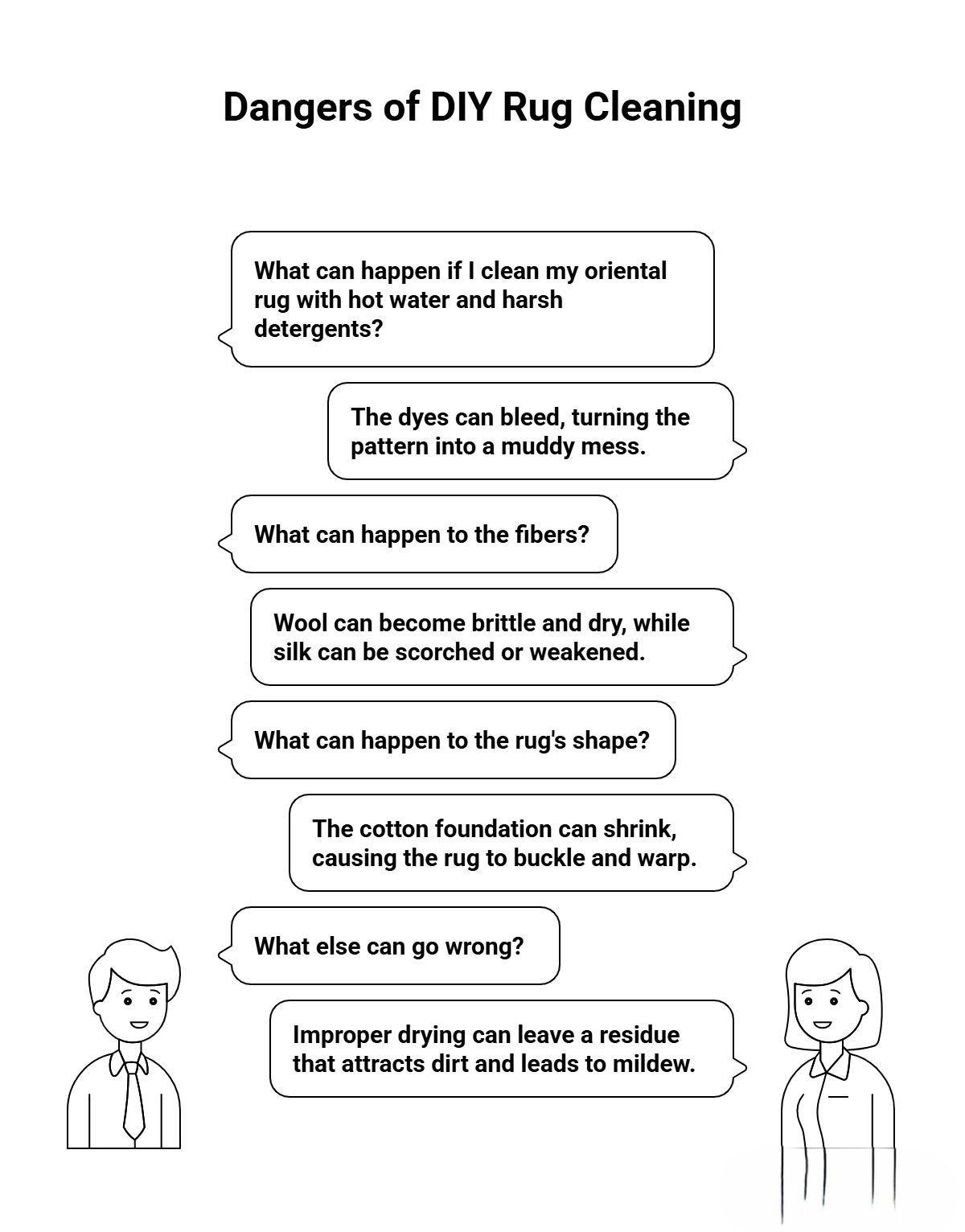 - Color Bleed: The hot water and harsh detergents can cause the rich, natural dyes in an oriental rug to bleed, turning your crisp pattern into a muddy, faded mess.