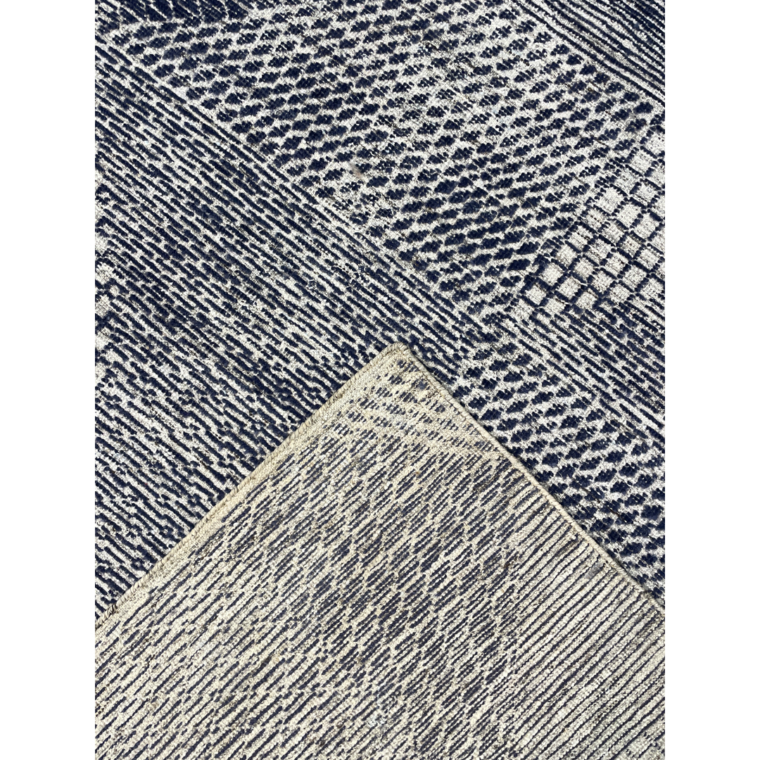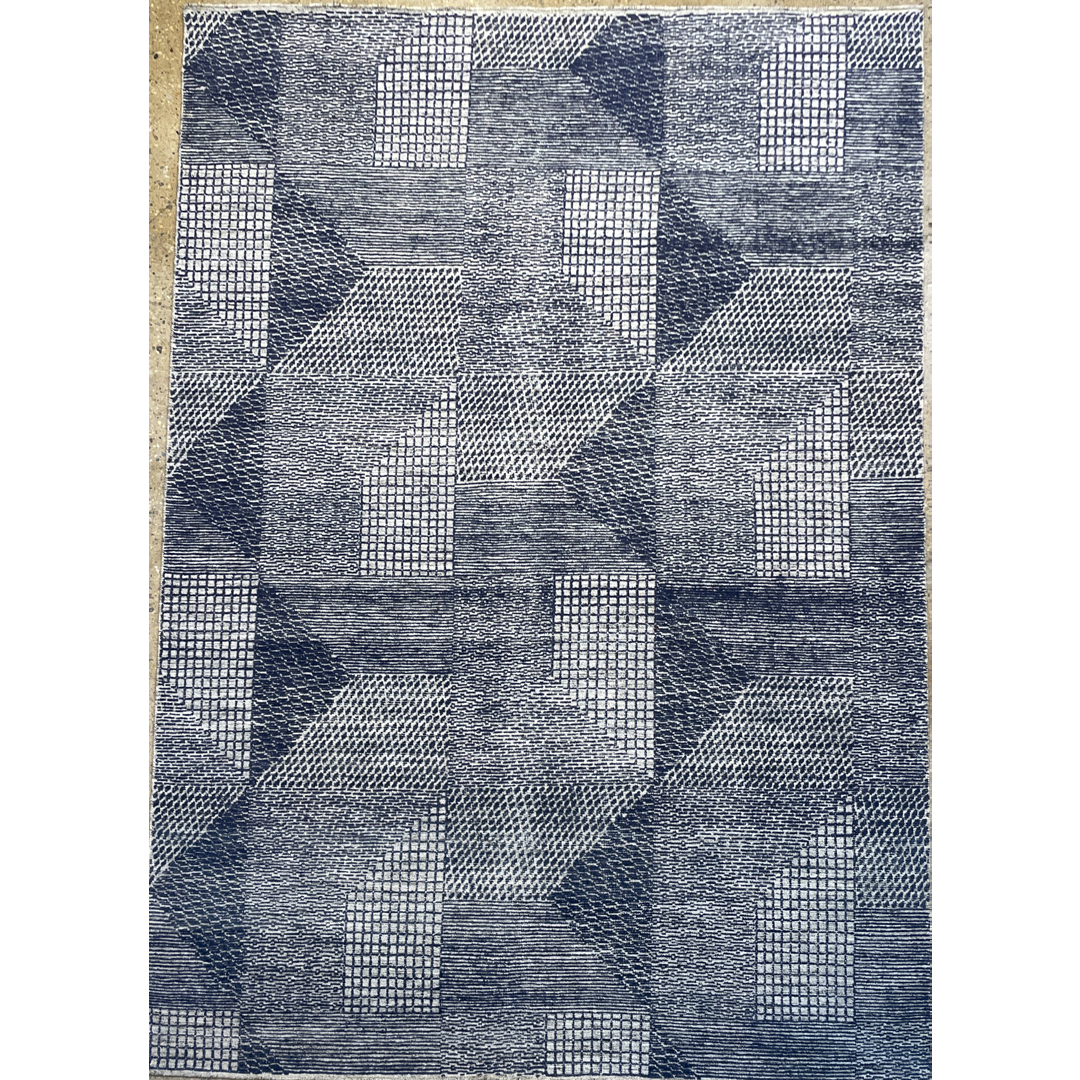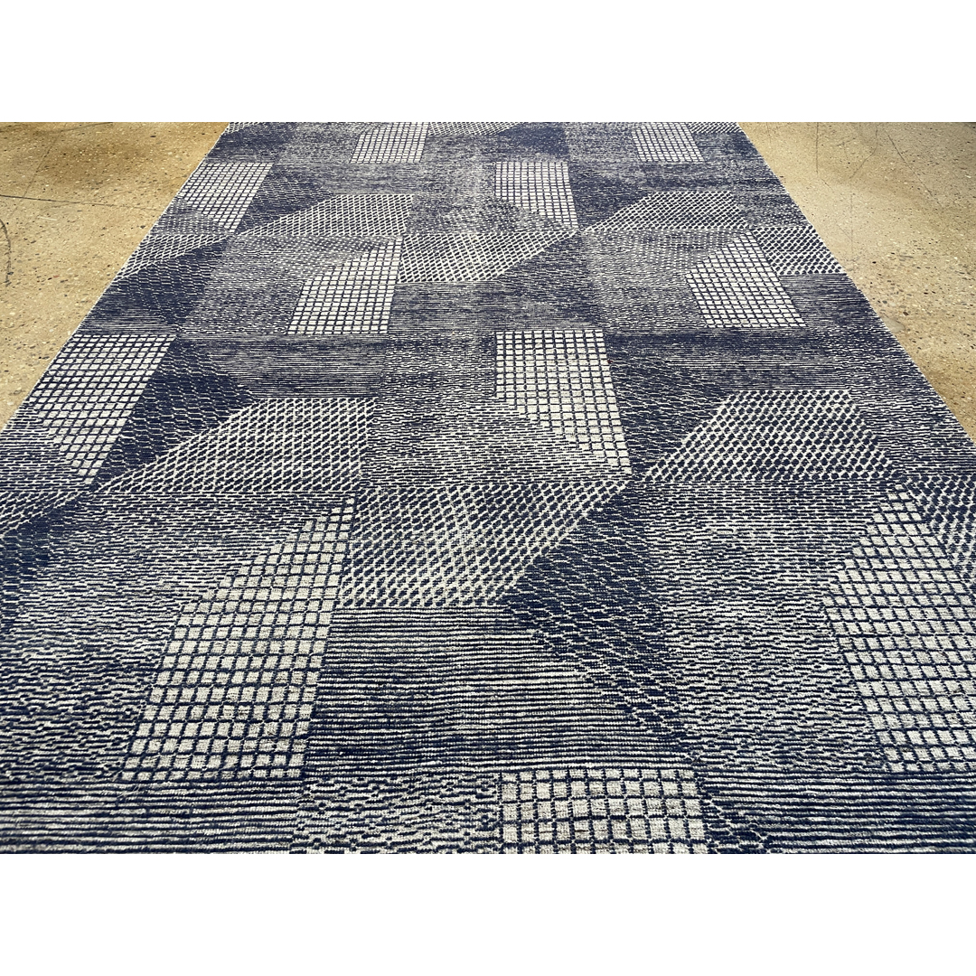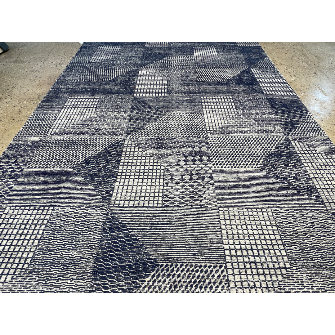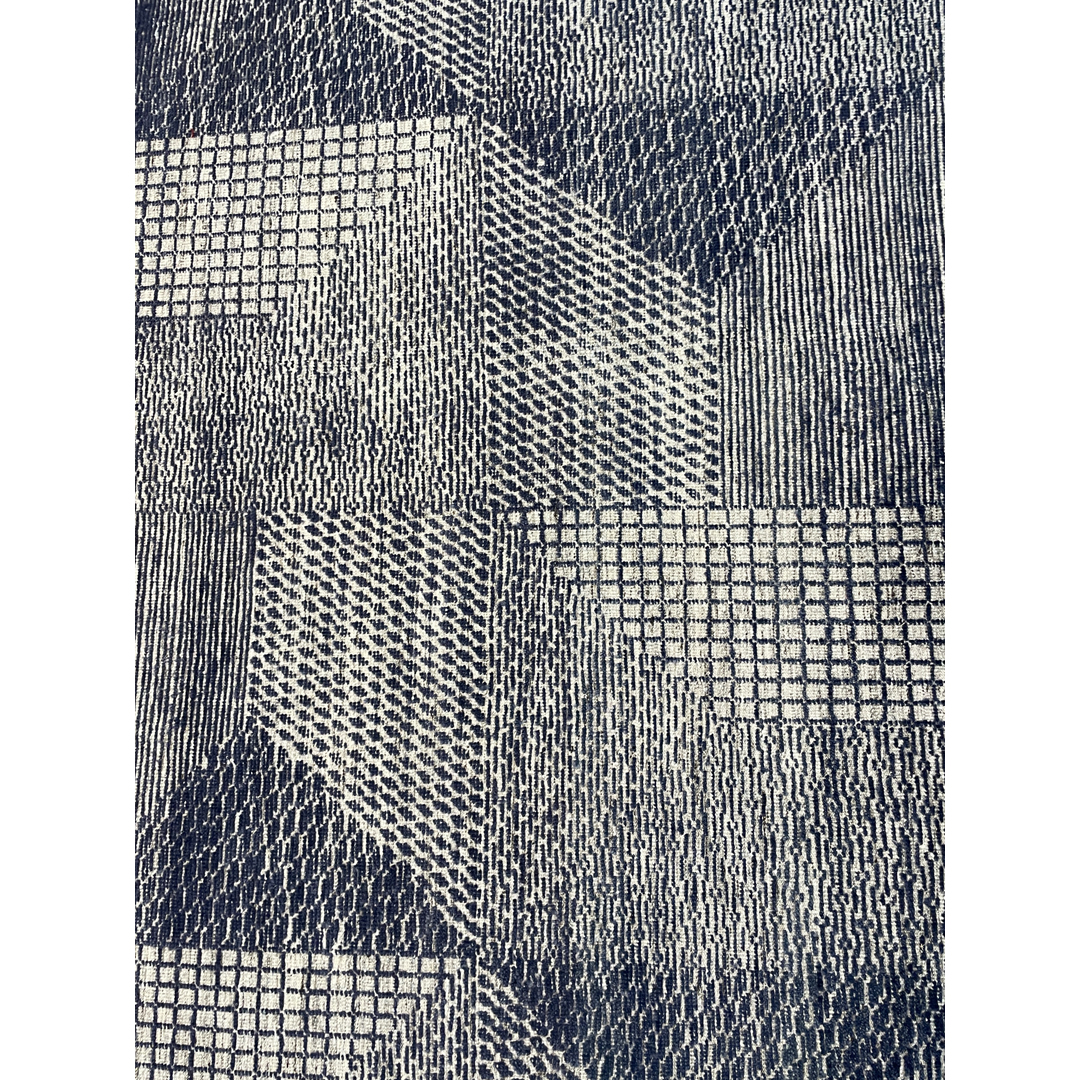 This striking hand-knotted rug from India presents a beautiful take on optical design and architectural geometry. The expansive, borderless field is composed of large-scale interlocking shapes—bold triangles, sweeping diagonals, and sharp right angles—that create a dynamic, puzzle-like composition. What elevates the design are the intricate micro-patterns filling each geometric block; the rug juxtaposes fine square grids, linear striations, and dotted hatching to create incredible visual depth. Rendered in a sharp, high-contrast palette of deep navy blue and crisp ivory, the piece has a tailored, graphic energy. The true standout feature of this rug is its textural high-low pile. This dimensional weaving technique physically raises the navy and ivory patterns at different heights, providing a tactile, 3D surface that emphasizes the crisp lines of the geometry. With its 8’2″ x 11’6″ ft. dimensions, this piece is an exceptional foundation for a sleek modern loft, an upscale contemporary home office, or any space that demands a bold, sophisticated statement.