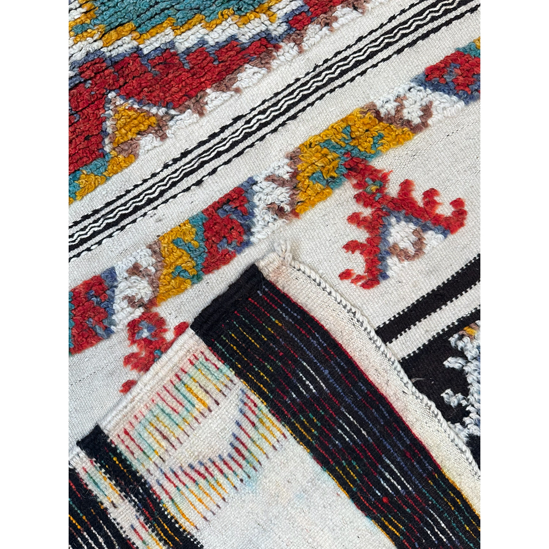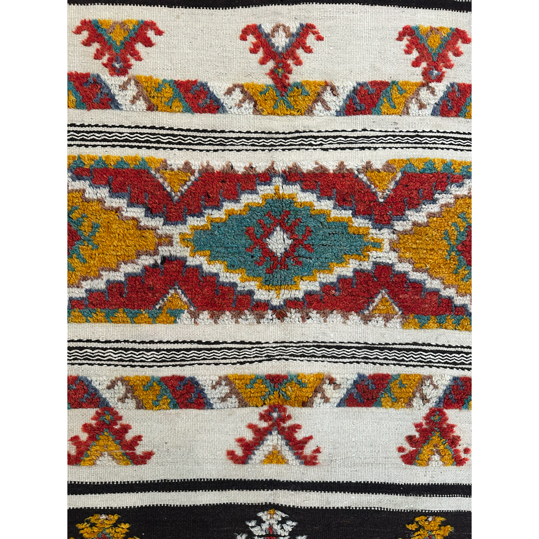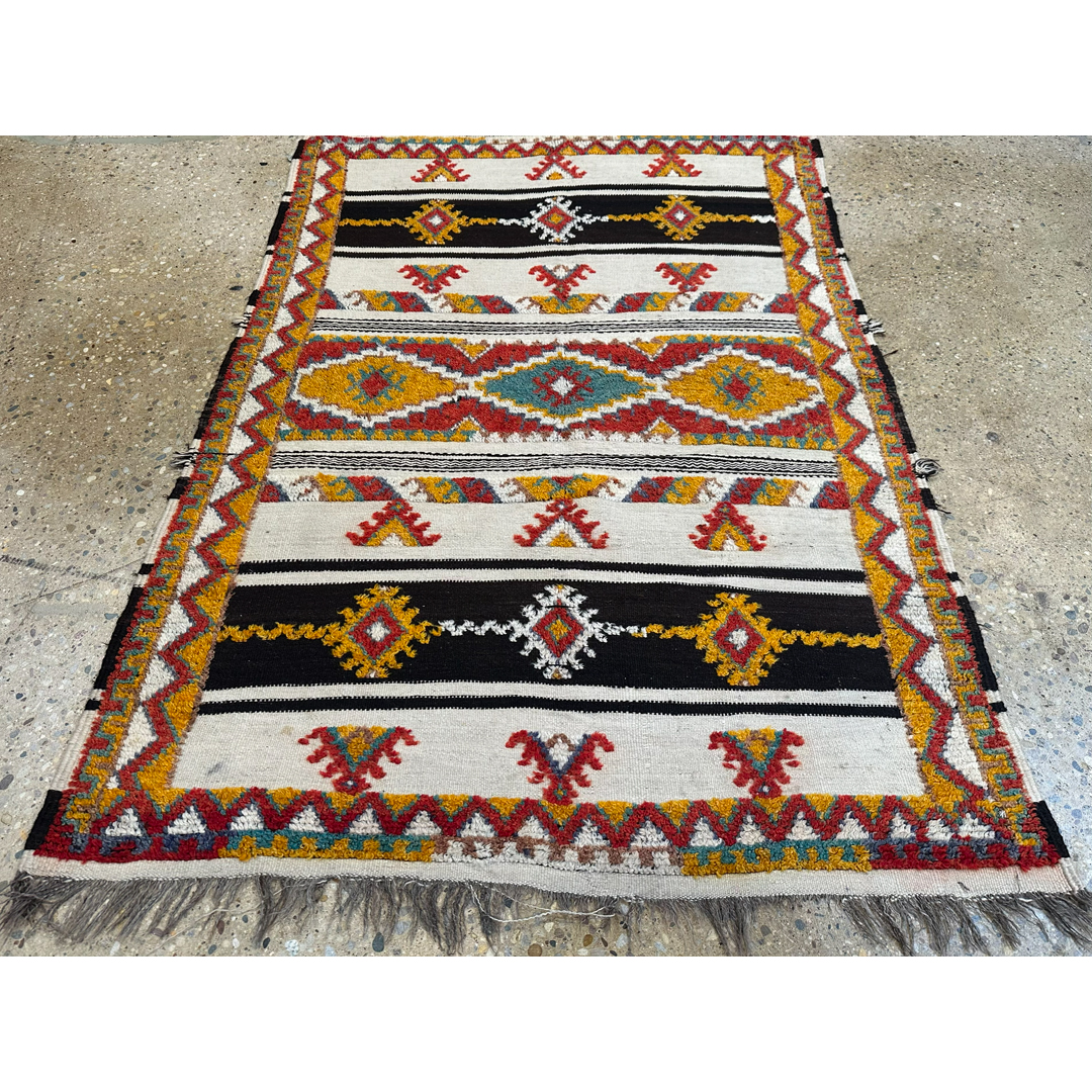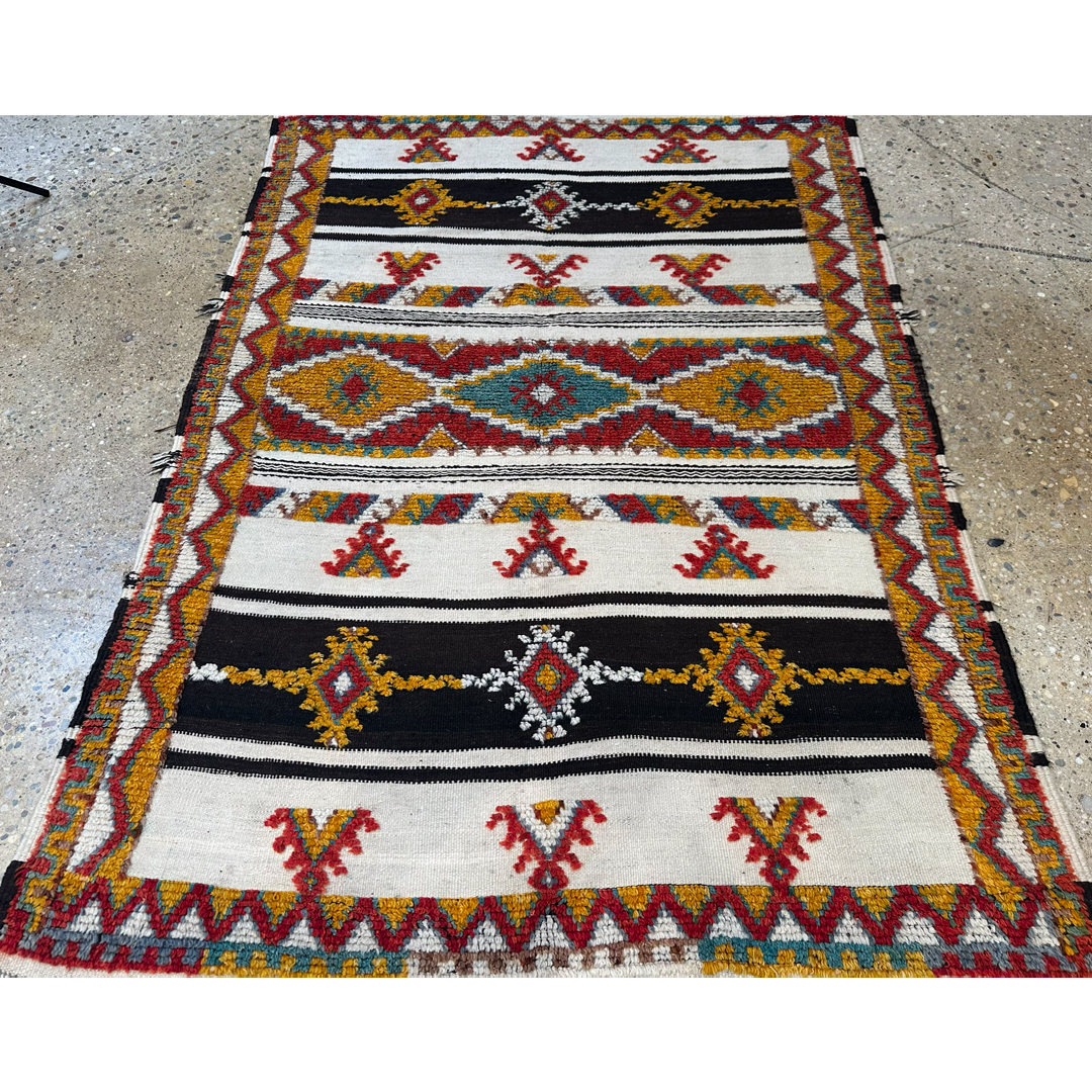 Immerse your space in the spirited energy of North African artistry with this adventurous 4’4″ x 6′ ft. antique Moroccan Azilal rug. A genuine mid-century piece from the 1940s, this hand-knotted treasure features a creamy ivory wool foundation that serves as a bright canvas for a bold, horizontal composition. The design is anchored by a striking central band of large, interconnected diamond medallions rendered in vibrant shades of mustard yellow, crimson red, and teal. Flanking this center are contrasting dark horizontal stripes containing smaller geometric gems, while playful tribal motifs and triangular symbols float in the open spaces. Framed by a dynamic zigzag border in warm earth tones, this eclectic and high-spirited rug is the perfect foundation for a bohemian living room, nursery, or creative studio.