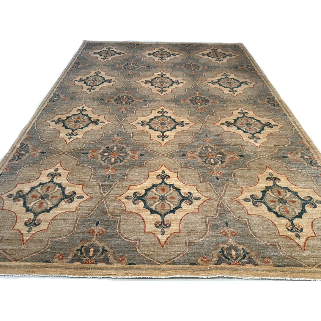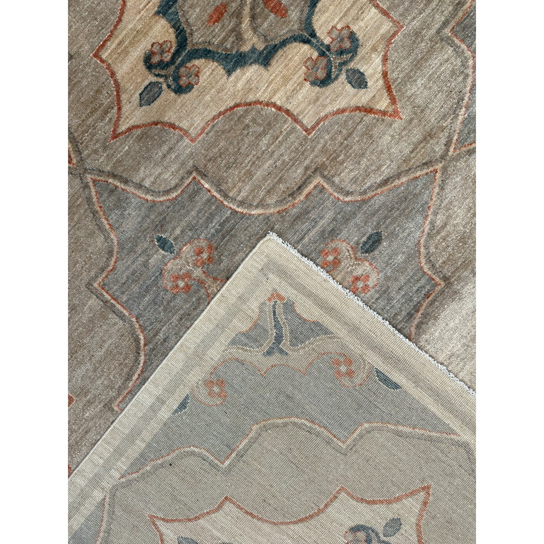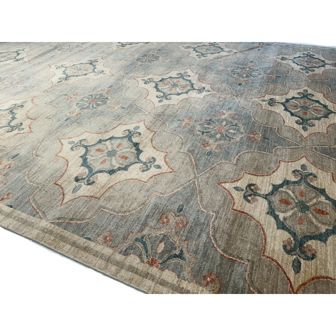 This magnificent hand-knotted Afghan Peshawar rug offers an elegant, transitional take on classic lattice designs. The expansive, all-over composition features a repeating network of large, interlocking lobed medallions. Rendered in a serene, muted palette of warm taupe, pearl gray, and soft slate blue, the geometric framework is delicately accented by stylized interior floral motifs in muted rust and crisp ivory.