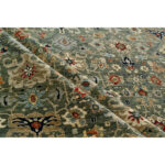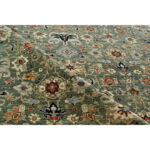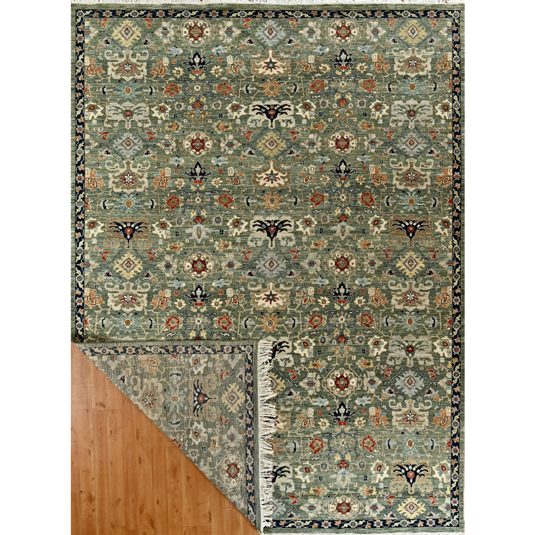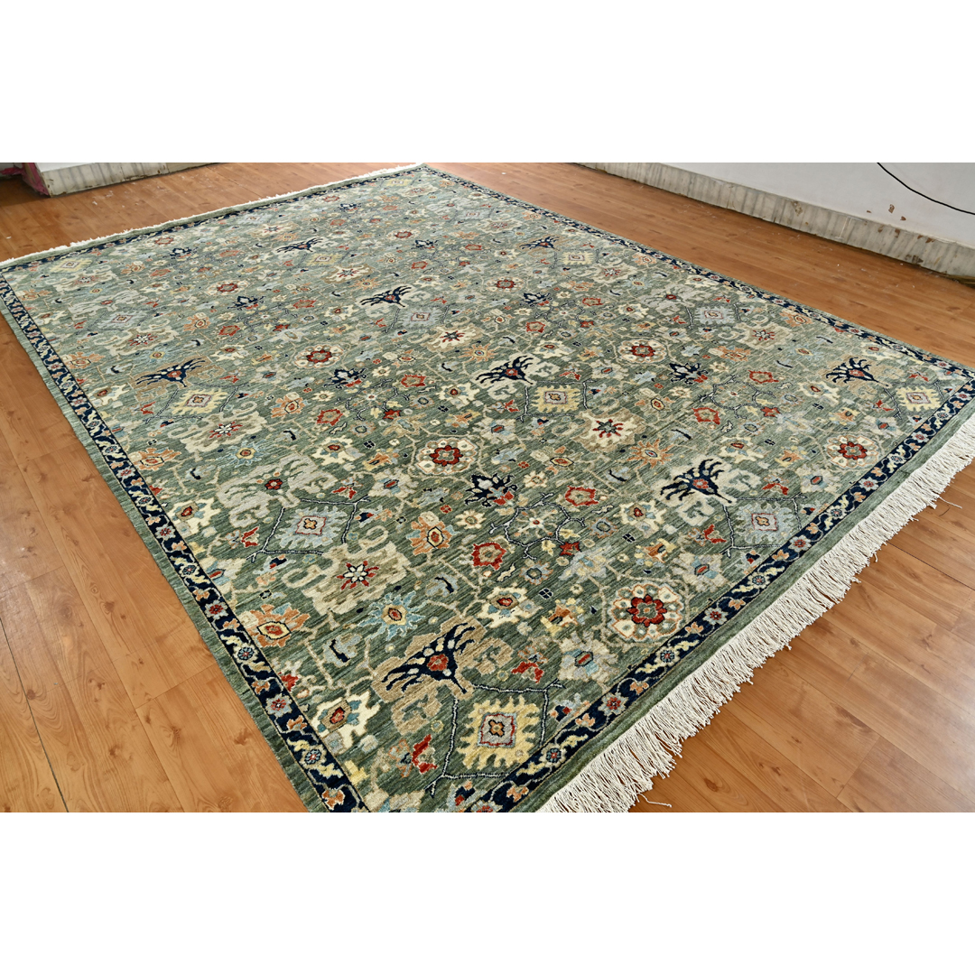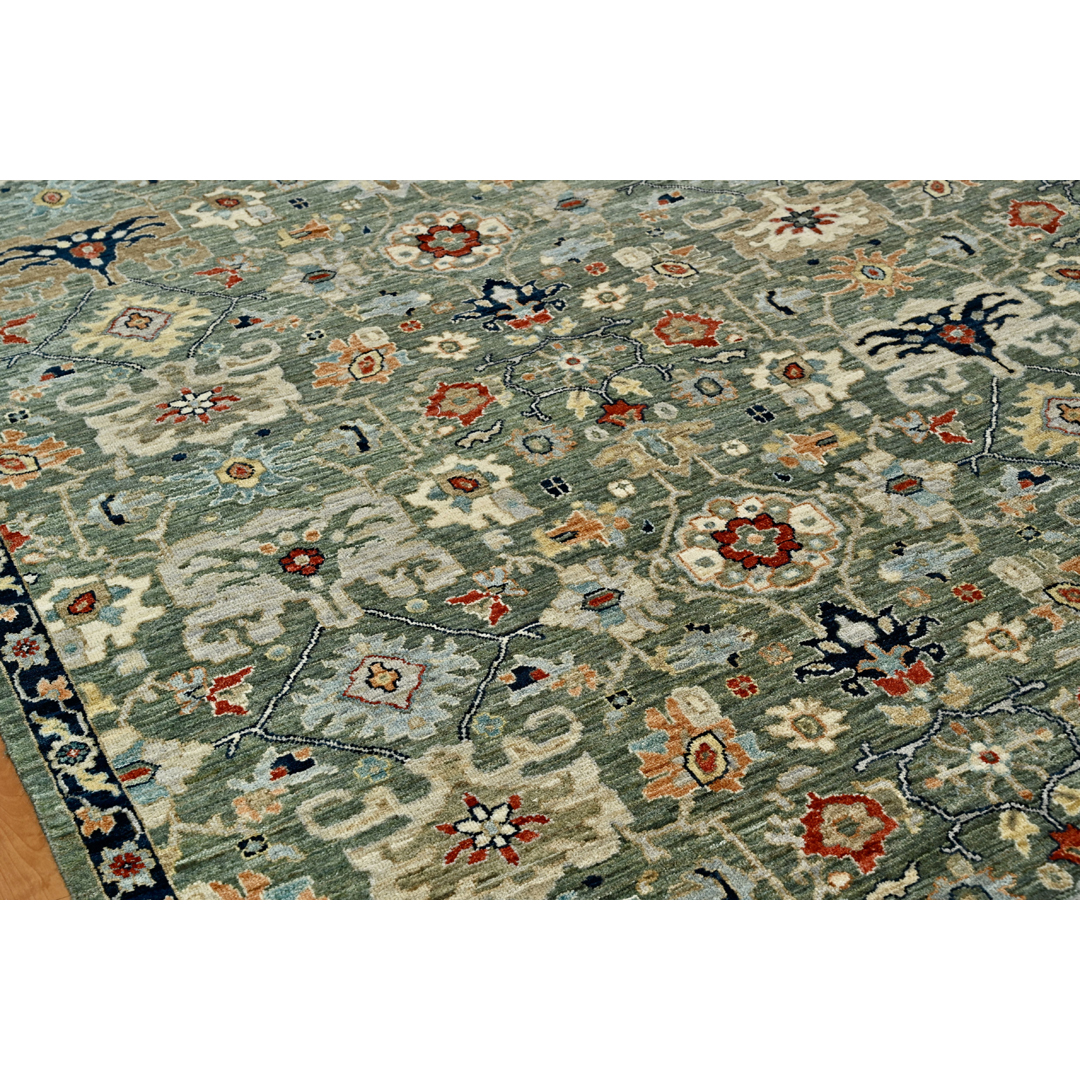 This elegant hand-knotted Indian rug offers a refined, transitional interpretation of classic Central Asian design. The all-over repeating composition features a sophisticated array of geometric palmettes, stylized botanical motifs, and intricate angular flora reminiscent of antique East Turkestan weaving. These traditional elements are woven in rich accents of rust red, warm gold, crisp ivory, and deep navy, floating beautifully across a highly textural olive green and shadow gray field. The rug is defined by a gorgeous horizontal “abrash” effect throughout the sage-toned background. This organic color variation in the dyed wool lends the piece a deeply tactile, softly aged patina that seamlessly bridges the gap between antique charm and modern sensibilities. Framed by a narrow, coordinating dark border that contains the lively pattern, this generous 9′ x 11’10” ft. carpet provides an incredibly serene and grounding foundation.