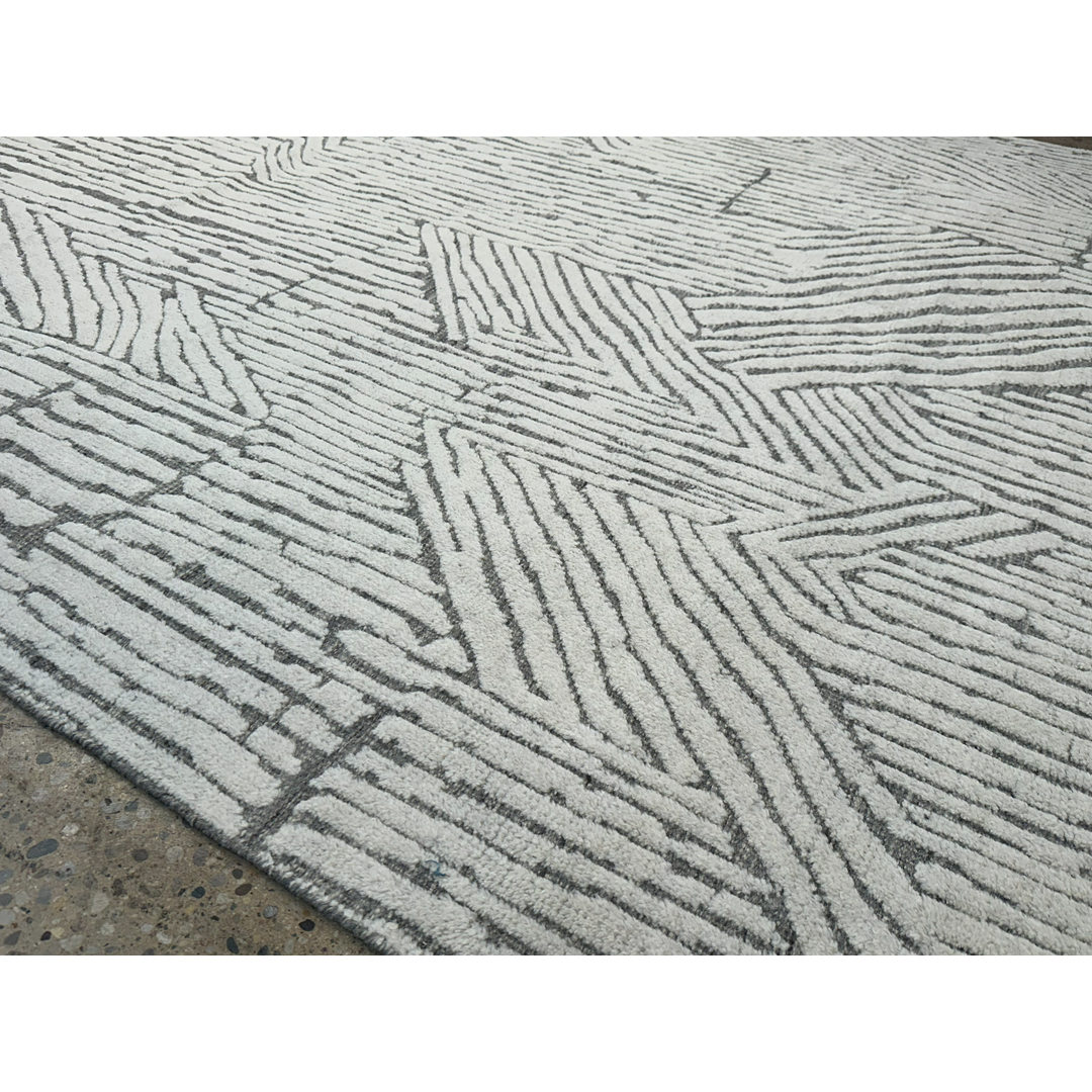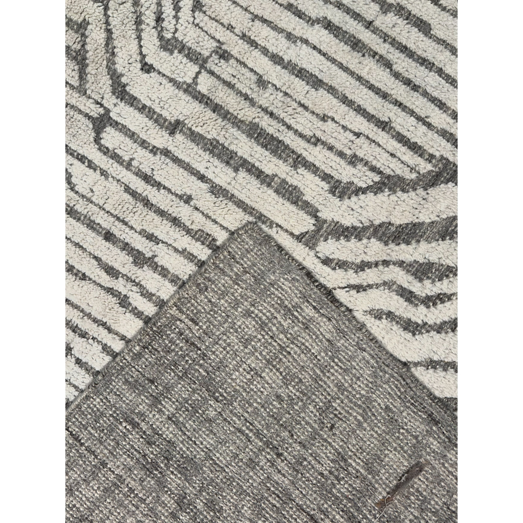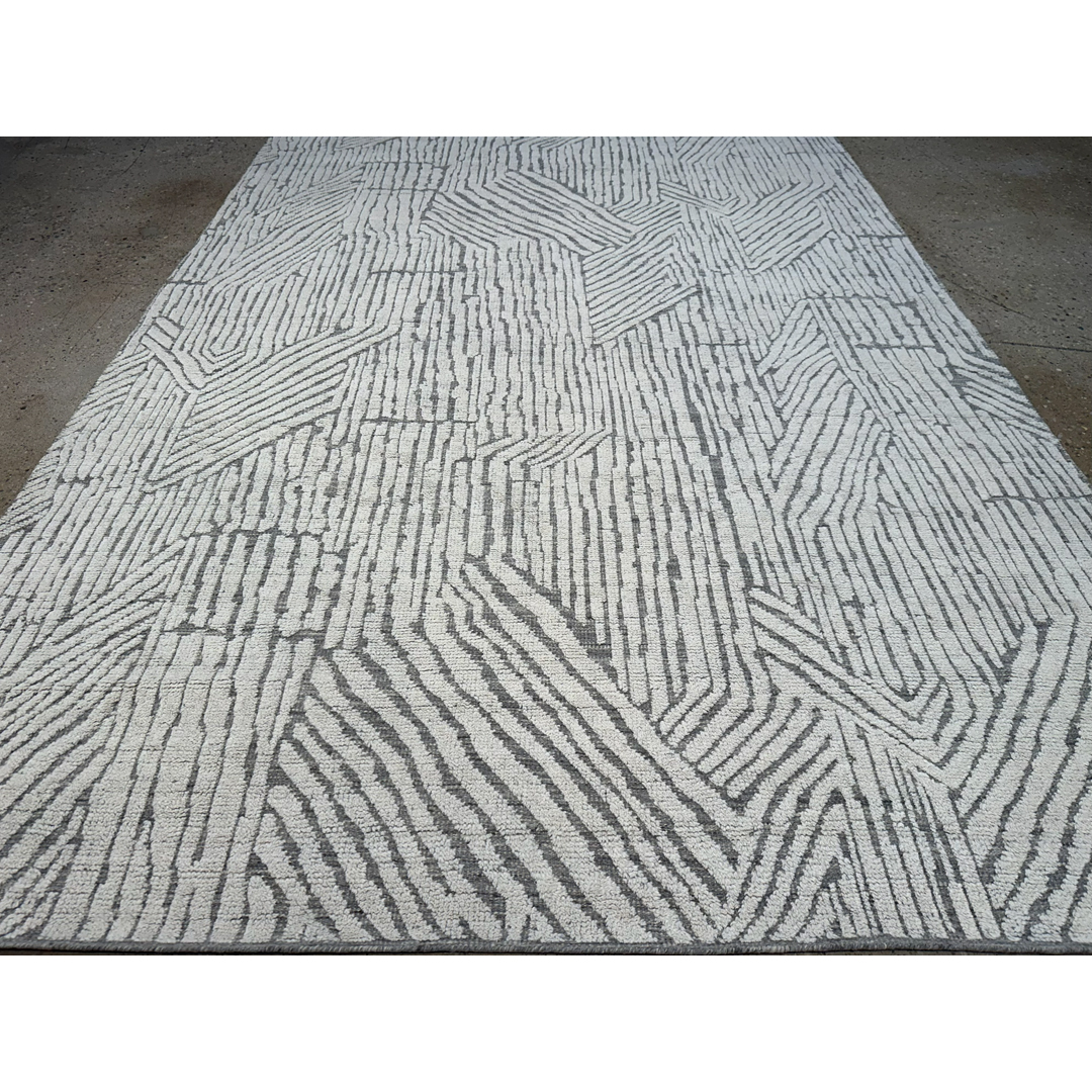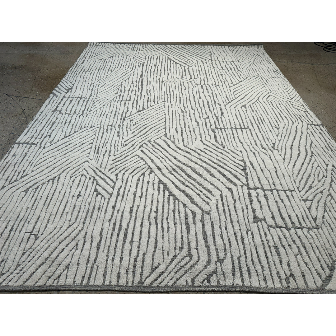 Make a bold artistic statement with this stunning modern Moroccan area rug. Measuring 8’11” x 12′ ft., this 9×12 rug features a captivating and dynamic abstract design. Its plush, creamy ivory pile is expertly carved with a network of deep gray lines, creating a high-low texture that evokes an abstract forest or a fractured geometric landscape. This rich textural contrast is not only visually striking but also feels wonderful underfoot. Perfectly suited to anchor a contemporary living room, a minimalist loft, or a creative office, this rug is a true piece of floor art, offering a powerful blend of cozy comfort and sophisticated, architectural style.