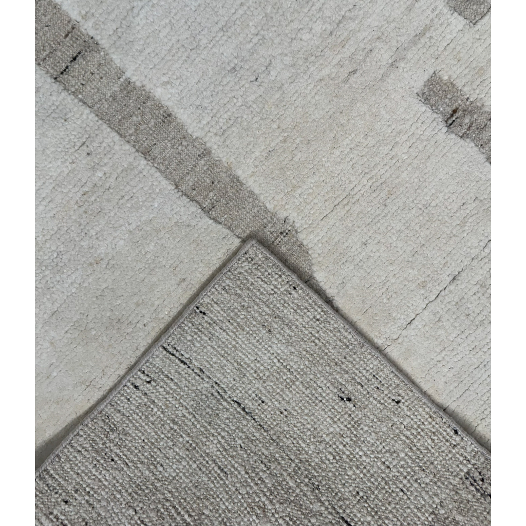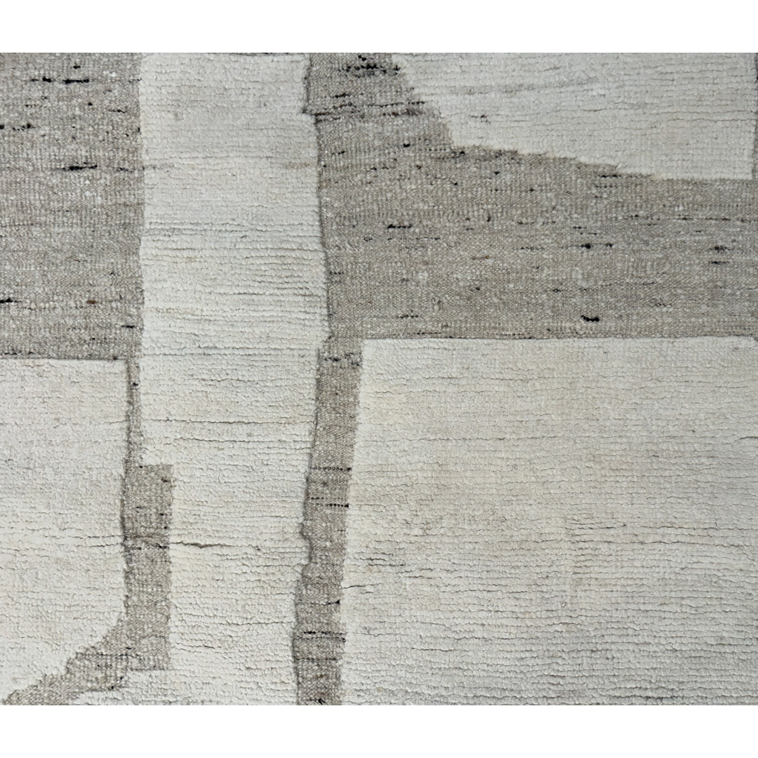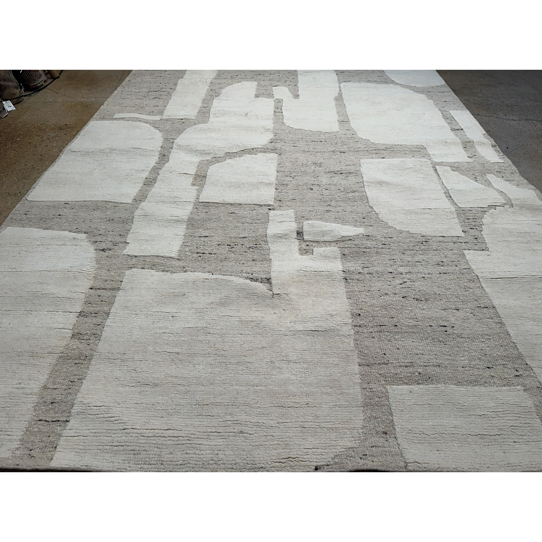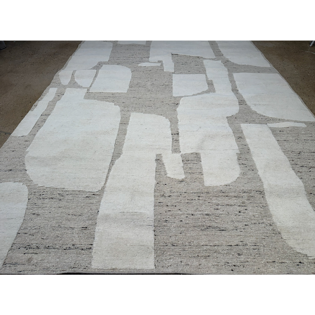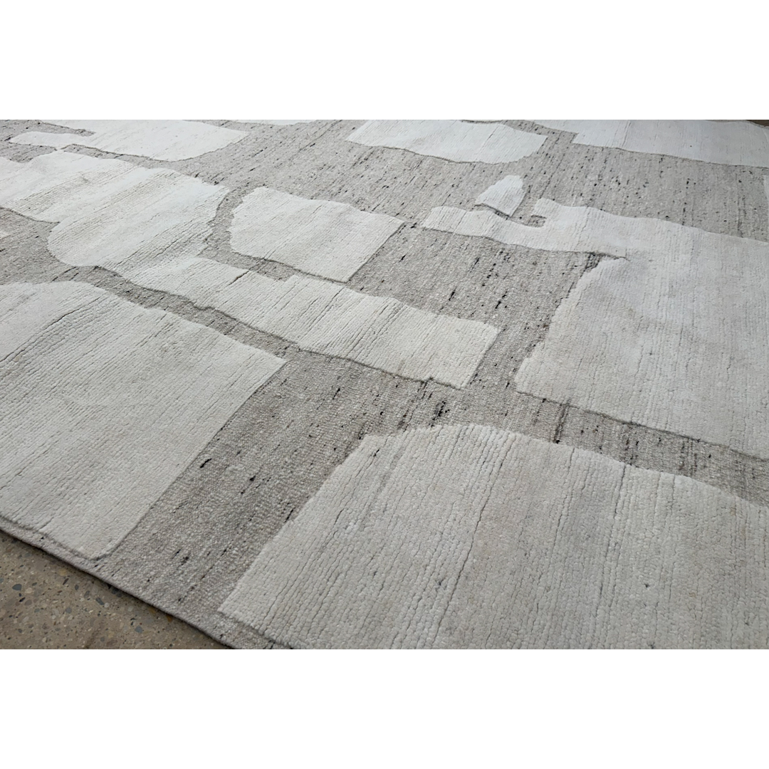 This large-scale modern Indian rug measures 10’3″ by 13’11”. The design features oversized, organic abstract shapes in crisp ivory set against a light stone-grey background. The rug utilizes a low-contrast, neutral color palette that easily integrates with contemporary interiors. The contrast of high-low textures throughout the field adds visual depth without introducing additional colors, making it a versatile option to anchor a contemporary interior and evoke the organic beauty of natural stone slabs.