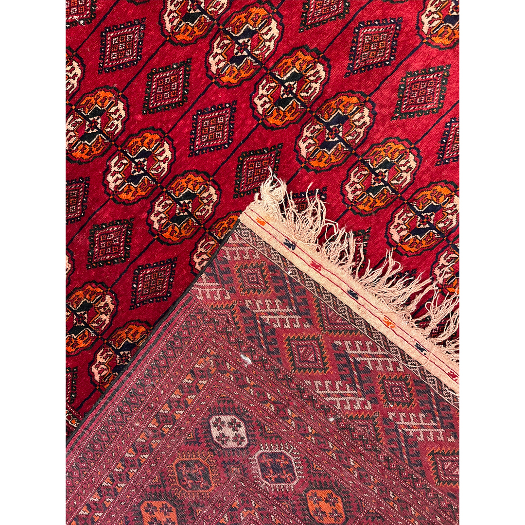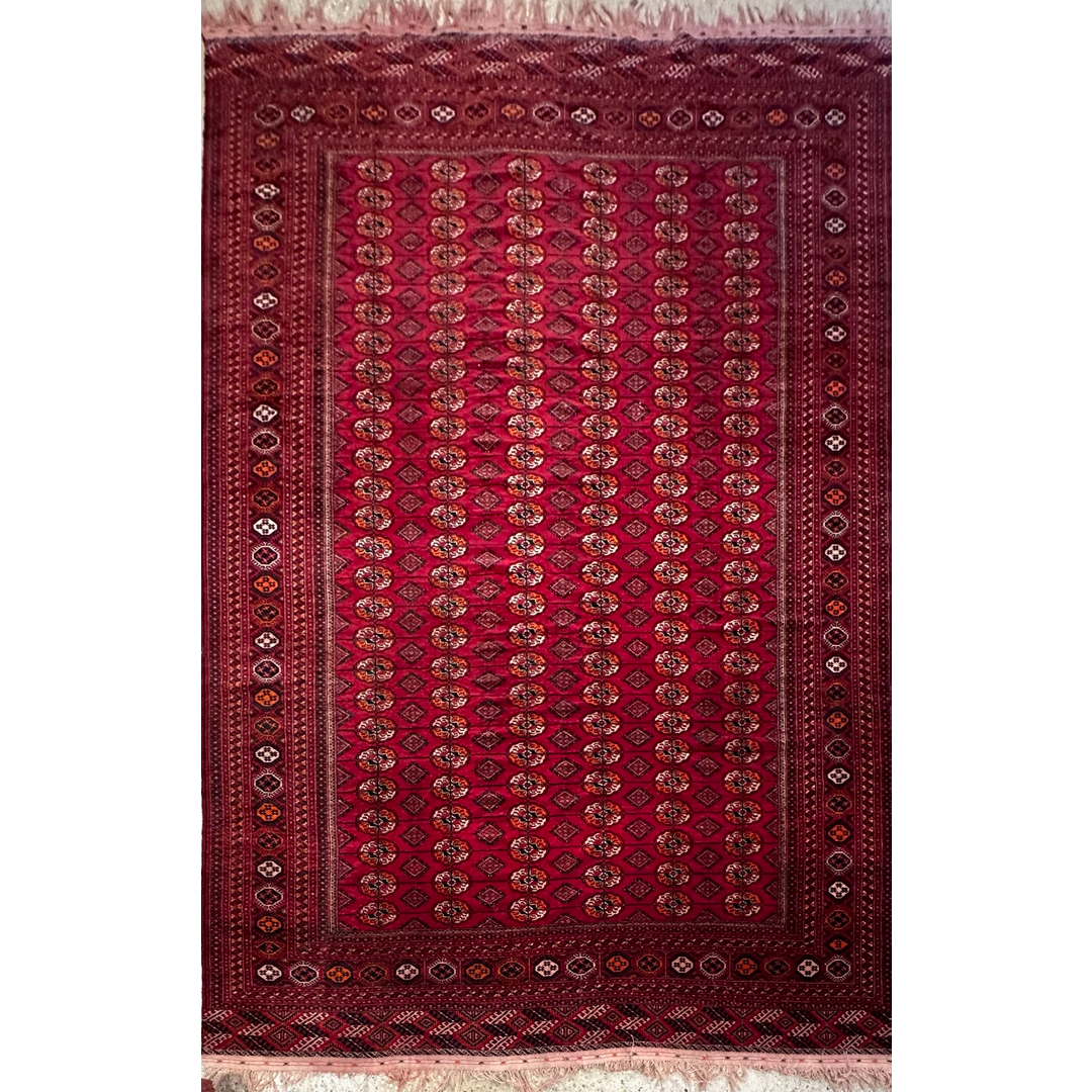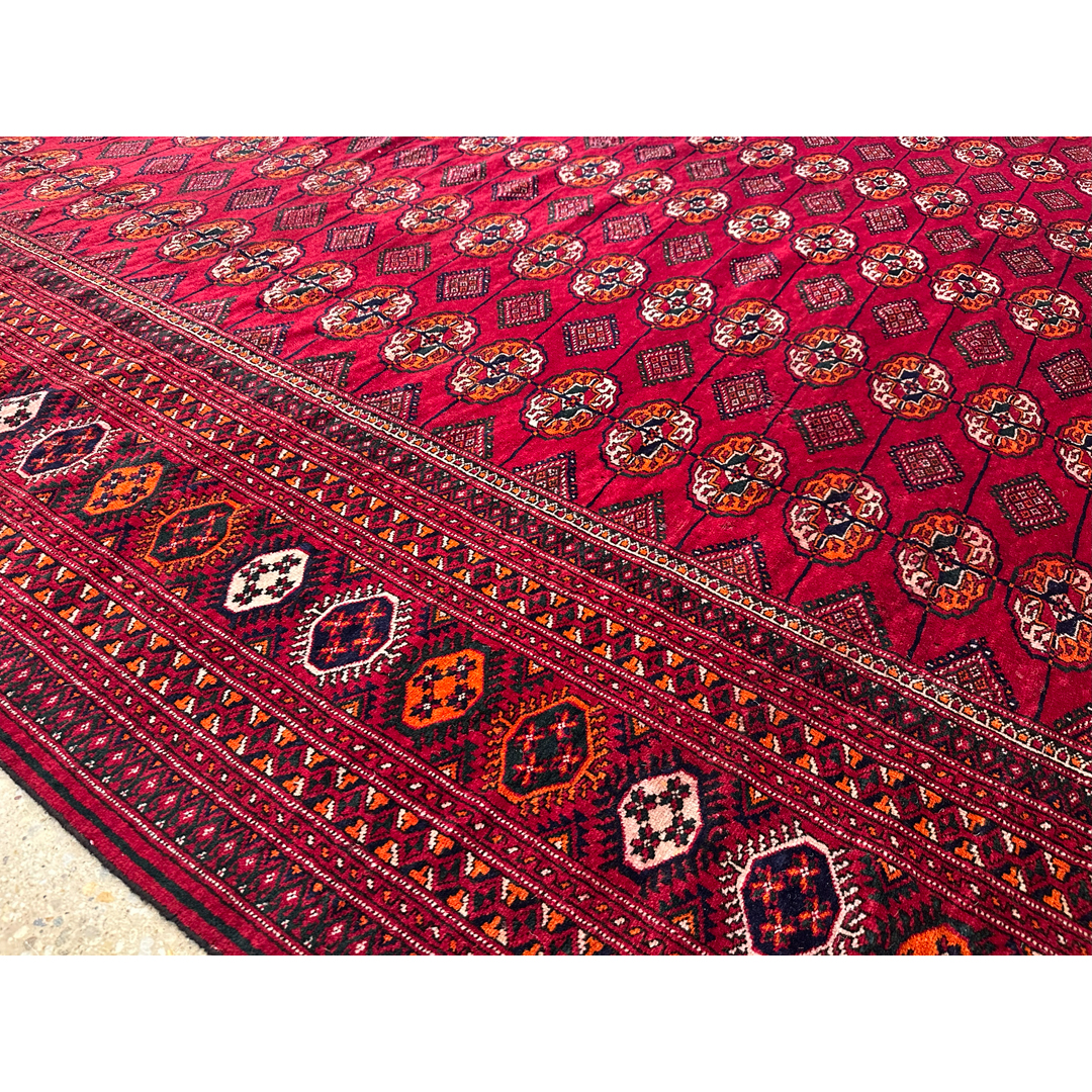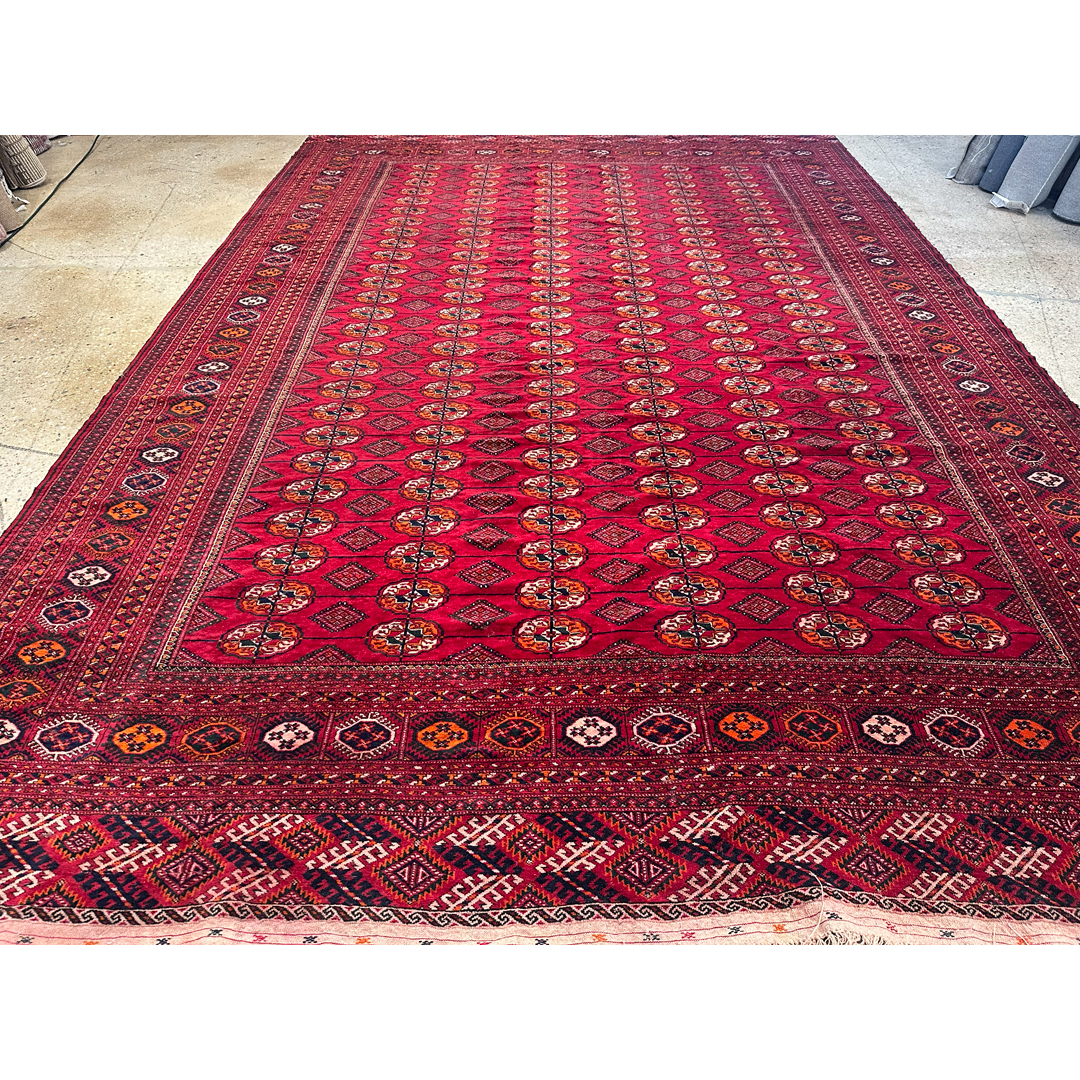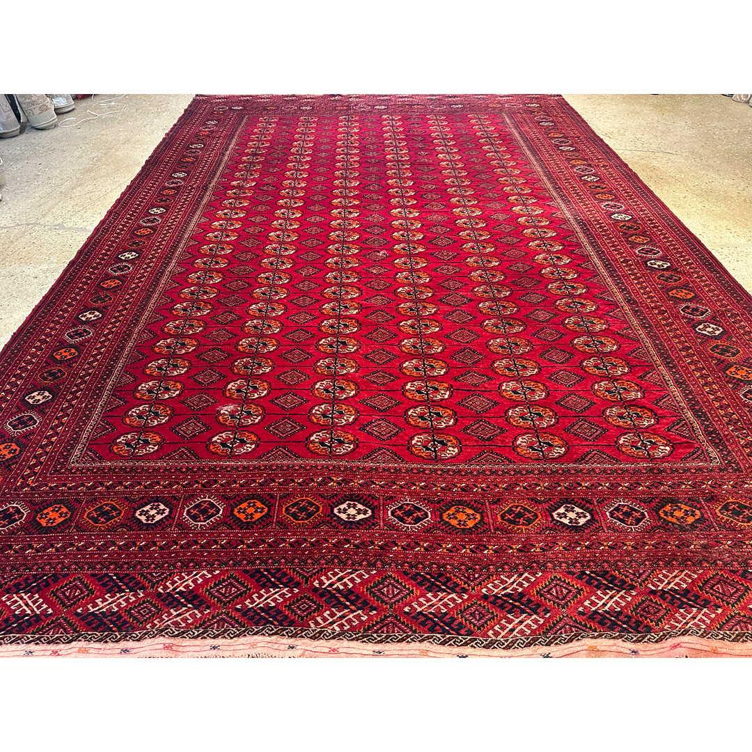 Imbue your grand living space with the rhythmic precision and rich color of this amazing 10’6″ x 15’4″ ft. antique Afghan Bokhara rug. Hand-knotted in the 1940s, this palace-sized piece features a luscious, deep ruby red field that exudes warmth and sophistication. The composition is defined by the iconic Tekke design, featuring orderly rows of repeating “guls” (tribal medallions) rendered in contrasting shades of midnight indigo, ivory, and burnt orange. Intricate geometric borders and distinctive patterned skirts at the ends frame the central lattice, adding structural elegance to the vast field. With its soft wool pile and timeless tribal aesthetic, this rug makes a magnificent foundation for a formal library, executive office, or traditional great room.