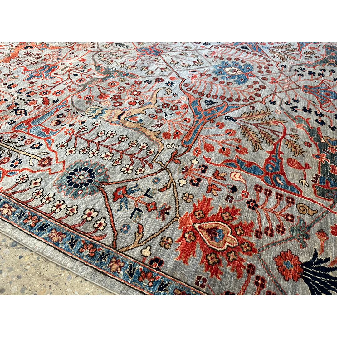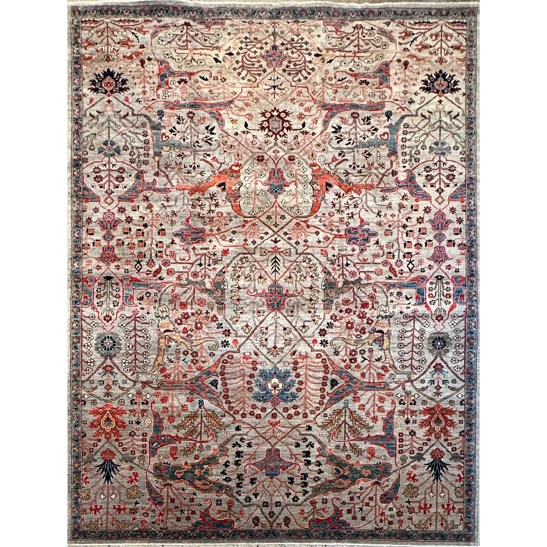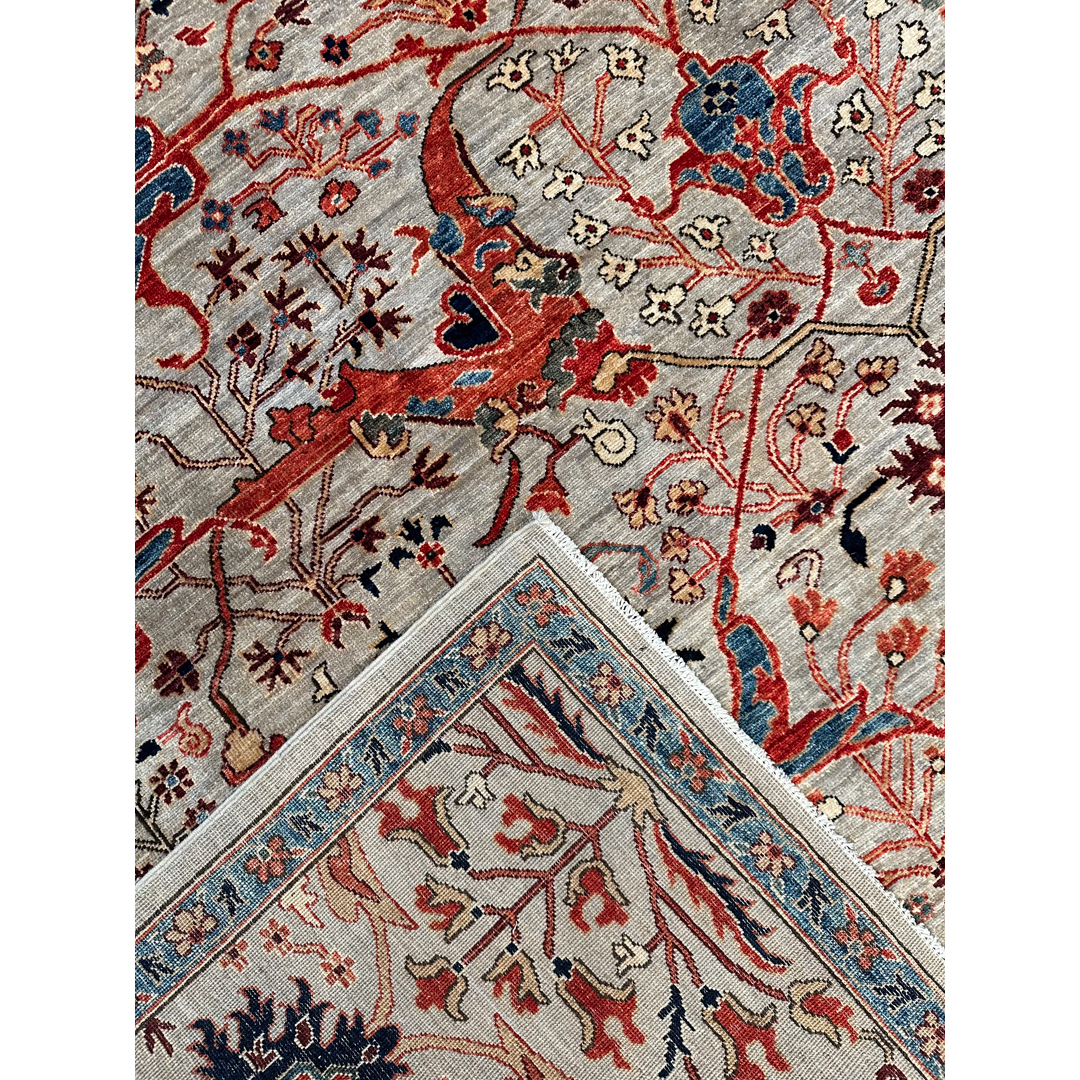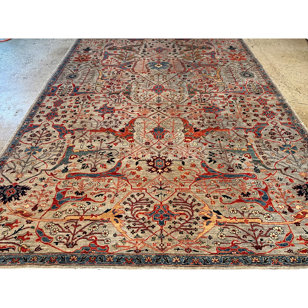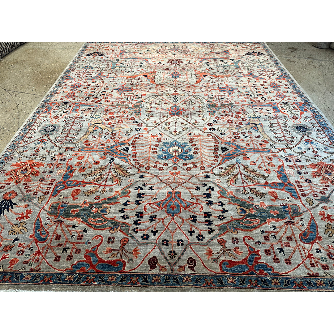 Create a bold foundation of heritage craftsmanship with this striking Garous Bidjar design rug, hand-knotted in Afghanistan. Inspired by the iconic Persian Garous tradition, the rug features a richly detailed, all-over composition of interlacing florals, palmettes, and geometric latticework, arranged with impressive symmetry and depth. The design feels intricate and expressive, offering visual movement while maintaining a strong architectural structure. A dynamic palette of warm rust, brick red, indigo, slate blue, and soft ivory is layered over a gently mottled field, giving the rug a time-honored, collected look. Woven with a fine, durable wool pile, this Afghan-made rug delivers both substance and beauty—an enduring statement piece well suited for living rooms, libraries, or formal spaces that appreciate classic design with bold character.