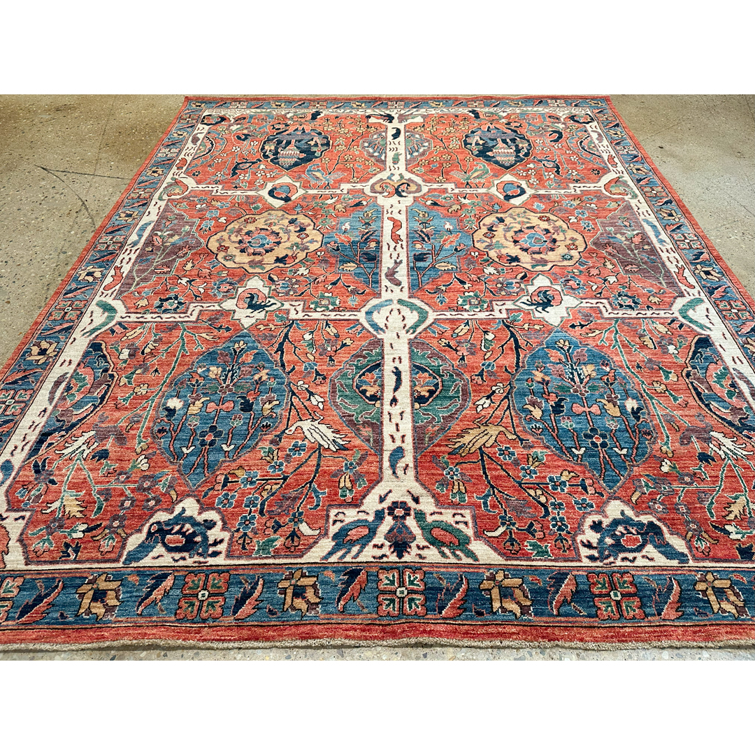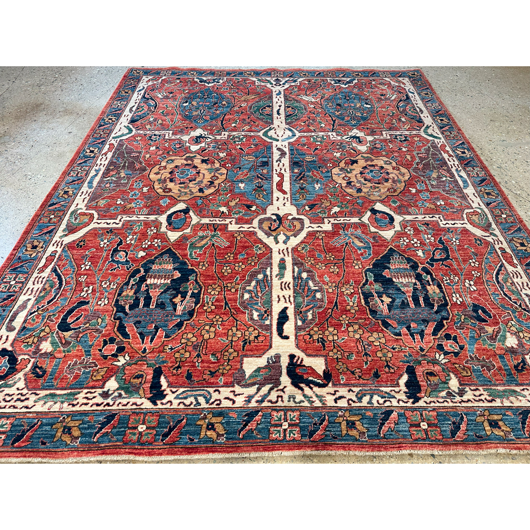 This captivating hand-knotted Afghan rug features a classical “Garden” (or Chahar Bagh) design, a historic layout meant to represent the structured beauty of a traditional Persian paradise garden. The composition is divided into distinct quadrants by a prominent, ivory-ground cruciform lattice, which symbolizes the intersecting water channels of the garden. Within the rich terracotta and madder-red field, striking indigo compartments are densely woven with narrative tribal motifs, including weeping willows, stylized cypress trees, blossoming flora, and pairs of nesting birds. Woven with high-quality wool, the rug displays a vibrant palette accented with teal, antique gold, and soft sage. The robust pile and beautifully abrash-textured colors lend a sense of heirloom authenticity and organic movement to the highly structured pattern. Framed by a classic indigo botanical border, its 8′ x 9’9″ ft. dimensions and rich storytelling elements make it an extraordinary statement piece. It is perfectly suited to anchor a formal dining room, bring historic depth to a stately home library, or serve as a conversation-starting centerpiece.