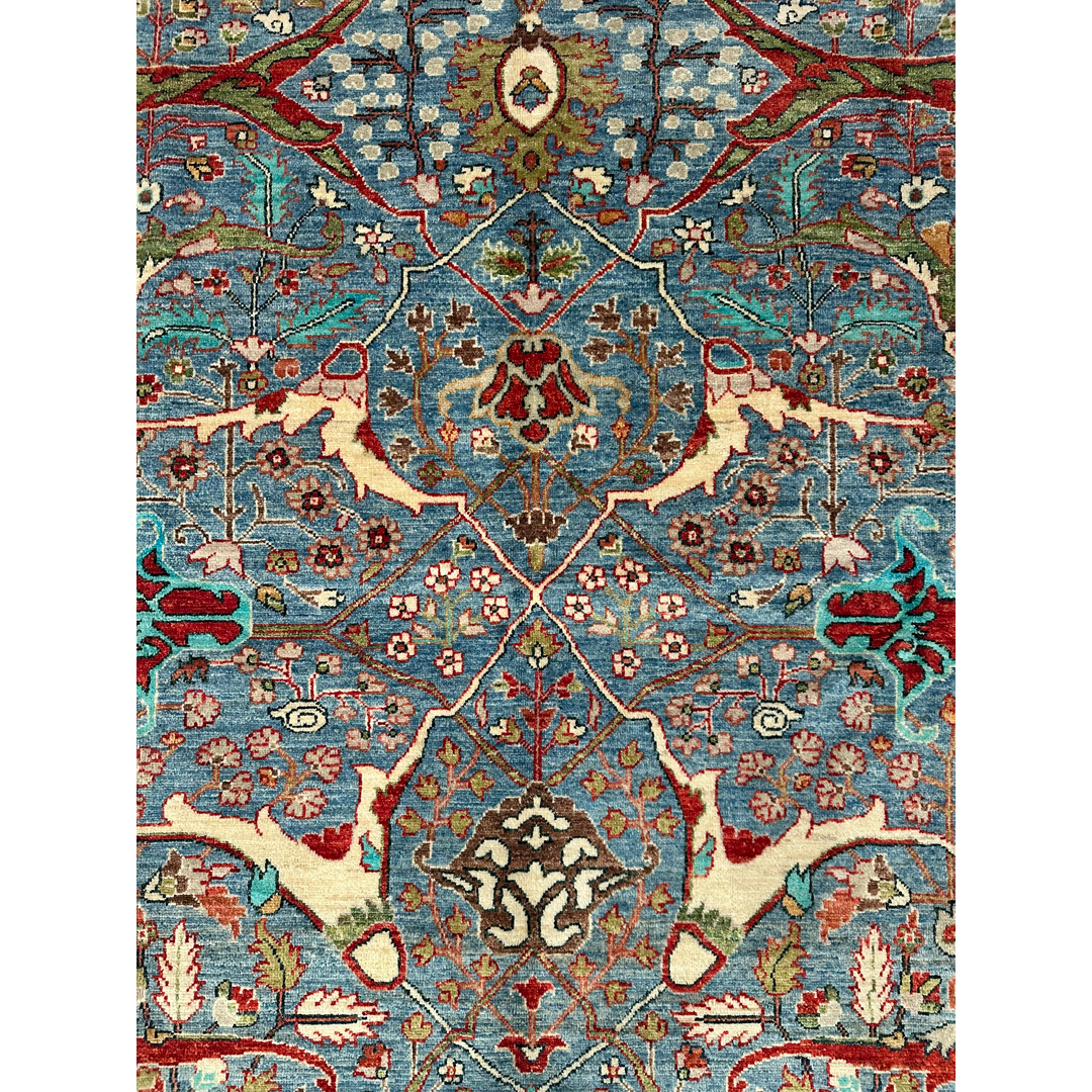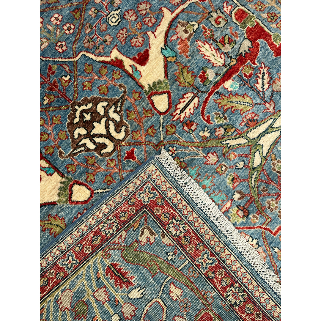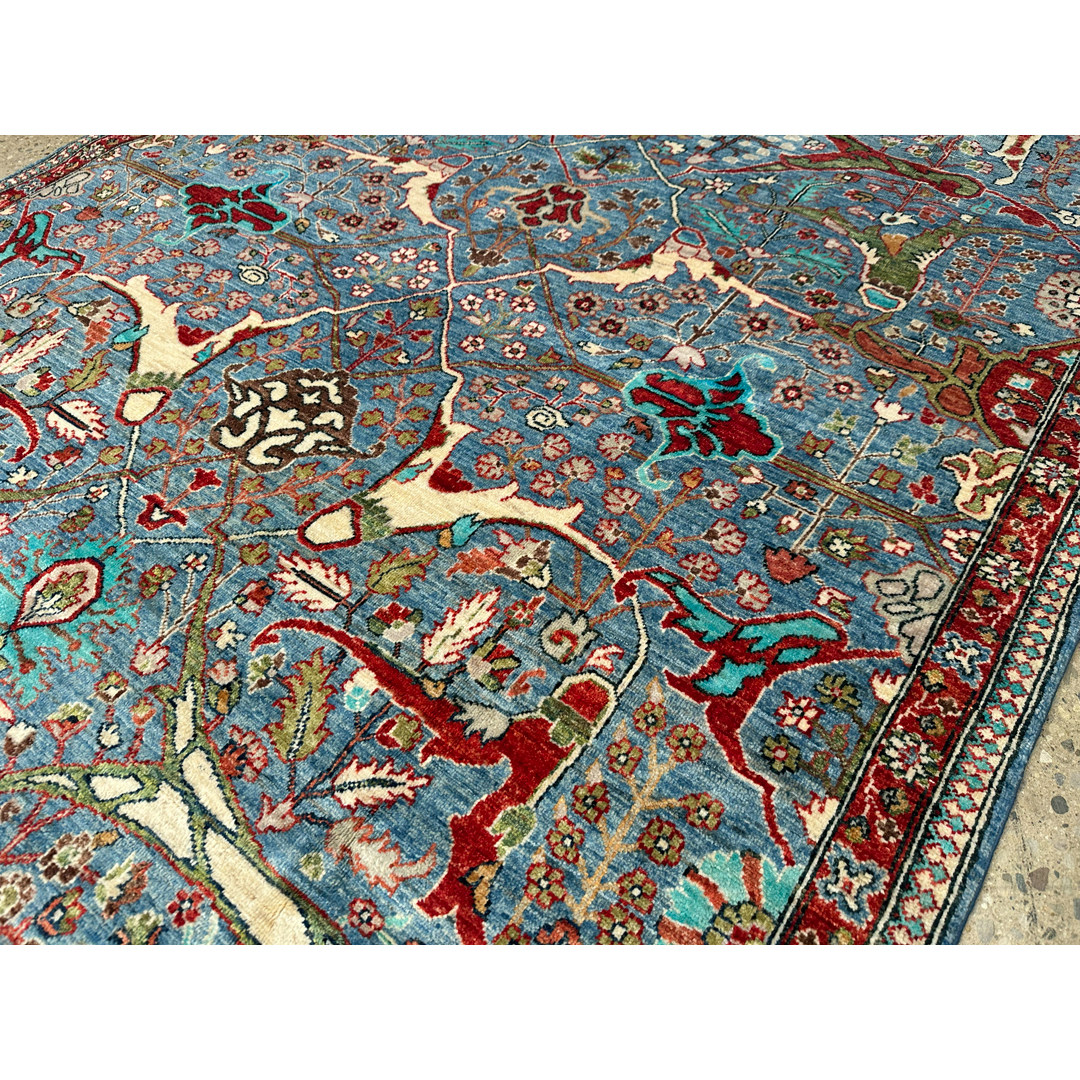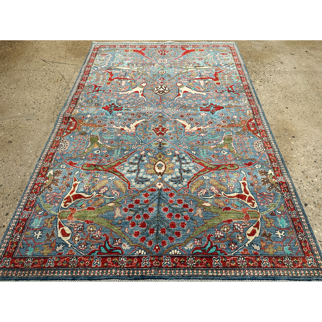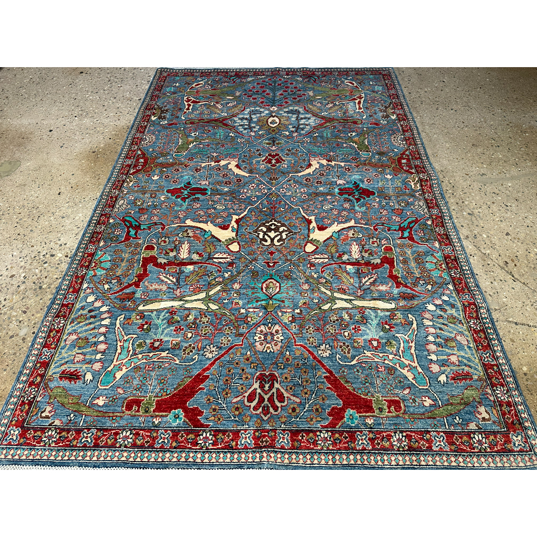 This spectacular Afghan hand-knotted rug offers a masterful, vibrant homage to the legendary weaving tradition originally developed by Kurdish artisans in the Bijar region. The dynamic, all-over composition is characterized by its iconic split-arabesque design, featuring sweeping, oversized botanical vines, dramatic interlocking geometric branches, and highly stylized floral palmettes that dance energetically across the canvas. What makes this piece truly breathtaking is its brilliant, saturated color palette. A luminous, vividly striated field of cerulean and sky blue provides an awe-inspiring backdrop for the bold, high-contrast motifs, which are rendered in rich shades of madder red, crisp ivory, soft emerald green, and deep teal. This vibrant central canvas is powerfully framed by a classic crimson-red border adorned with repeating floral rosettes. Measuring a versatile 5’9″ x 8’8″ ft., this fine, durable wool carpet is perfectly scaled to bring a burst of joyful color, dynamic energy, and rich, old-world history to a variety of spaces.