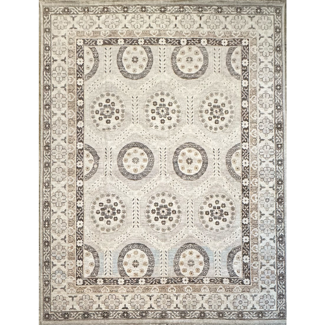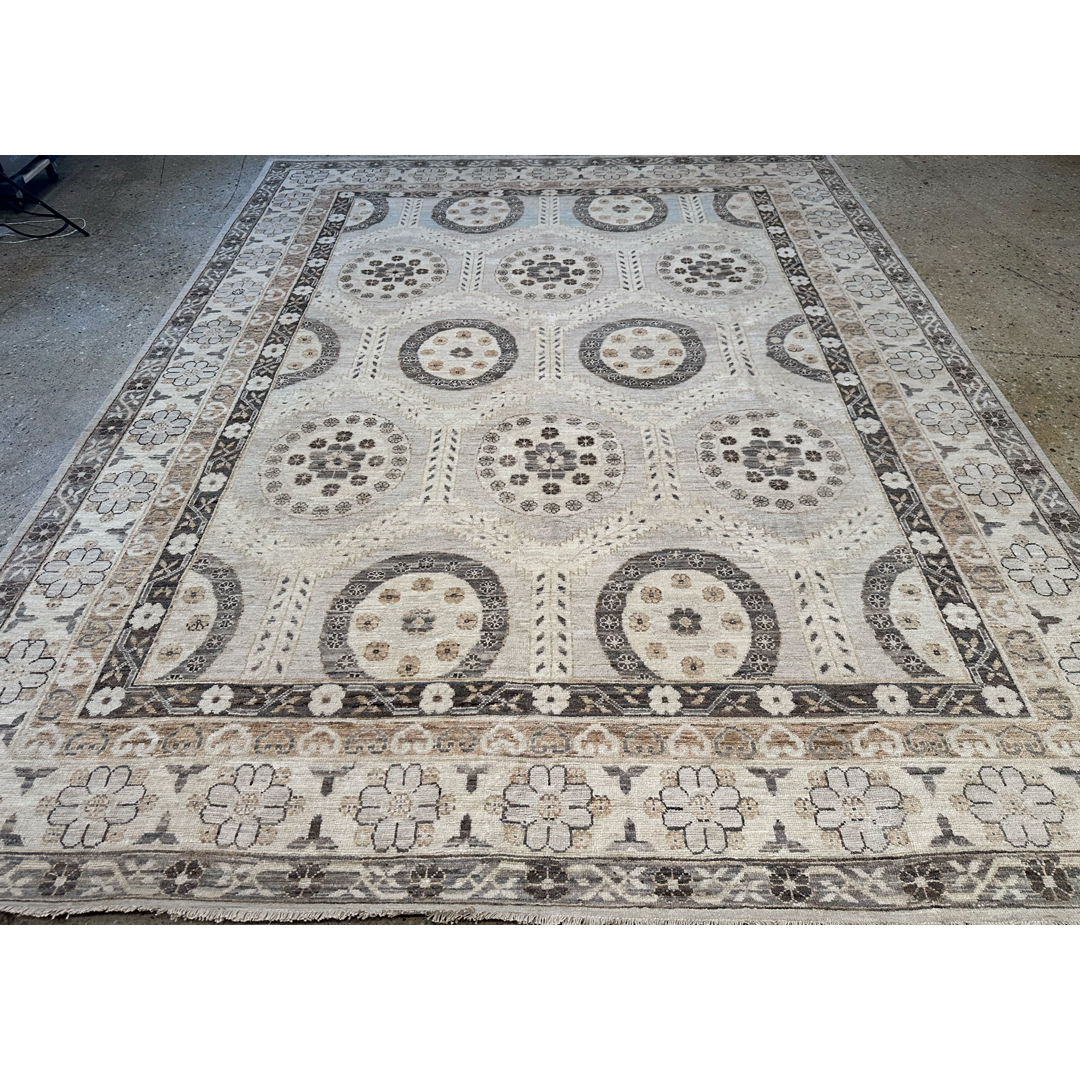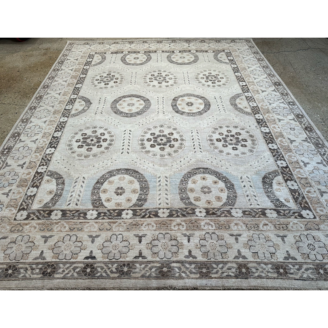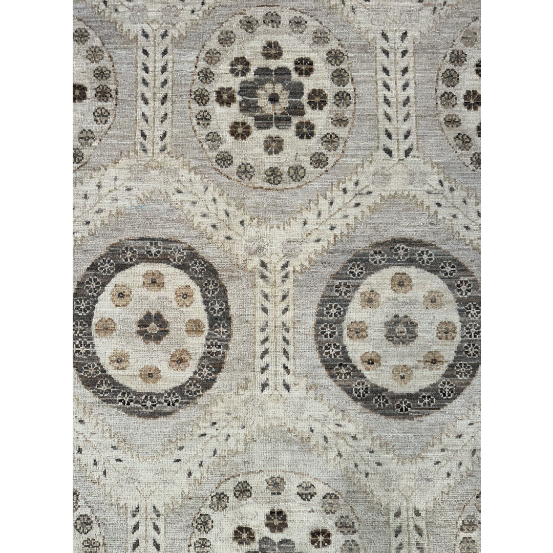 This exquisite Afghan hand-knotted rug offers a remarkably elegant, transitional interpretation of classic East Turkestan Khotan weaving traditions. The serene composition features a highly structured, repeating grid of large circular medallions (or rondels), each intricately detailed with stylized floral rosettes. These classic motifs float gracefully across a luminous, softly heathered field of pearl grey, crisp ivory, and warm taupe.