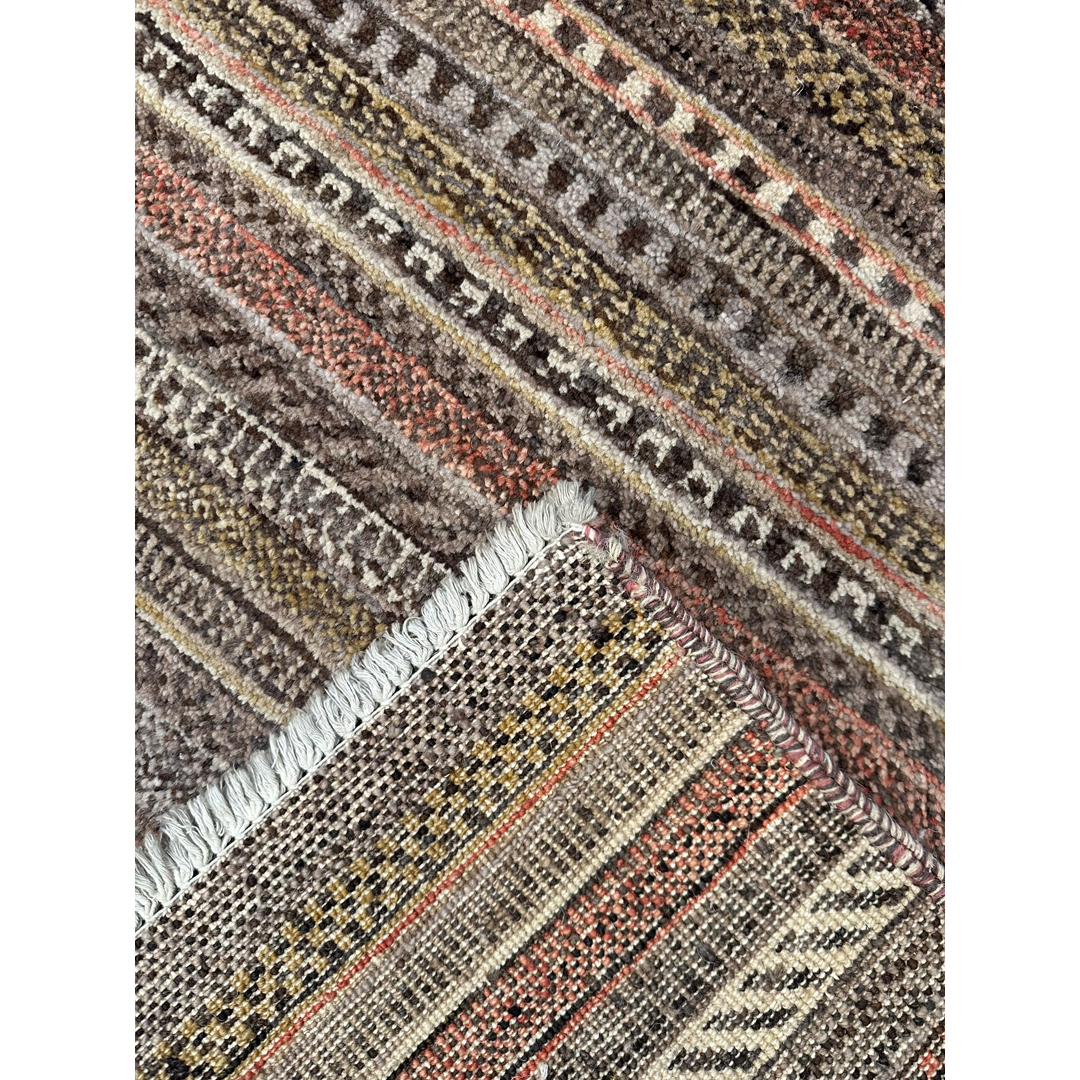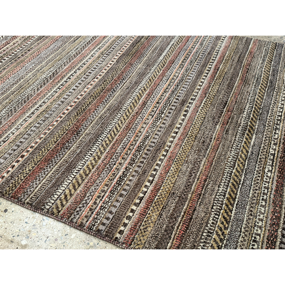 This hand-knotted Afghan rug features a modern interpretation of the traditional Gabbeh style. The design is characterized by a series of horizontal linear bands in a varied palette of earthy tones, including charcoal, taupe, warm brown, and soft terracotta. Each band incorporates subtle geometric variations and stippled textures, creating a rhythmic and organic visual effect. The rug is woven with high-quality wool, providing a dense and durable pile that highlights the natural luster of the fibers. Its minimalist yet detailed aesthetic makes it a versatile piece suitable for both contemporary and transitional interior spaces.
