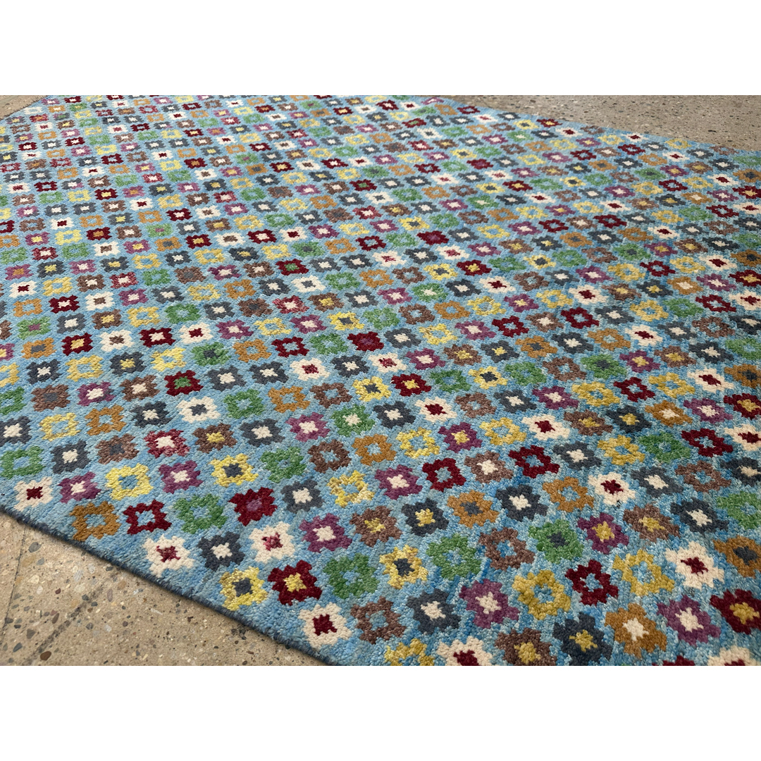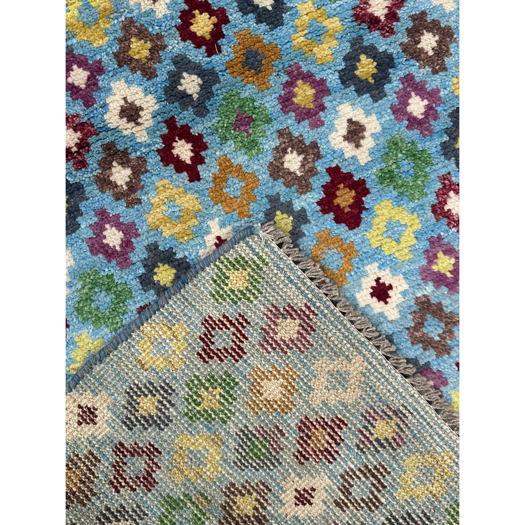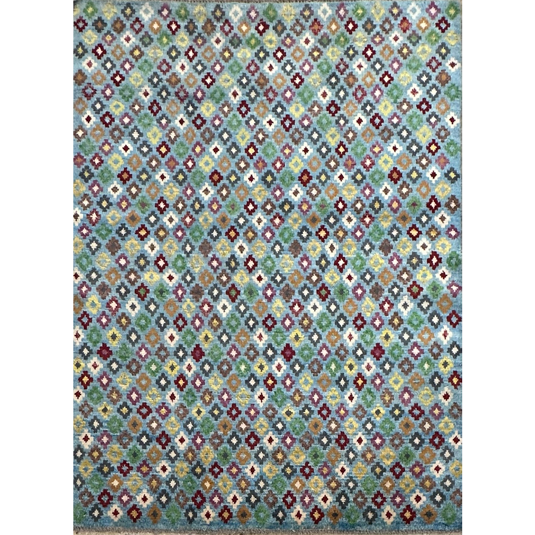 Refresh your home with the vibrance of this Afghan-made hand-knotted wool rug. Drawing inspiration from Moroccan tribal weaving traditions, the layout moves away from traditional central medallions and formal borders in favor of a continuous, all-over repeating geometric lattice. This dynamic pattern is composed of densely packed, stylized diamond motifs, executed in a rich array of multi-colored accents including deep burgundy, olive green, soft gold, crisp ivory, and rust. These jewel-toned elements are set against a rich, beautifully heathered sky-blue background, creating a striking yet structured aesthetic. Constructed with a plush pile and combining a rhythmic, dense geometric pattern with a bright, modernized color story, this piece achieves a highly adaptable, eclectic presence.