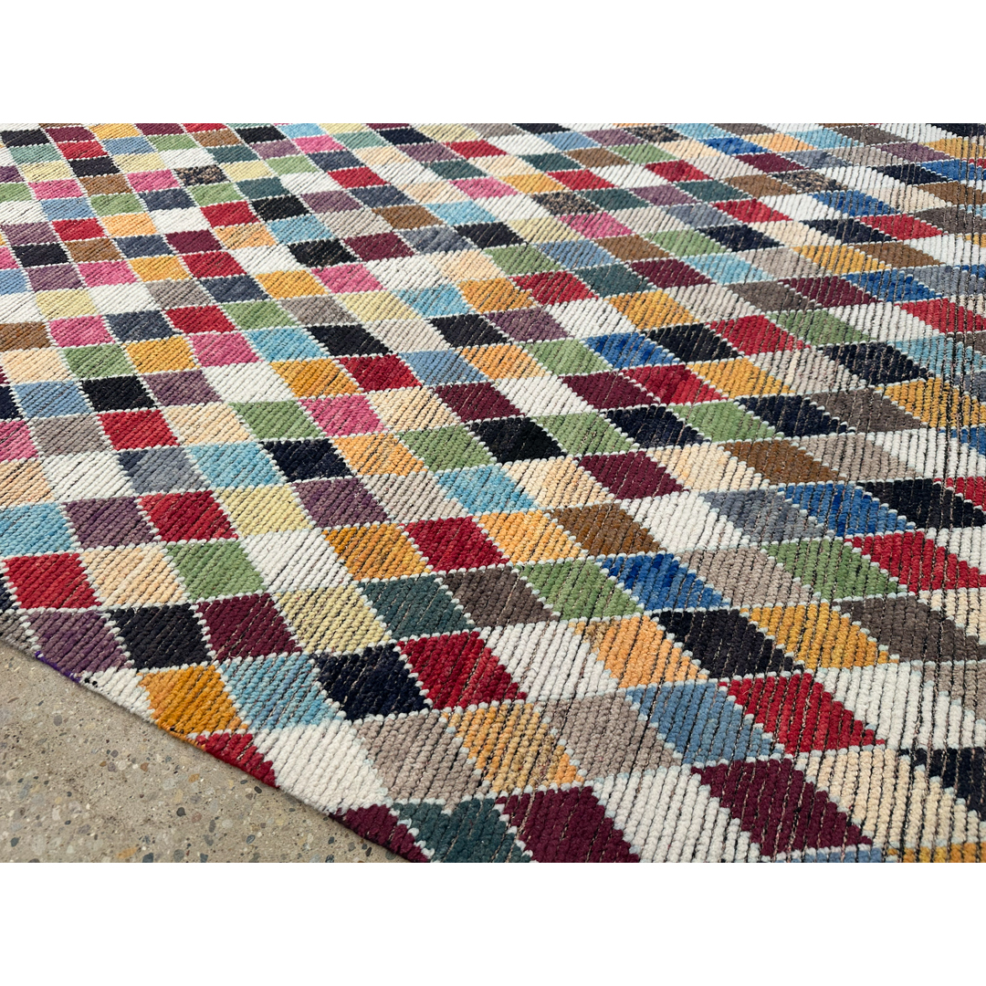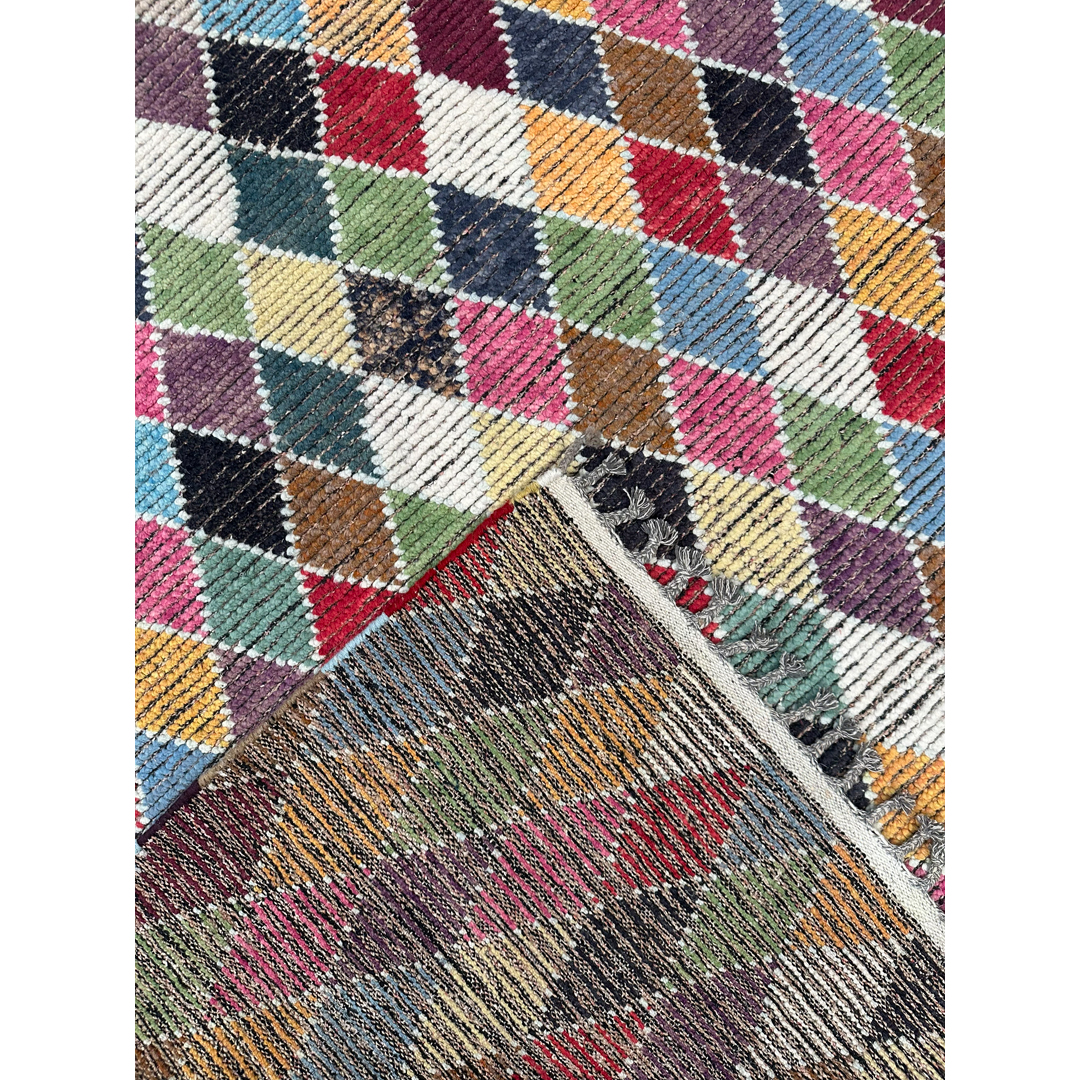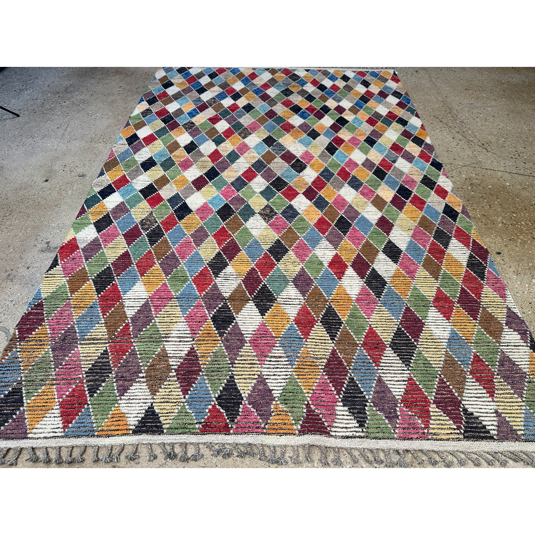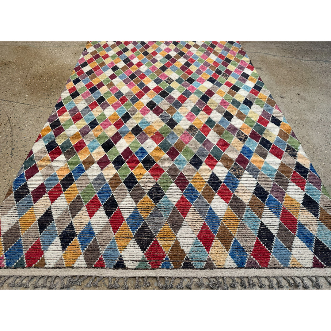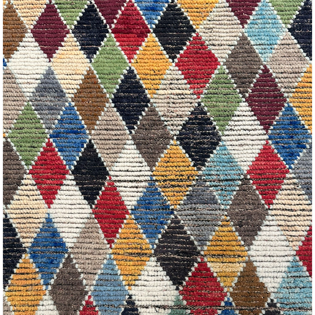 Woven in Afghanistan with a modern take on the Moroccan style, this piece utilizes a classic, repeating diamond motif. The tightly structured geometric grid organizes the bright color palette into a balanced, rhythmic layout, separated by thin, off-white linear boundaries. The rug is finished with a traditional braided fringe at the ends, adding a layer of tactile texture to the floor. With its sturdy profile, this rug provides ample coverage for a standard seating arrangement while offering a soft, practical surface that accommodates daily use.