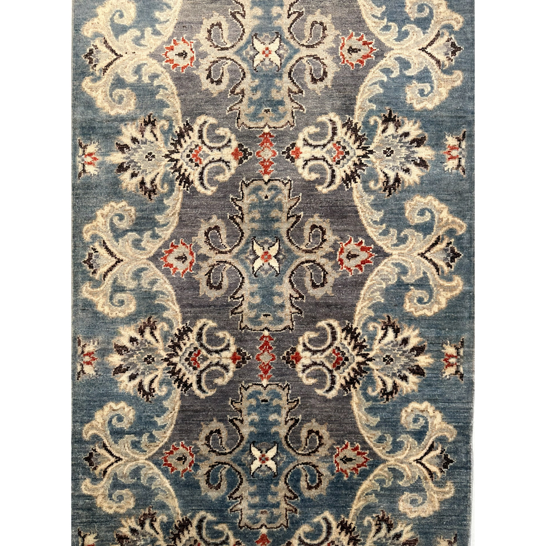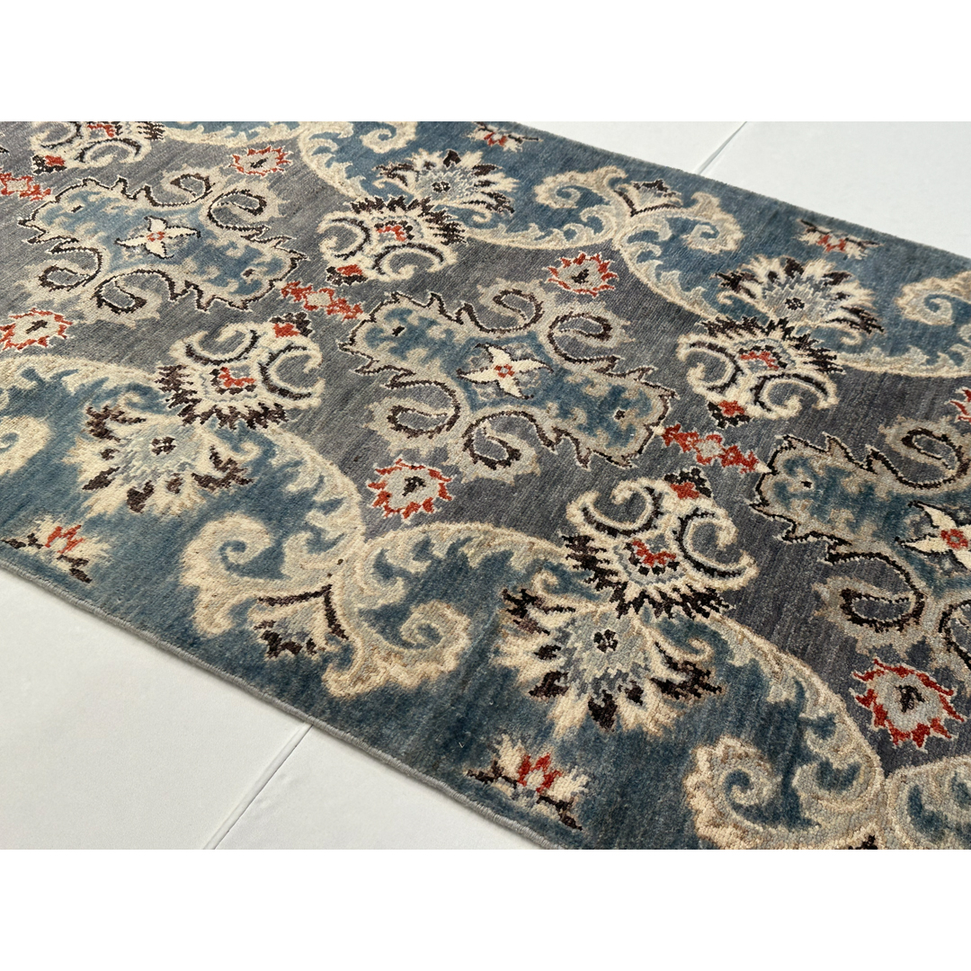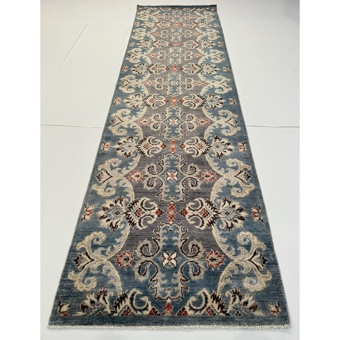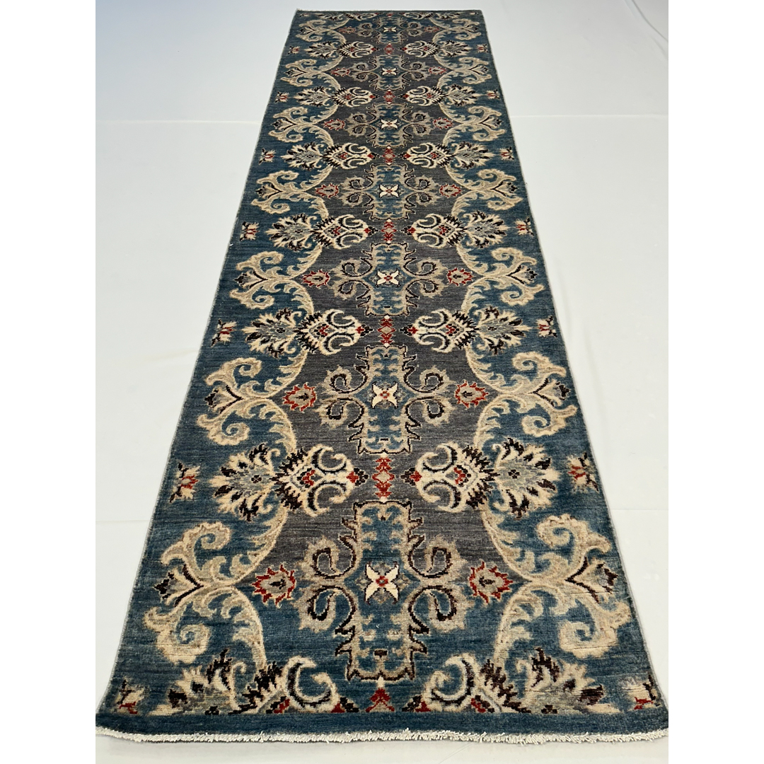 This hand-knotted Afghan runner offers a sophisticated, transitional interpretation of classic Peshawar designs. The elegant, elongated composition features a continuous vertical column of intricate, repeating geometric palmettes. These central medallions are beautifully framed by sweeping, oversized ivory arabesques and scrolling vines that undulate gracefully along the entire length of the piece. Rendered in a stunning, high-contrast palette, the crisp ivory, deep charcoal, and vibrant rust-red pop brilliantly against a highly textural, heathered field of slate gray. Masterfully woven with premium wool, the runner exhibits a beautiful color variation that mimics the gentle fading of a prized antique. Measuring a versatile 2’10” x 9’11″ ft., this durable, plush runner is an ideal foundation for high-traffic areas.