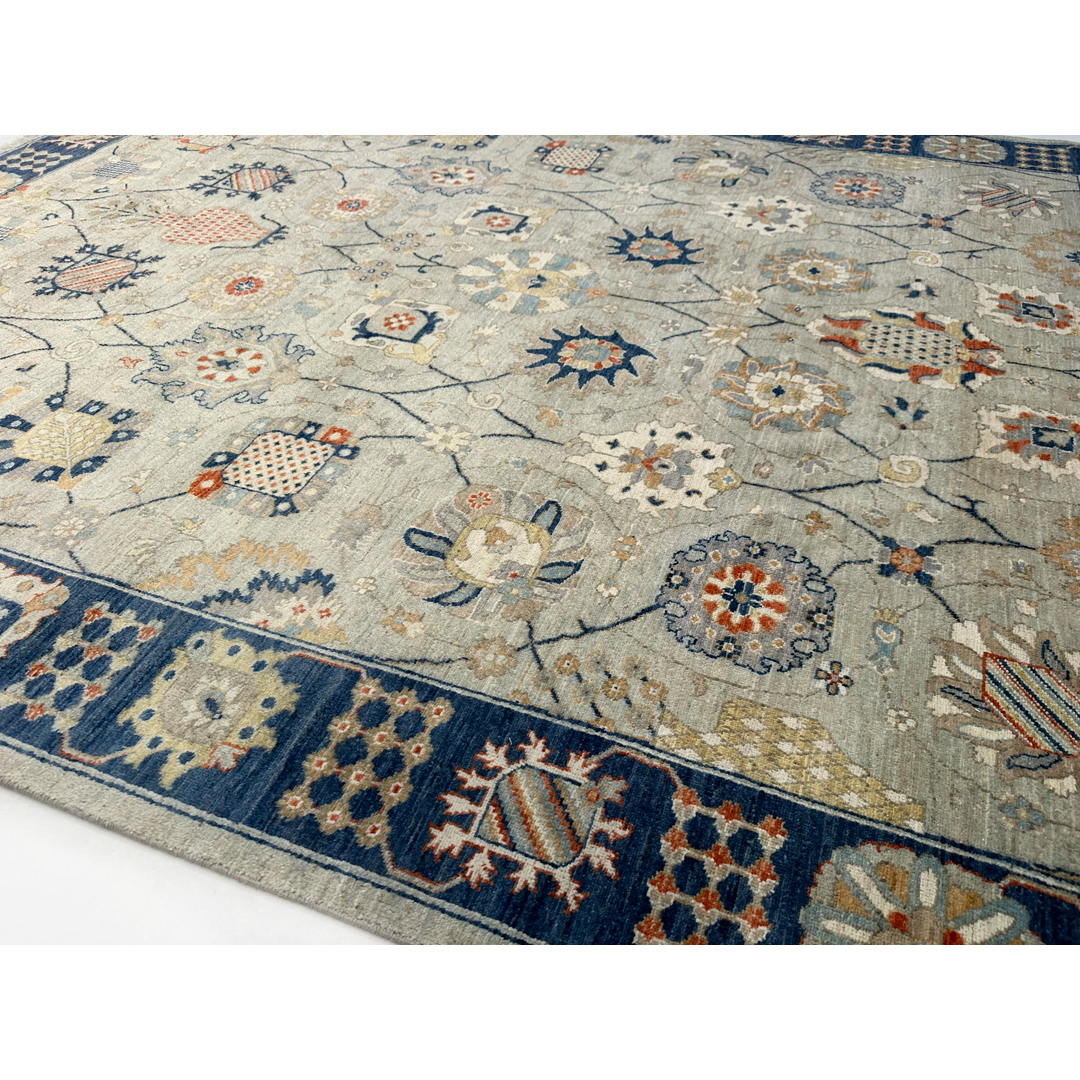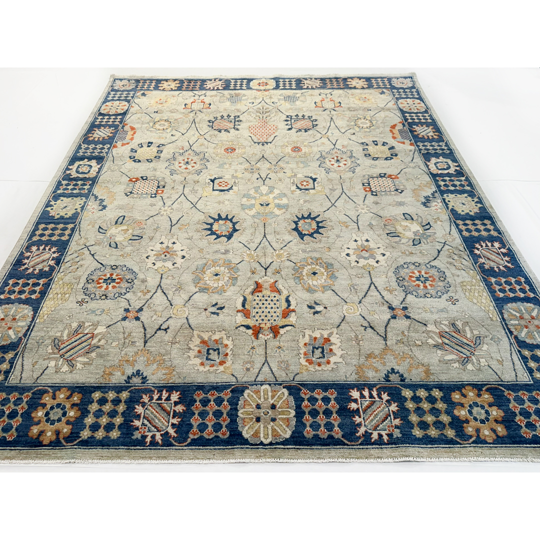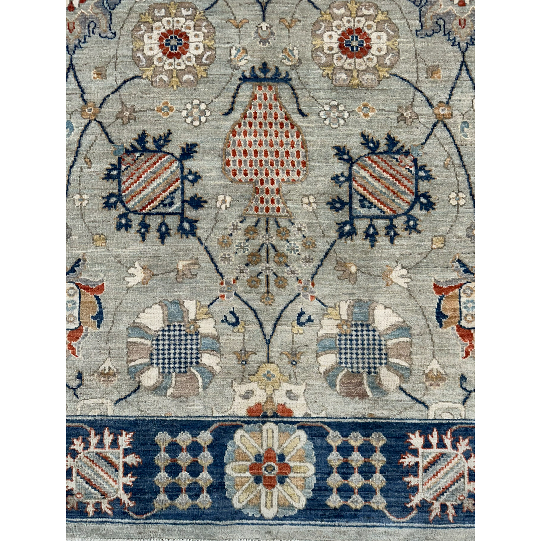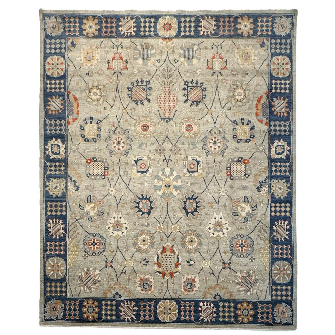 This exceptional Afghan hand-knotted rug offers a masterful, transitional interpretation of classic Peshawar and Oushak weaving traditions. The highly structured yet airy composition features a sweeping, all-over diamond lattice formed by delicate botanical vines. Within this graceful framework, an array of stylized geometric floral palmettes, classic vase motifs, and intricate rosettes bloom across a luminous, softly heathered silver-gray field. These classic elements are brought to life in a crisp, elegant palette of rust red, warm gold, soft taupe, and pale icy blue.