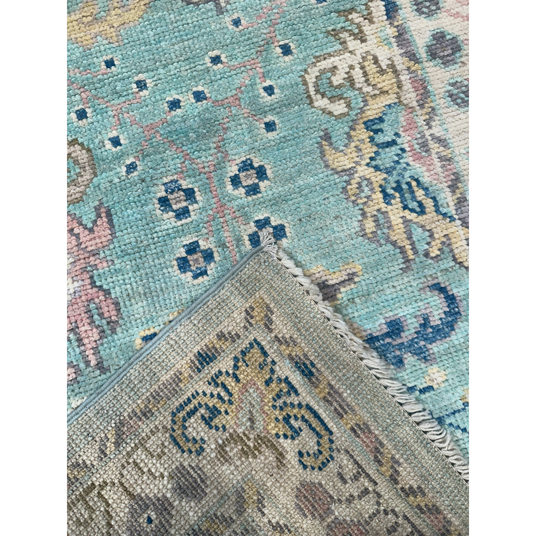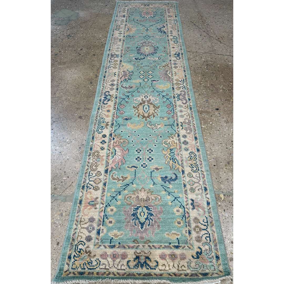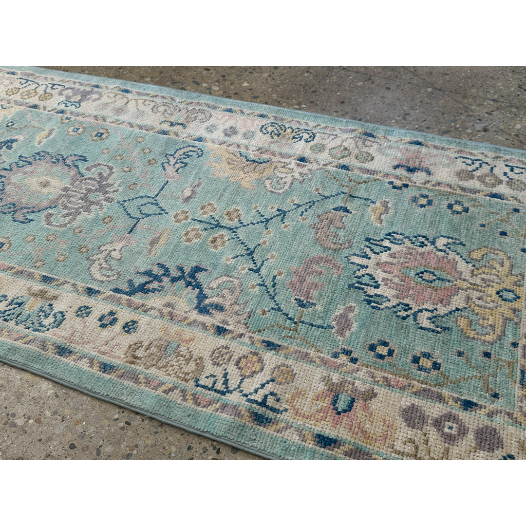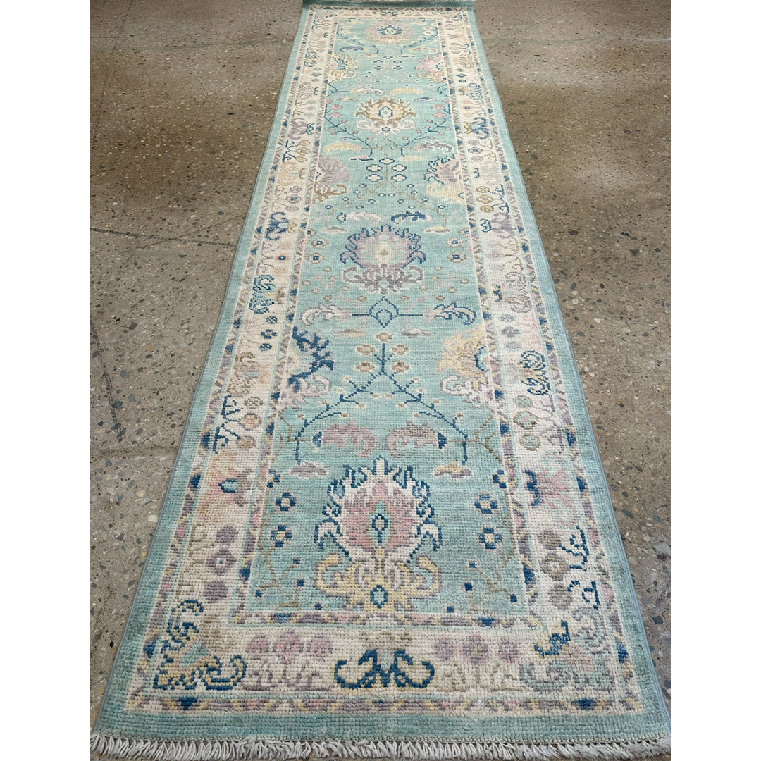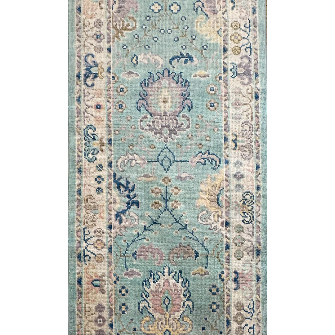 Elevate your corridor with the serene beauty of this amazing 2’7″ x 9’11” ft. Afghan runner featuring a Transitional Turkish Oushak design. Expertly hand-knotted in Afghanistan, this piece showcases a refreshing aqua-blue field that brings a sense of calm and openness to narrow spaces. The design features a graceful vertical arrangement of stylized floral palmettes and vine scrolls in soft pastel shades of blush pink, ivory, and beige. Framed by a creamy ivory border with delicate floral tracery, this durable wool runner combines traditional artistry with a modern, airy palette, making it a perfect choice for brightening a hallway, kitchen, or entryway.