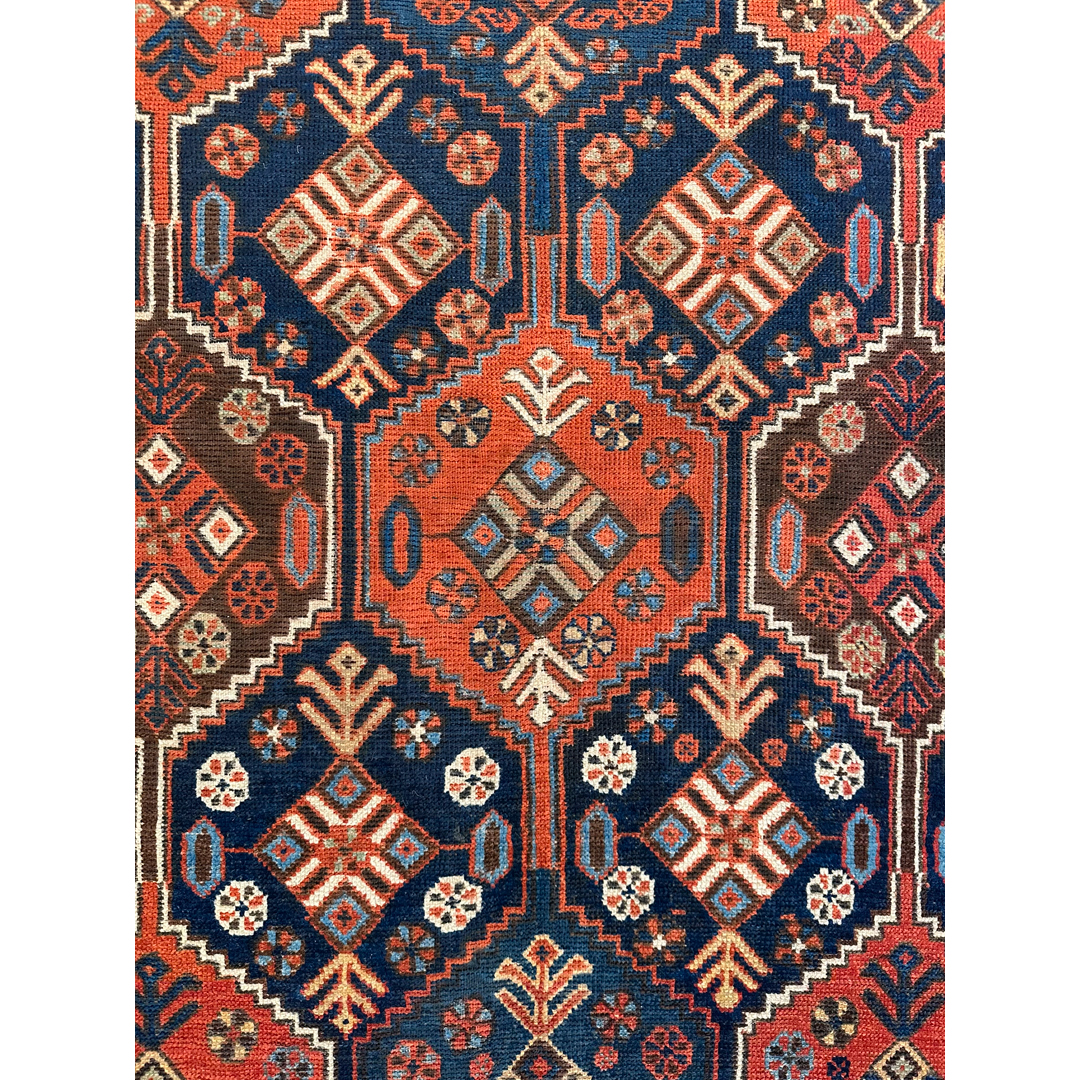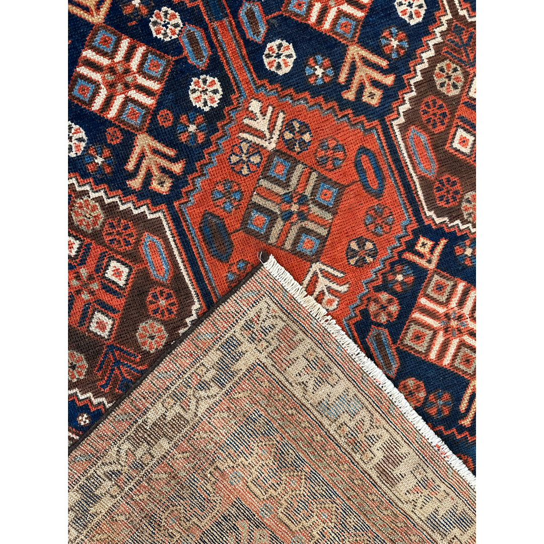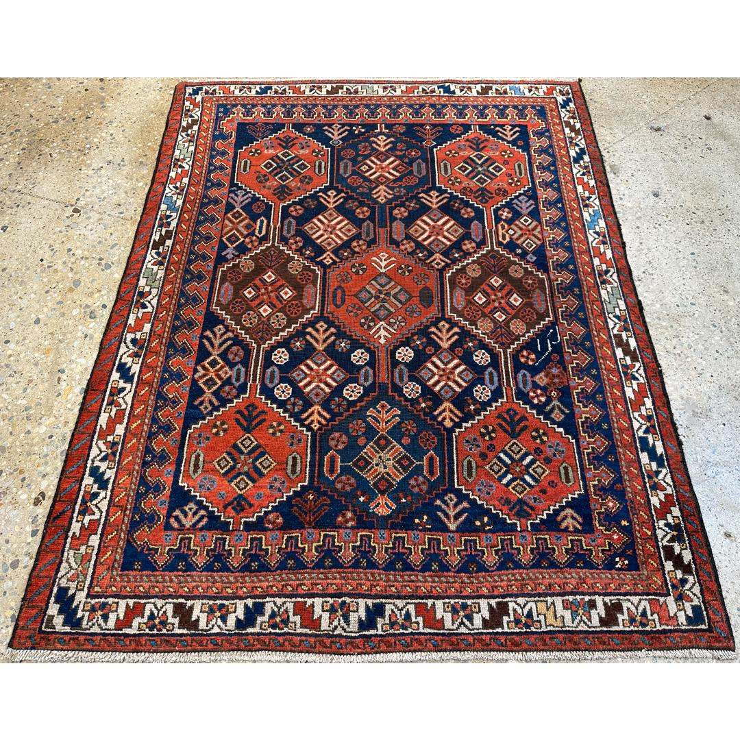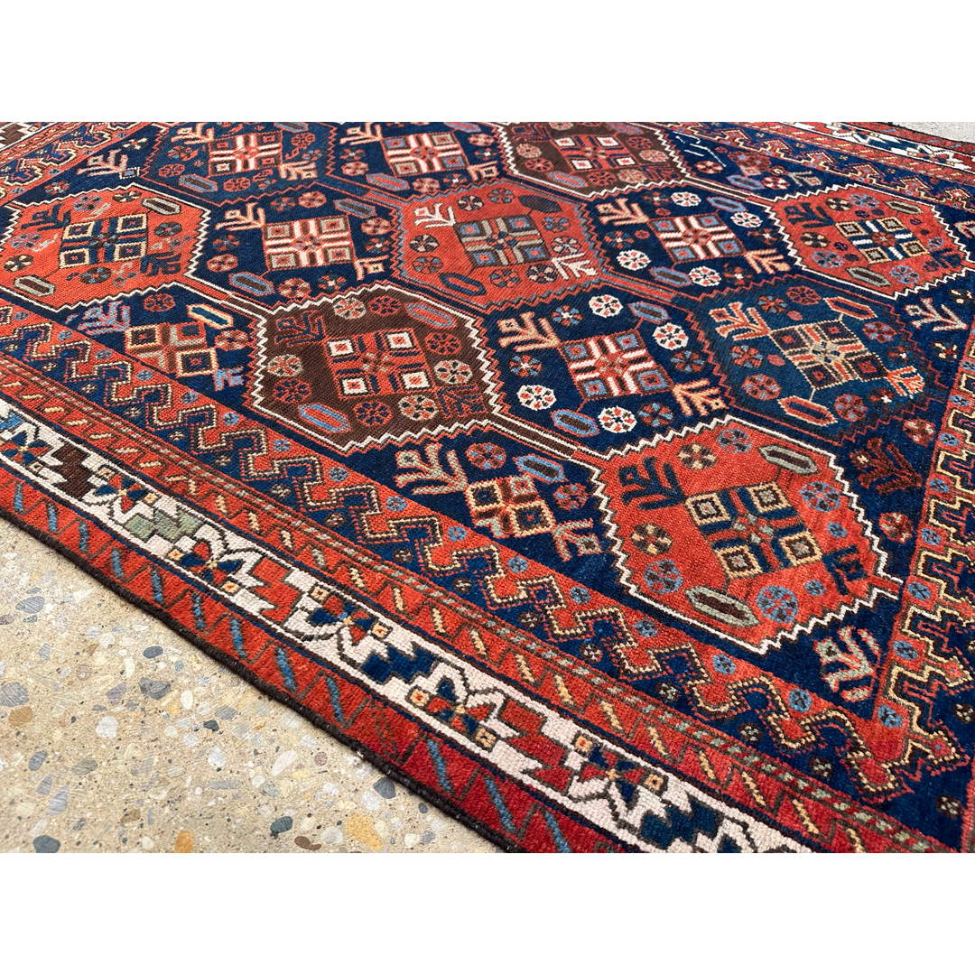 Immerse yourself in the tribal beauty of this amazing 4’8″ x 6’3″ ft. antique Persian Afshar rug. A genuine hand-knotted treasure from the 1940s, this rug is renowned for its bold geometric style and high-quality wool. The design features a striking field of repeating hexagonal medallions, or “guls,” arranged in a harmonious grid against a deep navy blue background. Each medallion is filled with intricate geometric motifs in vibrant shades of rust-red, ivory, and hints of sky blue. Framed by multiple decorative borders with tribal patterns, this durable and historically rich rug makes a captivating statement piece for a study, entryway, or eclectic living room.