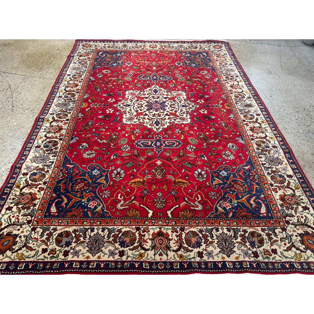 Infuse your living space with the vibrant energy and classic beauty of this amazing 7’6″ x 10’6″ ft. antique Turkish rug. Hand-knotted in the 1940s, this piece features a lush, ruby red field that provides a warm and inviting foundation for the room. The composition is centered on a striking, lobed medallion rendered in creamy ivory and detailed with multicolored floral sprays. Contrasting corner spandrels in deep midnight blue frame the central design, adding depth and formal balance to the layout. Surrounded by a wide ivory border filled with a graceful floral vine meander, this durable rug offers a sophisticated yet lively aesthetic perfect for a dining room, living area, or bedroom seeking a splash of traditional color.