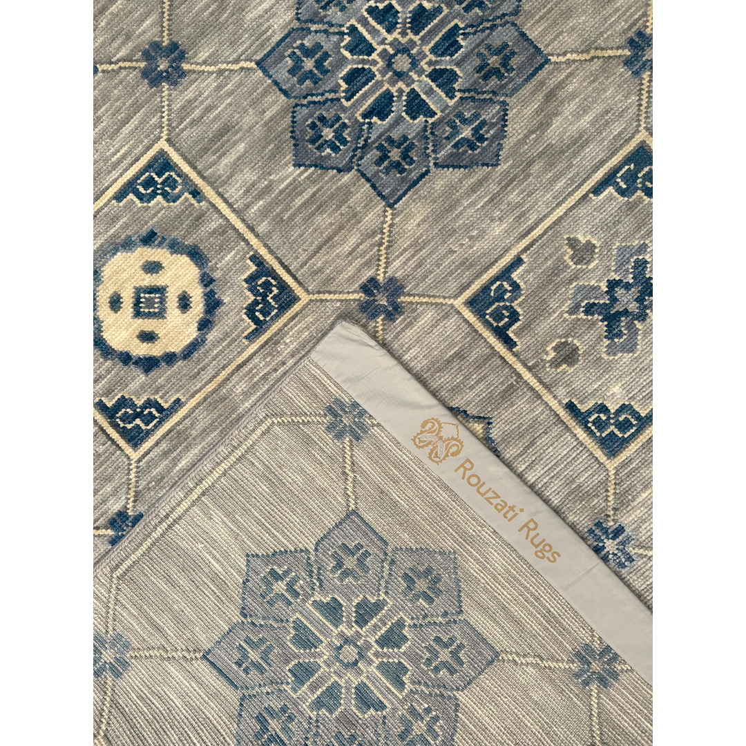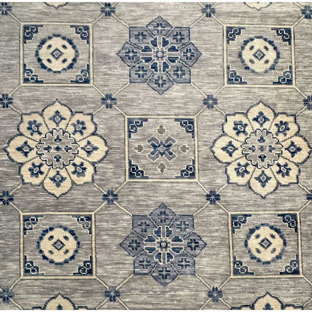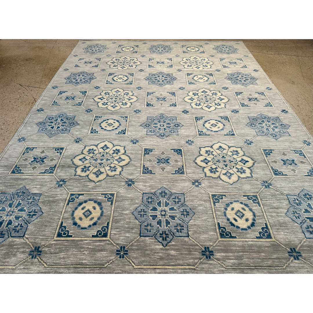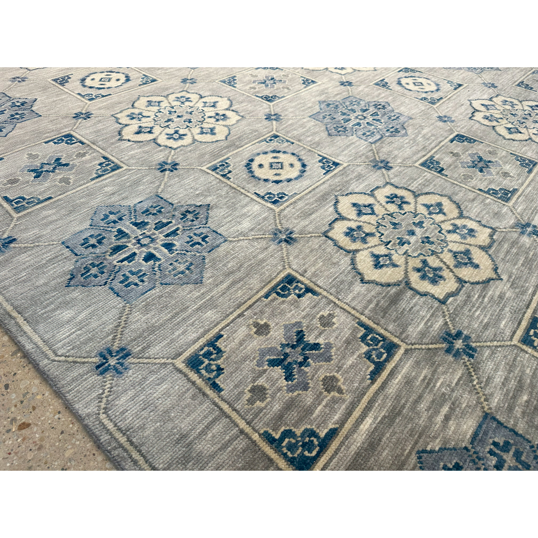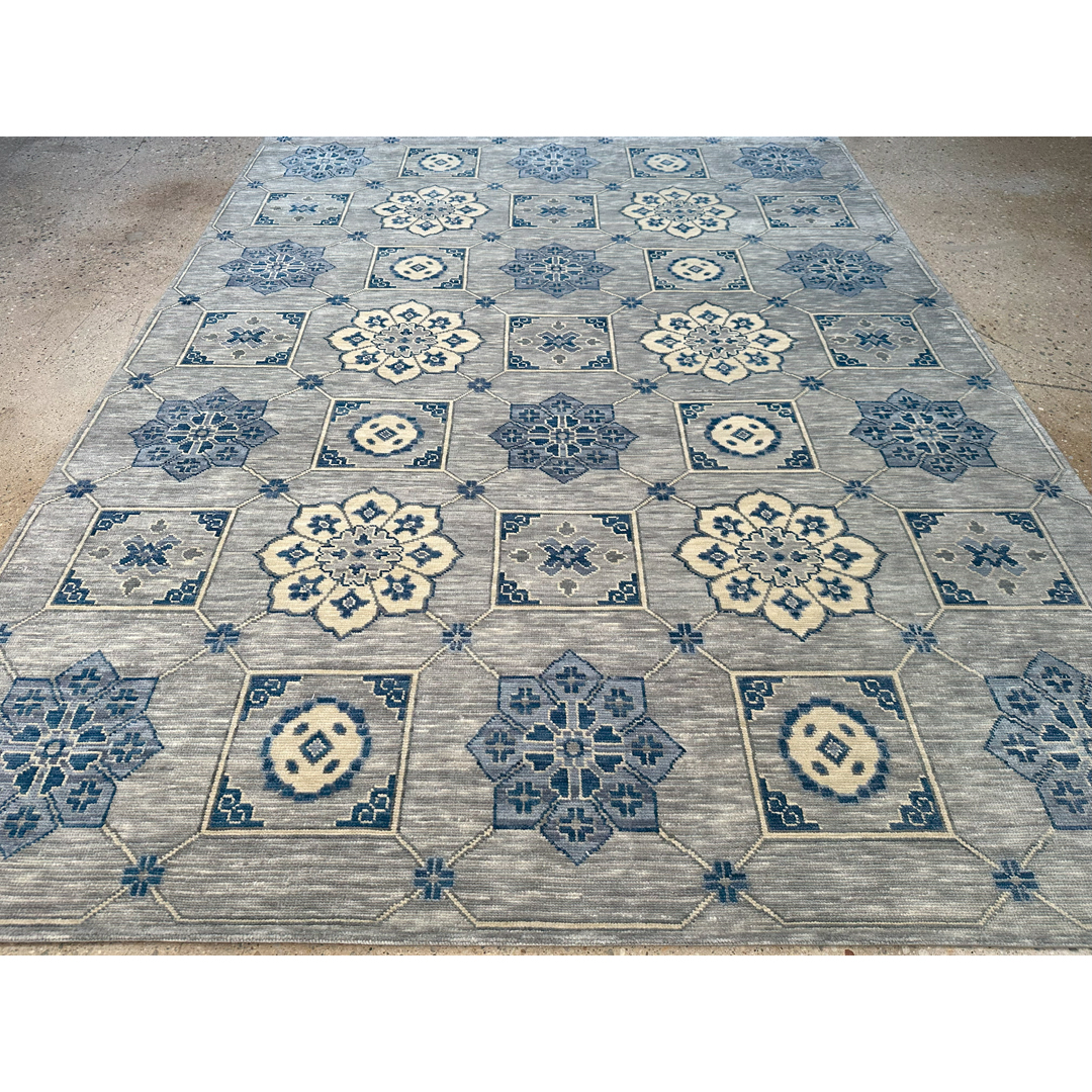 This hand-knotted Indian rug features a sophisticated, architectural design that artfully reimagines traditional Anatolian motifs. The composition is centered around an expansive field organized by a rhythmic grid of interlocking diamond and square medallions. Within these geometric compartments, stylized floral palmettes and rosettes are rendered in a serene, contemporary palette of slate blue, silver-grey, and soft ivory.