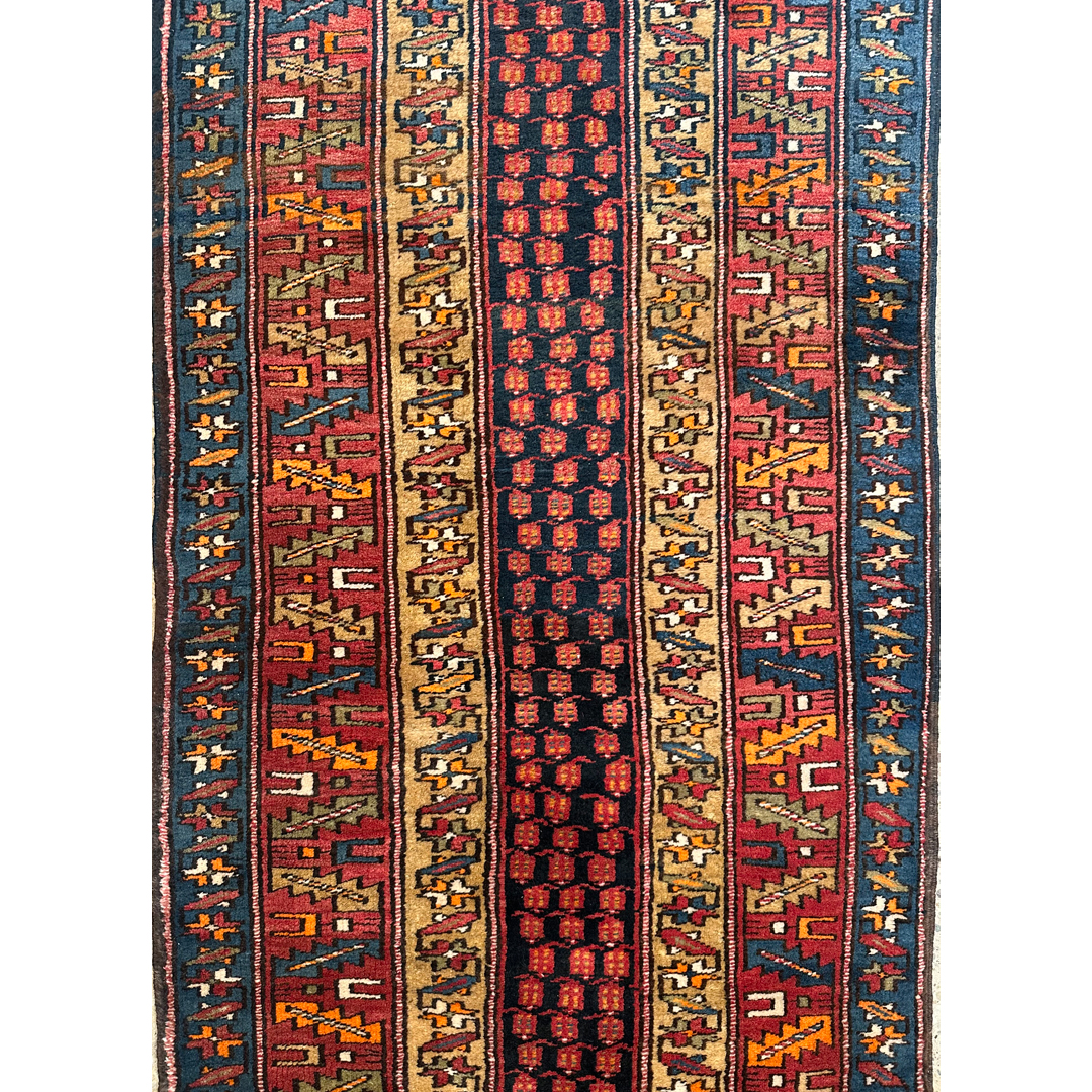 Energize your hallway with the bold, rhythmic geometry of this amazing 3’10” x 13’11” ft. antique Persian Ardebil runner. Hand-knotted with a distinct tribal aesthetic, this durable piece features a striking vertical striped design that naturally draws the eye down the length of the floor. The composition is defined by alternating bands of deep midnight indigo, warm terracotta rust, and golden camel, each filled with intricate geometric motifs and stylized vine patterns. This dynamic linear layout offers a refreshing departure from traditional medallion runners, providing a sense of movement and energy. With its rich color palette and resilient construction, this runner serves as an ideal foundation for a busy entryway, a long corridor, or a gallery space seeking a touch of authentic rustic character.