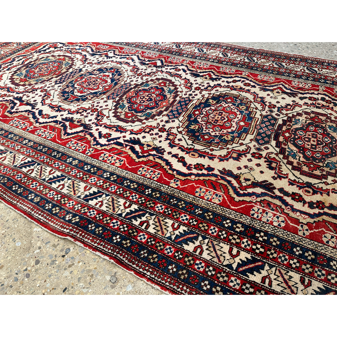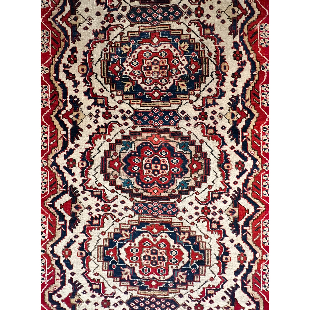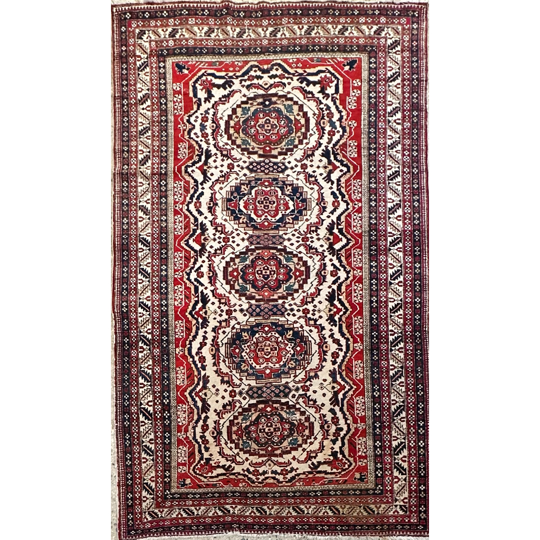 This 1940s Antique Persian Ardebil rug, measuring 5’1″ x 9′ ft., presents a striking geometric composition typical of the region’s bold aesthetic. The rug features a vertical column of four ornate, multi-tiered medallions running down the center, detailed in rich navy, rust red, and accents of light blue. These medallions sit atop a creamy ivory field that is densely patterned with smaller geometric motifs and “S” shapes. A distinctive feature is the jagged, sawtooth red border that encases the ivory field, creating a dramatic, high-contrast frame often associated with Caucasian influence. The design is completed by a series of narrow, intricate guard borders in alternating dark and light tones, showcasing the meticulous knotting and structural precision that make this piece a captivating example of Northwest Persian artistry.