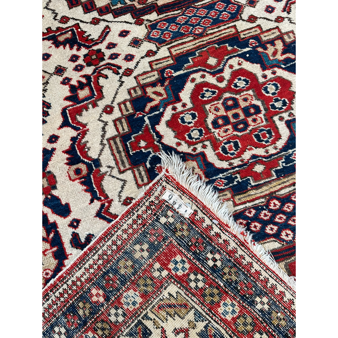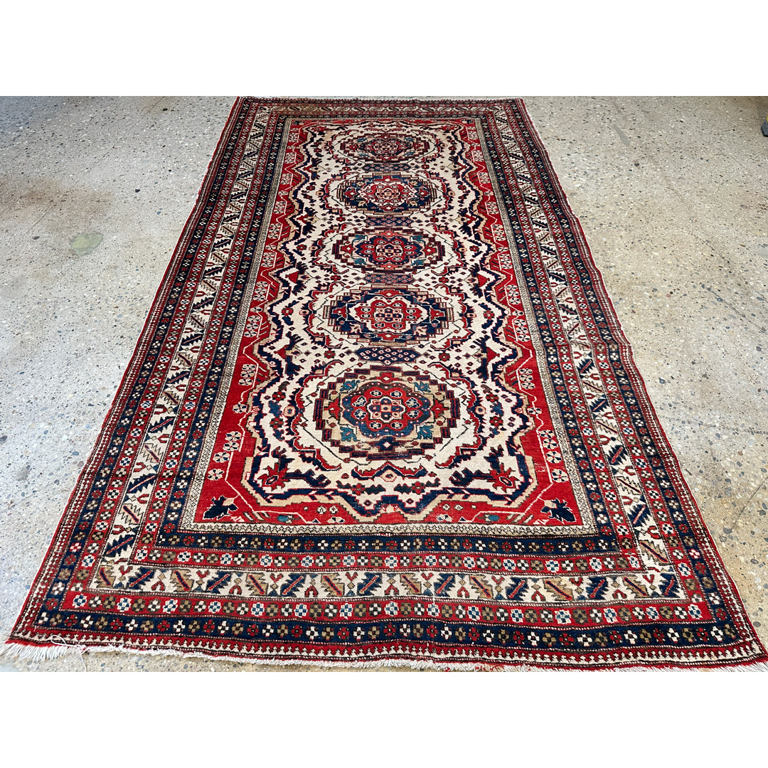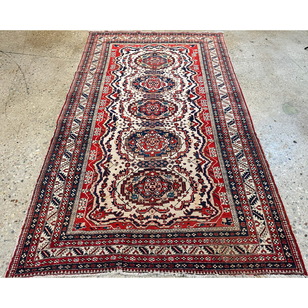 This 1940s Antique Persian Ardebil rug, measuring 5’1″ x 9′ ft., presents a striking geometric composition typical of the region’s bold aesthetic. The rug features a vertical column of four ornate, multi-tiered medallions running down the center, detailed in rich navy, rust red, and accents of light blue. These medallions sit atop a creamy ivory field that is densely patterned with smaller geometric motifs and “S” shapes. A distinctive feature is the jagged, sawtooth red border that encases the ivory field, creating a dramatic, high-contrast frame often associated with Caucasian influence. The design is completed by a series of narrow, intricate guard borders in alternating dark and light tones, showcasing the meticulous knotting and structural precision that make this piece a captivating example of Northwest Persian artistry.