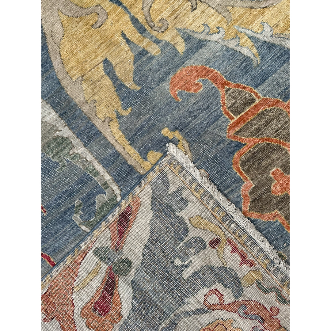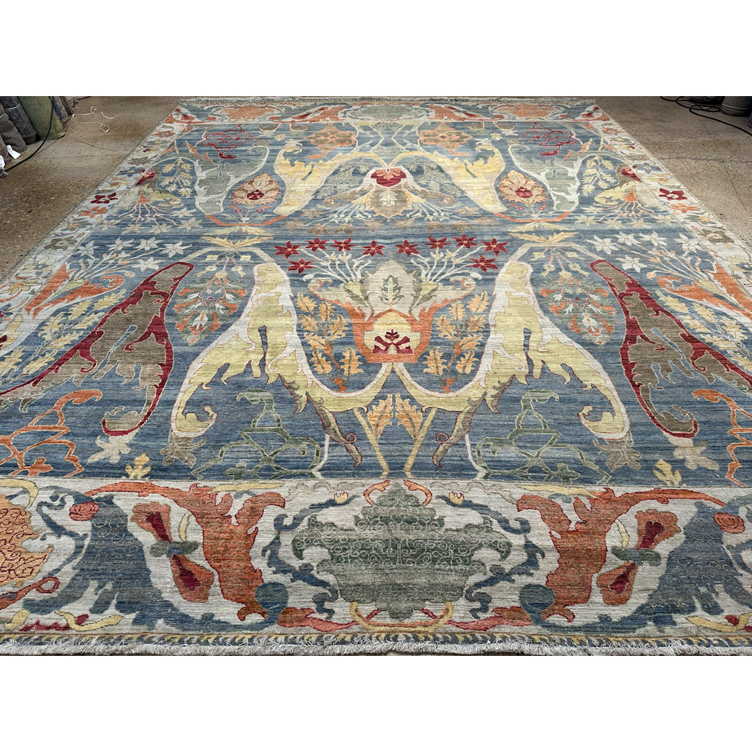 Transform your grandest interiors with the historic elegance of this amazing 11’10” x 15’2″ ft. Arts and Crafts rug. This exceptional piece, woven in India, features a rare and lustrous slate blue field that provides a sophisticated, cool-toned foundation for the room. The expansive composition is defined by oversized, stylized floral motifs and sweeping split-leaf arabesques rendered in warm, autumnal tones of goldenrod, rust, and sage green. These bold, organic forms evoke the celebrated aesthetic of William Morris and the Ziegler workshops, offering a perfect balance of structure and flow. A wide, creamy ivory border filled with a graceful scrolling vine frames the design, adding a bright and elegant finish to this palace-sized masterpiece.