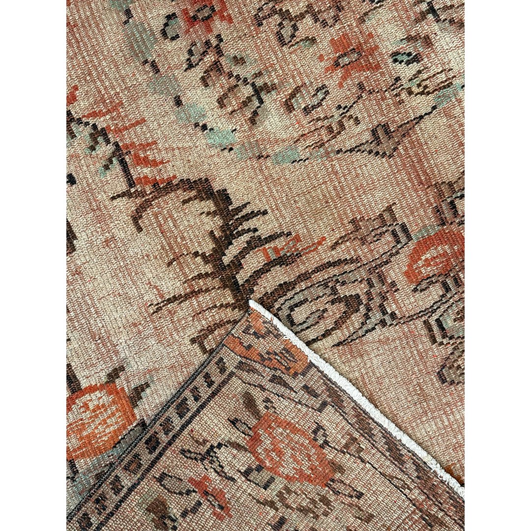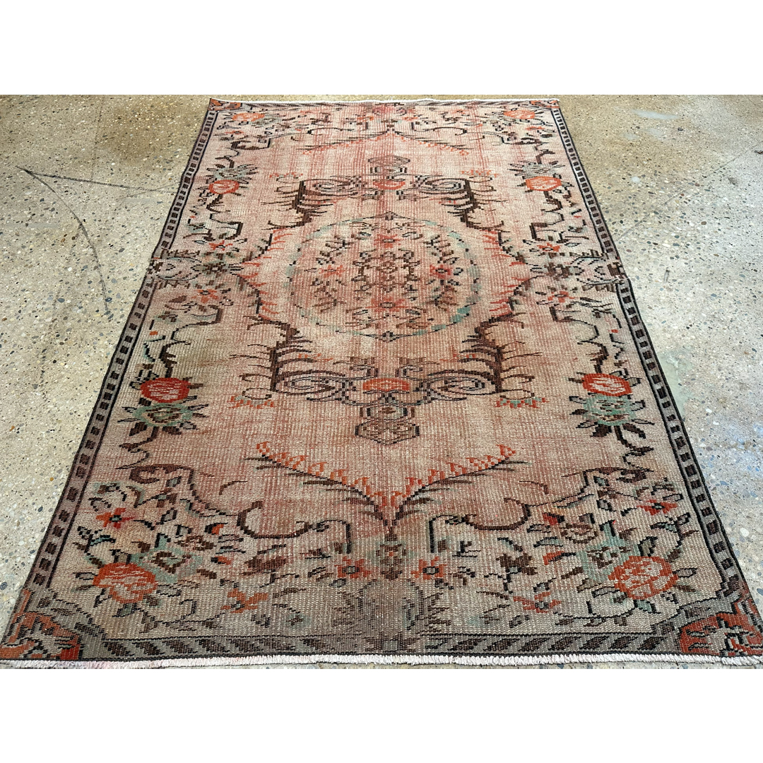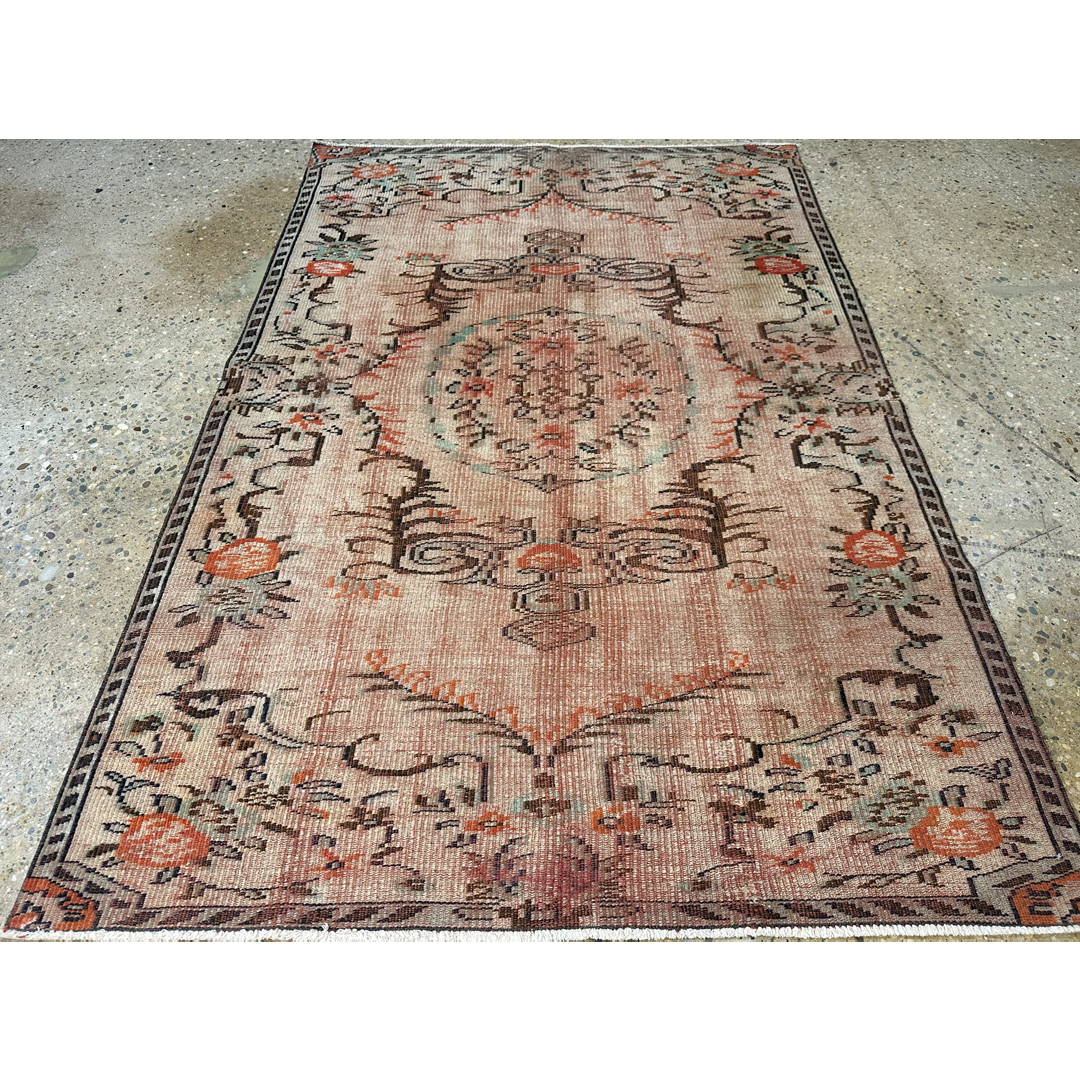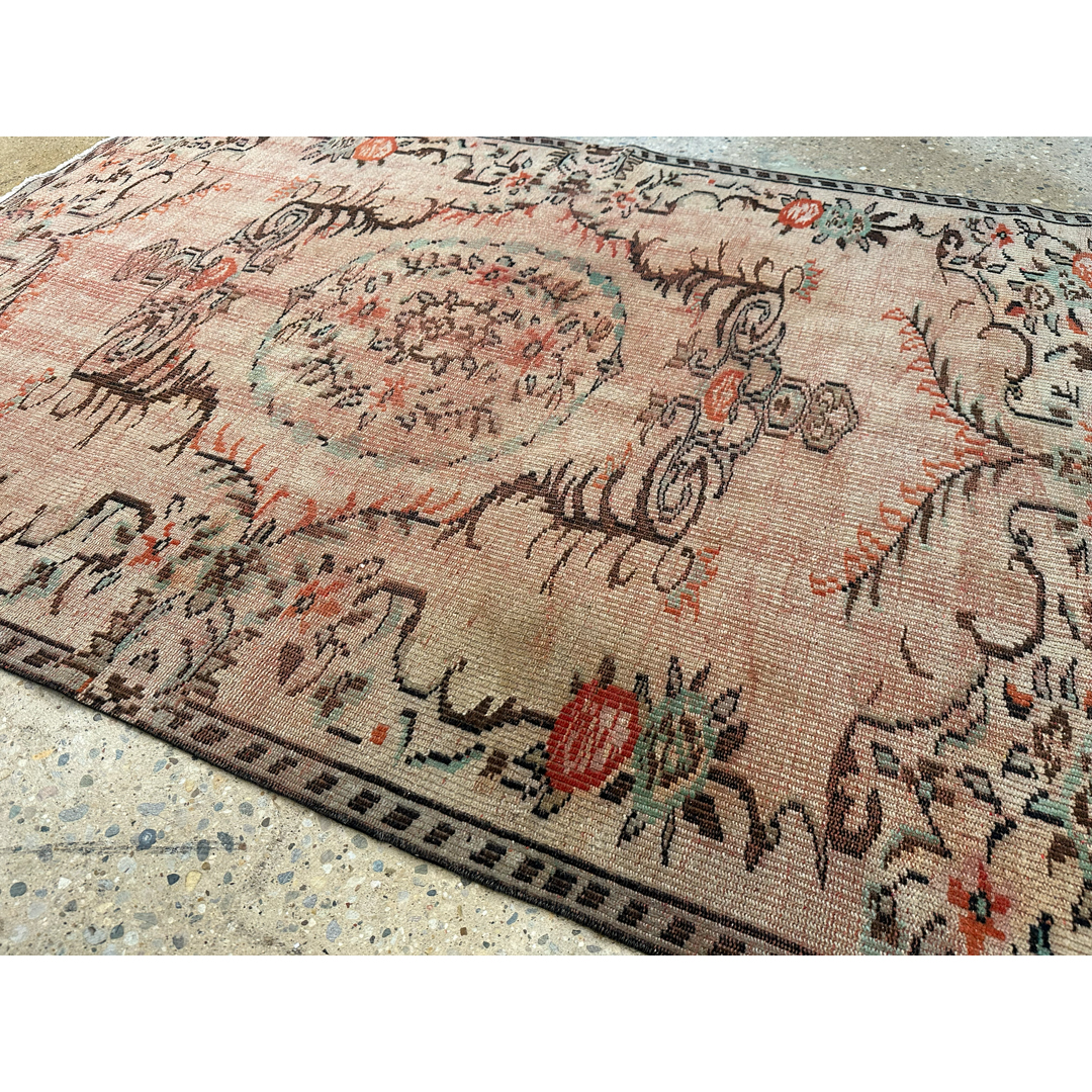 This antique Turkish Oushak area rug utilizes a romantic botanical layout to provide a decorative yet grounded foundation for your space. The design features a prominent central medallion surrounded by large-scale, stylized floral motifs and sweeping vine patterns characteristic of classic Anatolian weaving. A structured border frames the central field, using repeating geometric and floral elements to gently contain the movement of the interior design. Hand-knotted in the Turkish style with an even, low pile, this durable rug exhibits authentic vintage wear and fading. The color palette features a beautifully faded coral and salmon-pink background, accented by these traditional botanical motifs in dark espresso brown, muted teal, and soft ivory. This piece provides a sophisticated, lived-in texture that integrates seamlessly with both natural wood furniture and neutral upholstery.