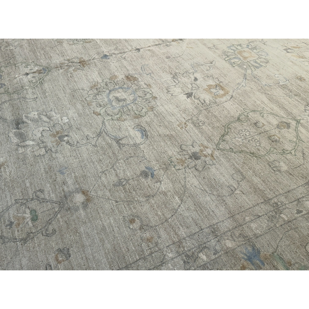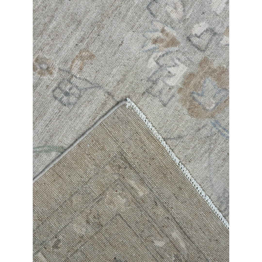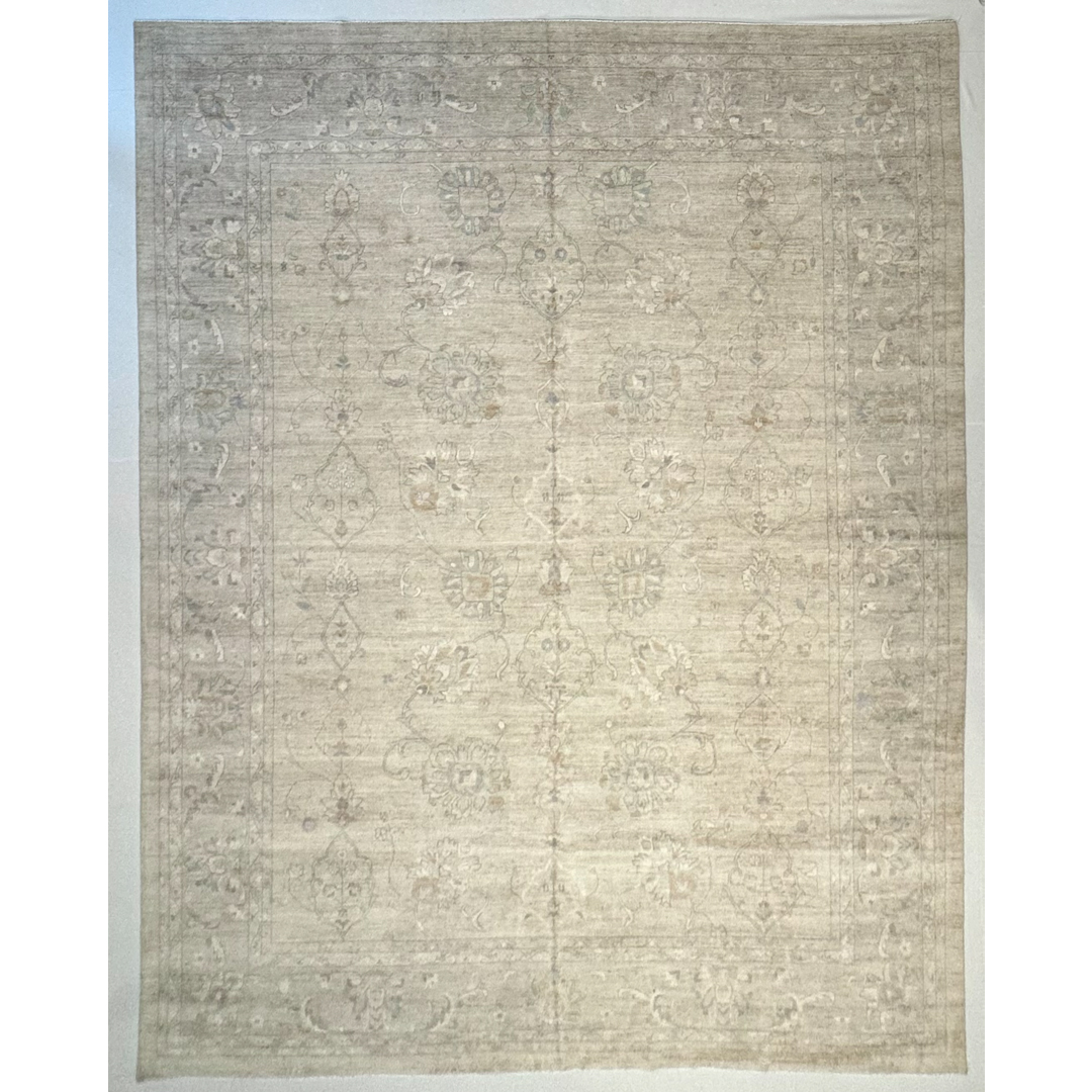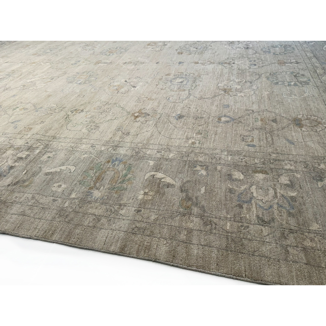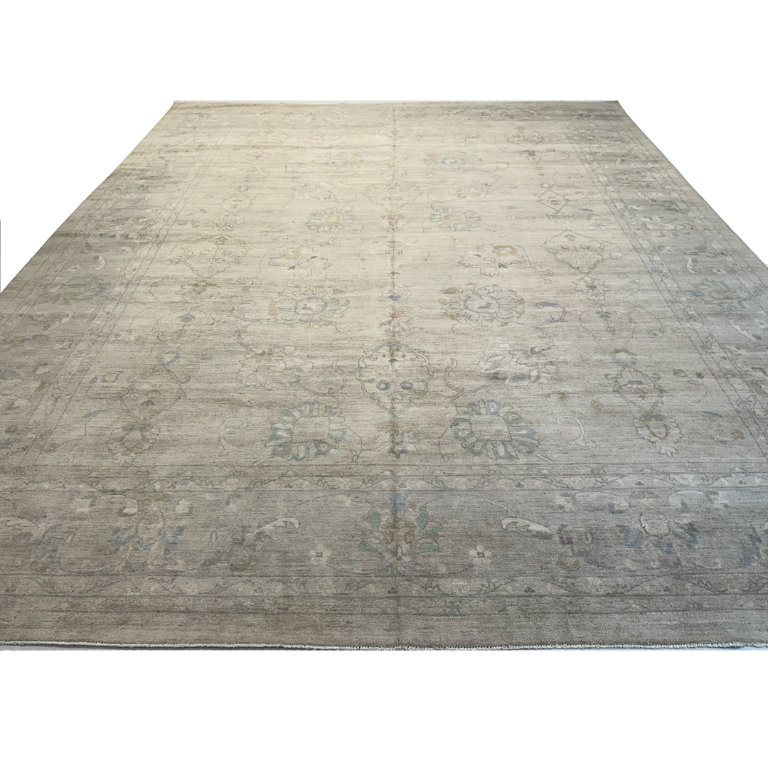 This breathtaking oversized Afghan hand-knotted rug draws inspiration from classic Peshawar and Oushak weaving traditions. The composition features an elegant, all-over network of sprawling botanical vines and oversized, stylized floral palmettes. What makes this piece truly exceptional is its magnificent, whisper-soft presentation; the classic motifs appear as a delicate, textural watermark that floats organically across the canvas. The ethereal, nearly monochromatic color palette is a serene symphony of luminous ivory, pale greige, warm sand, and soft taupe, allowing it to blend seamlessly into a wide variety of interiors. Measuring a monumental 12′ x 14’8″ ft., this premium wool carpet is an extraordinary foundational anchor for the Rouzati website. It is flawlessly scaled to bring a sense of calm, sweeping elegance to your grandest space.