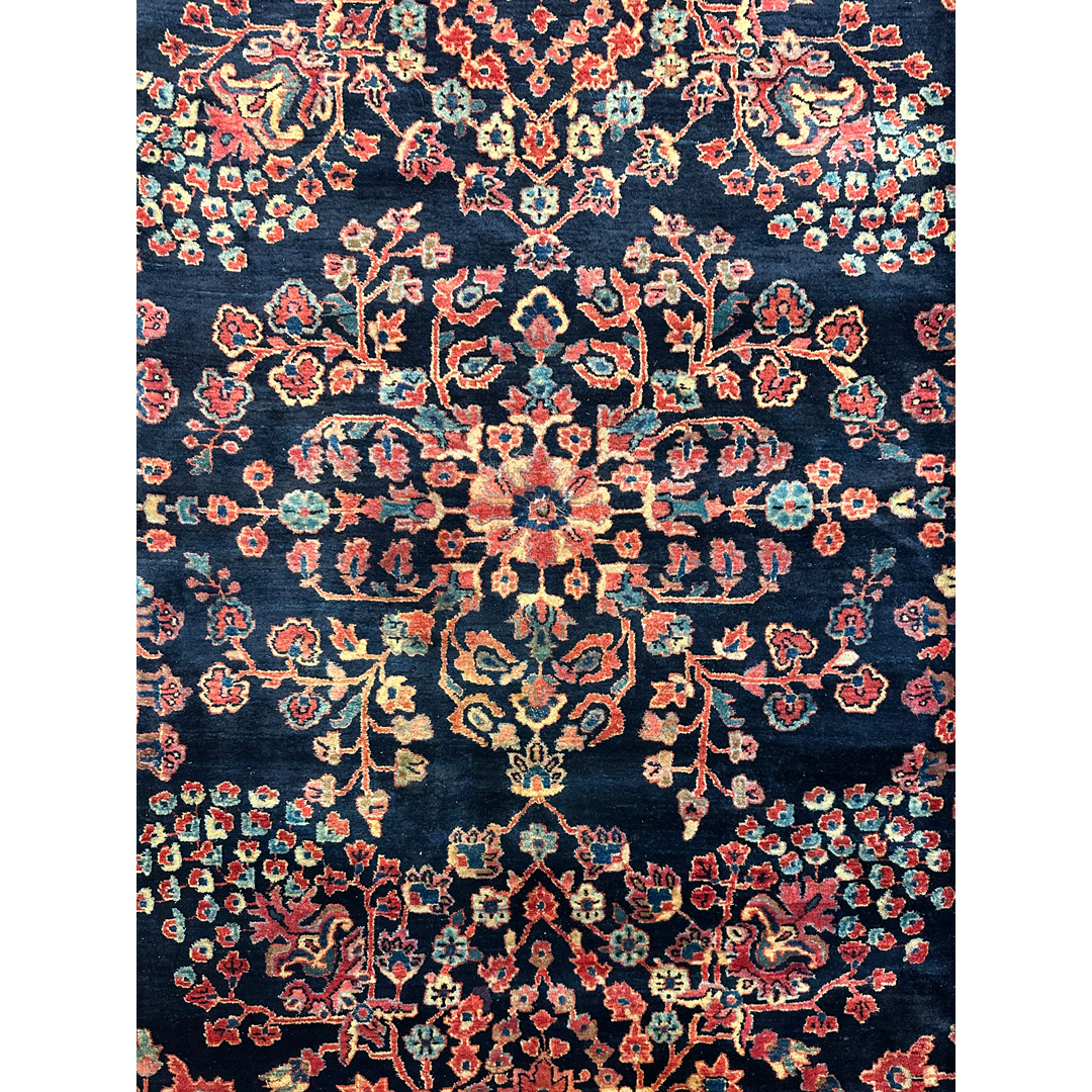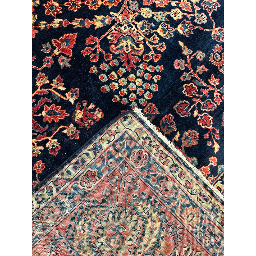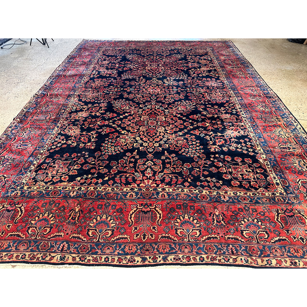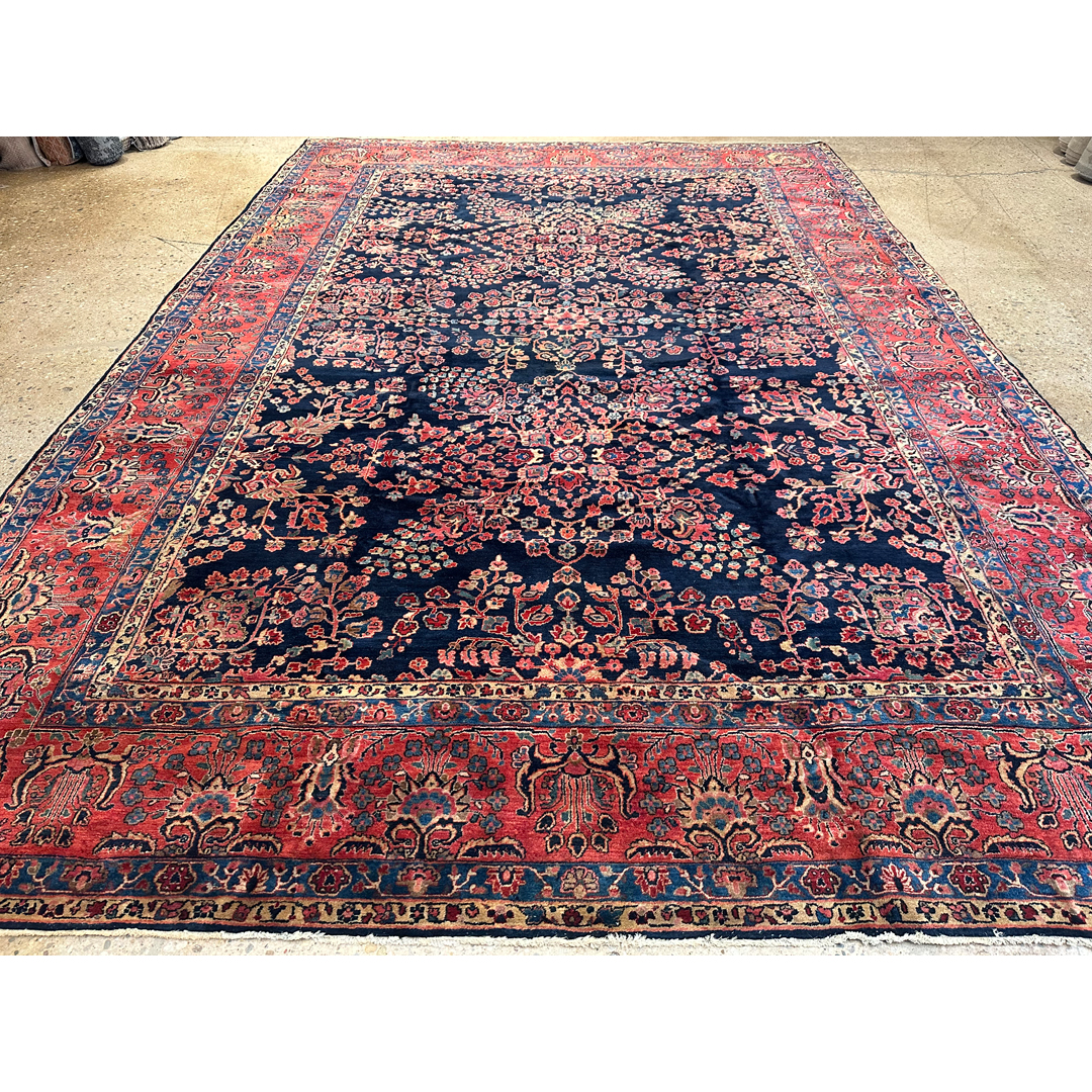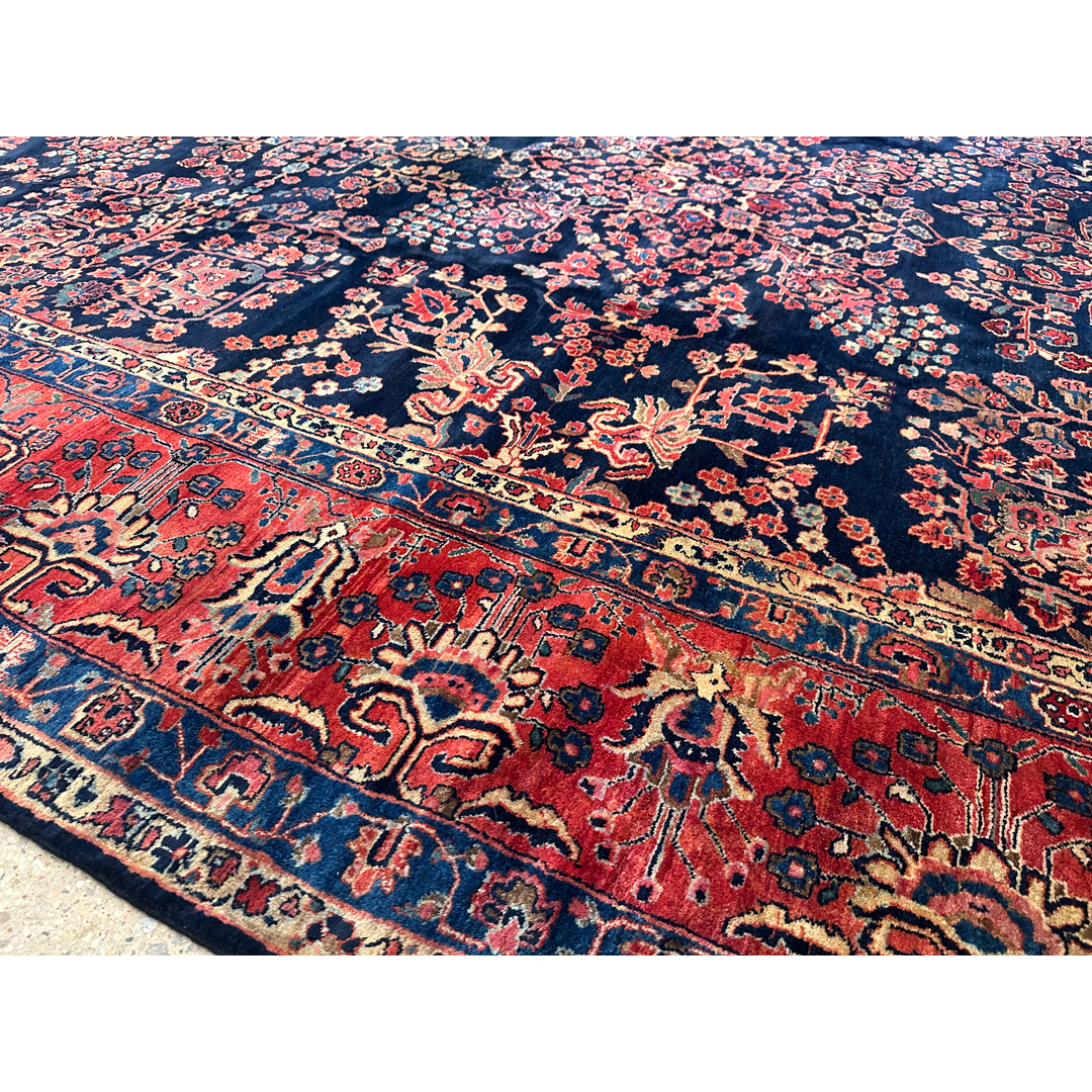 This magnificent, museum-quality antique Persian carpet is a breathtaking masterpiece of the 1920s, representing the legendary Sarouk weaving tradition. The majestic composition is defined by a dense, rhythmic array of classic detached floral sprays, blooming palmettes, and sweeping botanical vines. What makes this piece an extraordinary rarity is its deeply saturated, midnight navy blue field. While the vast majority of 1920s American-market Sarouks were woven with ubiquitous salmon or rose-red backgrounds, discovering a rich indigo field of this scale is a unicorn for serious collectors. These vibrant, jewel-toned floral motifs pop with spellbinding clarity and depth against the dark background, perfectly framed by a wide, contrasting crimson border.