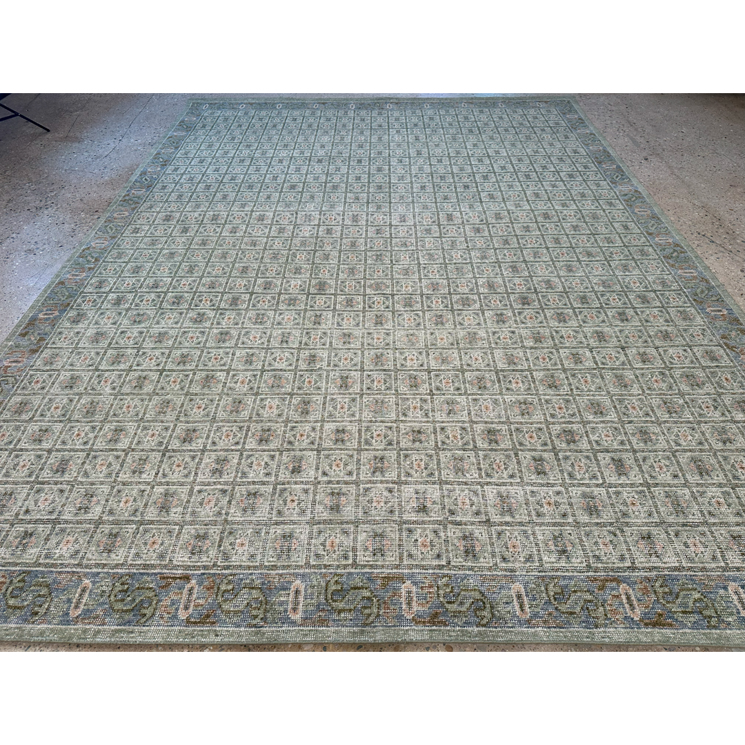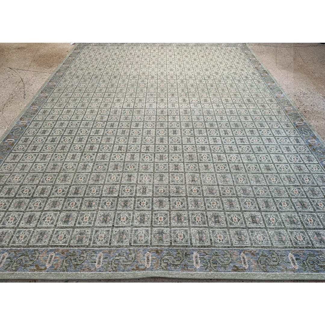 Create a foundation of quiet elegance and architectural order with this stunning transitional geometric rug. Measuring 9’1″ x 12′ ft., this 9×12 area rug is perfectly scaled for a living room or dining area. It showcases a sophisticated all-over pattern of repeating geometric rosettes arranged in a precise, tile-like grid. Its serene, low-contrast color palette blends a soft, earthy sage gray with a luminous creamy ivory background, creating a calm and cohesive look. Expertly crafted with a durable, inviting pile, it brings a refined and harmonious feel that complements both modern and traditional interiors with its timeless appeal.