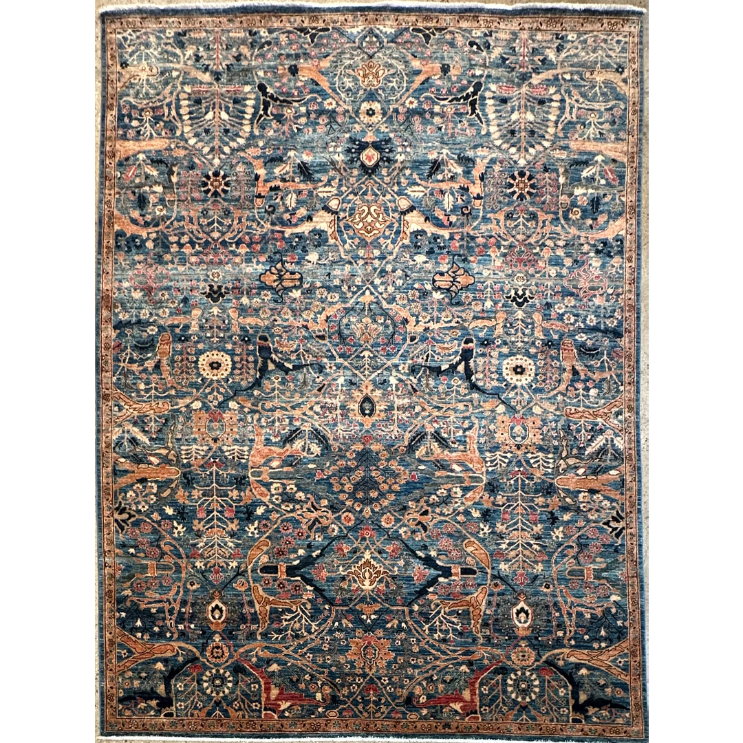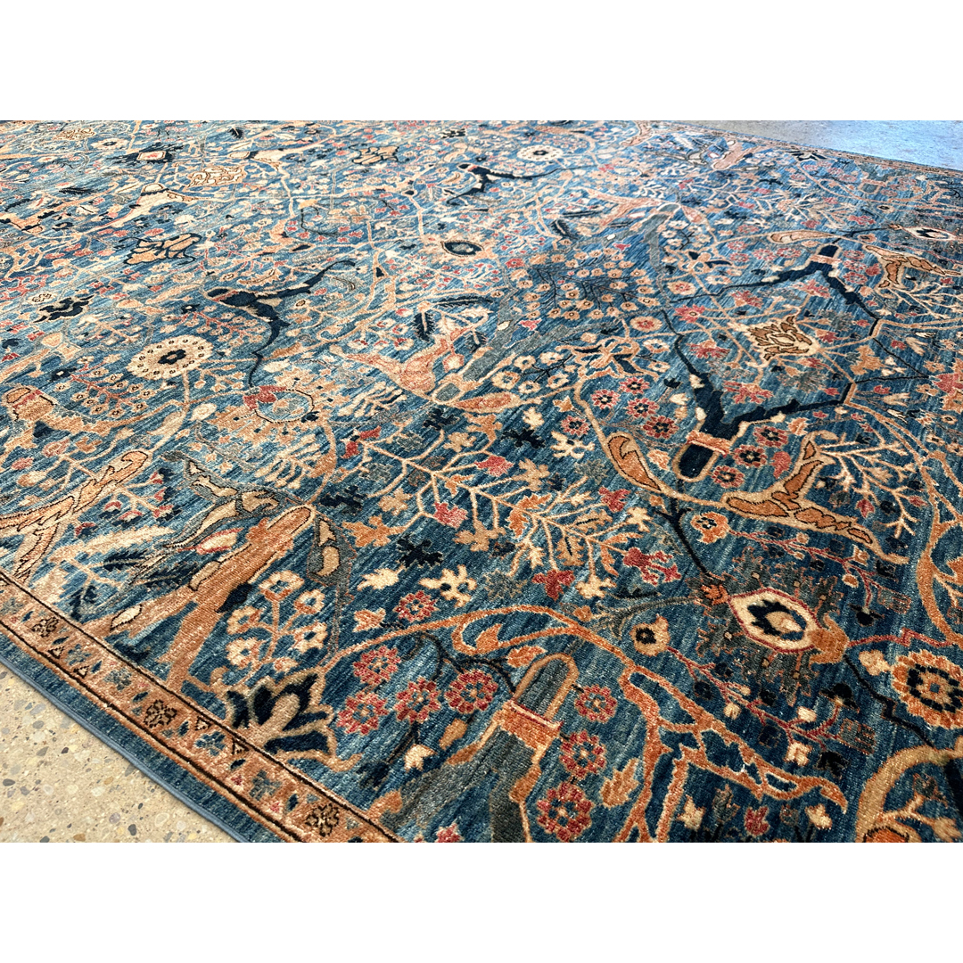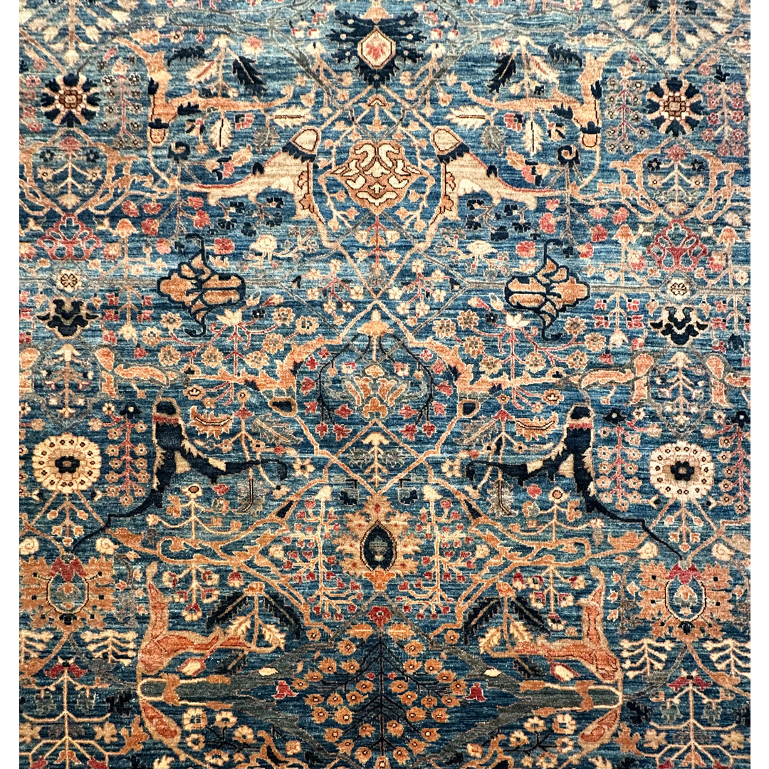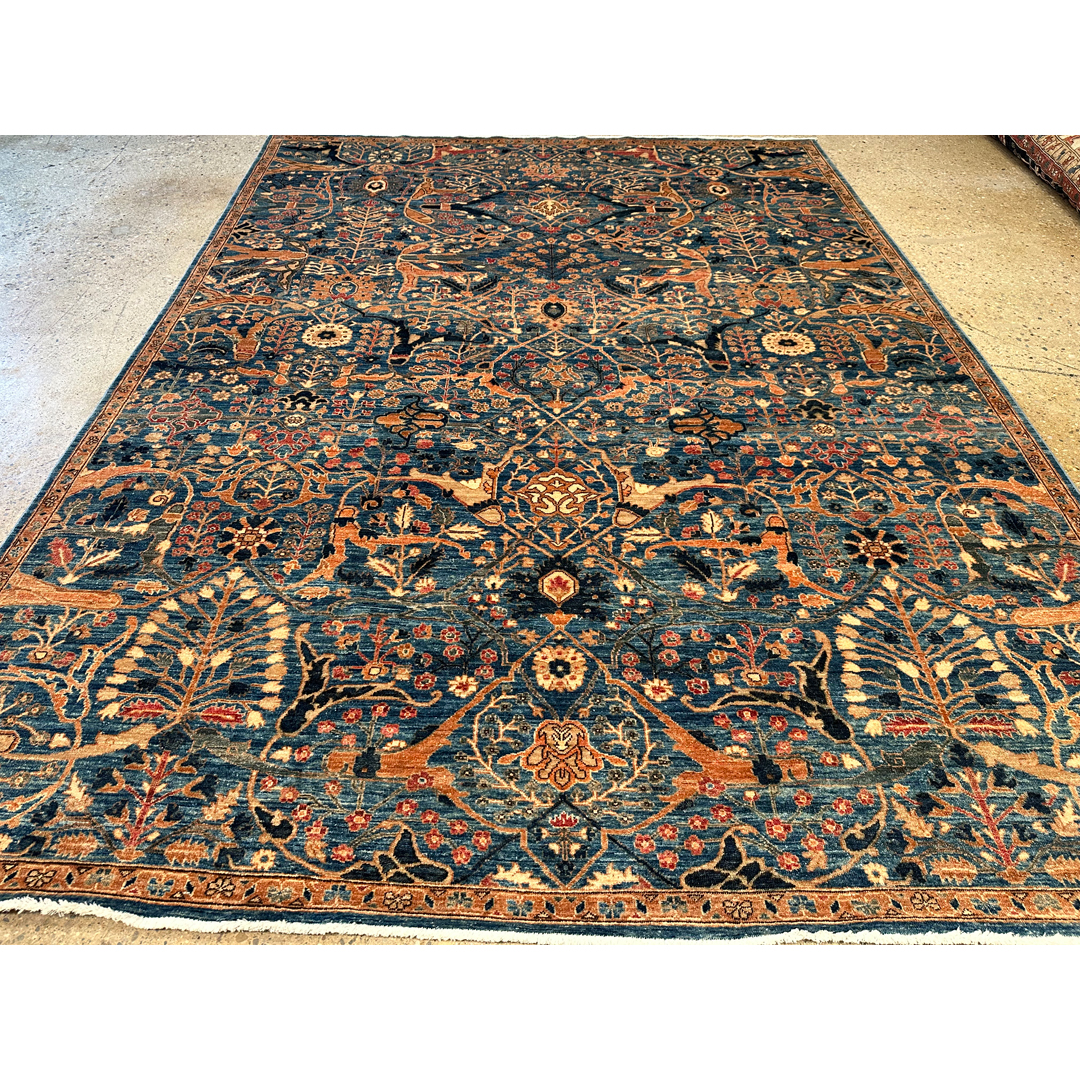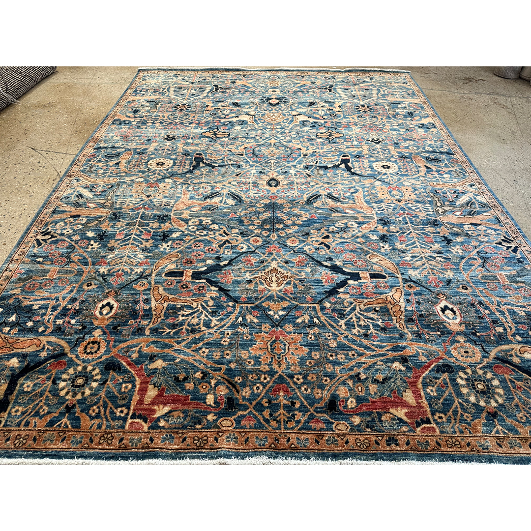 Create a foundation of timeless artistry and refined warmth with this stunning Garous Bidjar–inspired rug, newly made in Afghanistan. Measuring 9’ x 12′ ft., this generously scaled area rug is ideal for anchoring a living room, dining area, or primary suite with quiet sophistication. It showcases an intricate, all-over garden design of scrolling vines, floral medallions, and stylized birds, arranged in a balanced, symmetrical composition that feels both ornate and harmonious. Its rich, jewel-toned palette blends deep slate blue and denim tones with soft terracotta, sand, and subtle ivory highlights, creating depth without overwhelming the space. Expertly hand-knotted with a dense, durable pile, it offers a luxurious feel underfoot while delivering enduring beauty that bridges classic Persian elegance and elevated transitional interiors.