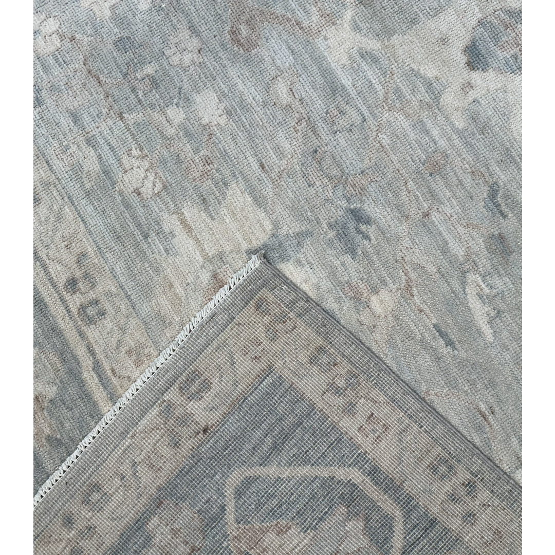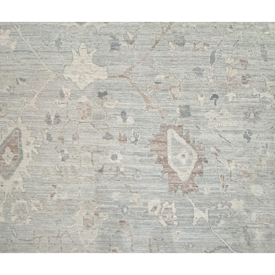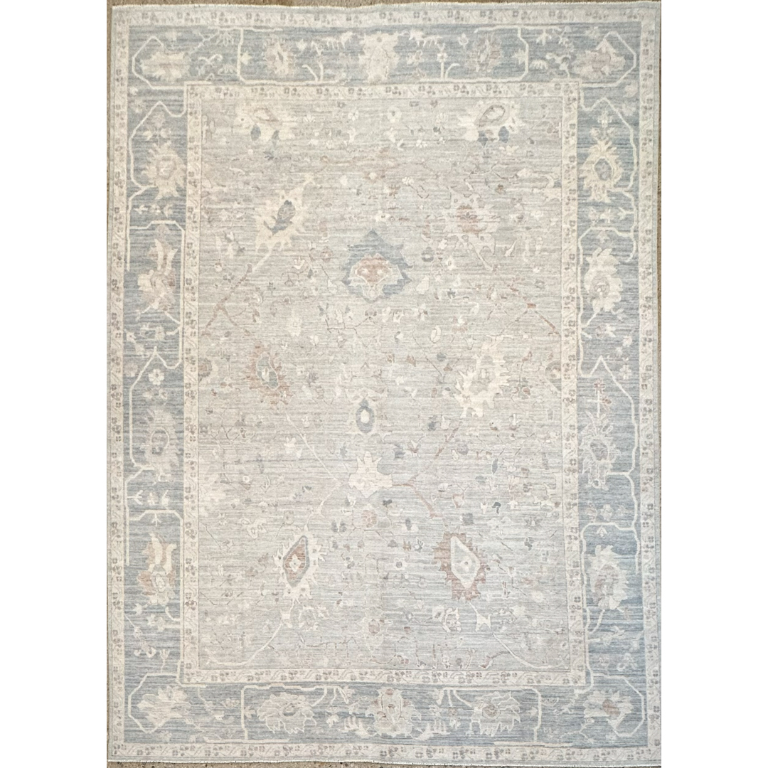 Refresh your home with the serene elegance of this attractive 10’2″ x 13’7″ ft. Afghan rug featuring a transitional Oushak design. The hand-knotted pile, woven in India, presents a luminous, pale silvery-grey field that creates a spacious and airy atmosphere. Scattered across this open background are stylized floral motifs and vine segments rendered in soft shades of beige, cream, and faint blue, maintaining a sophisticated tone-on-tone aesthetic. A matching light blue-grey border filled with a simple geometric meander frames the composition, adding gentle structure without overpowering the delicate color palette. This rug is an excellent choice for a modern farmhouse, a coastal interior, or a master suite seeking a calm and neutral foundation.