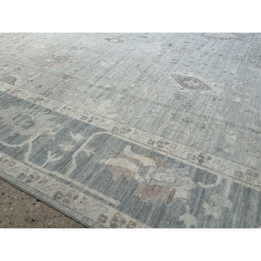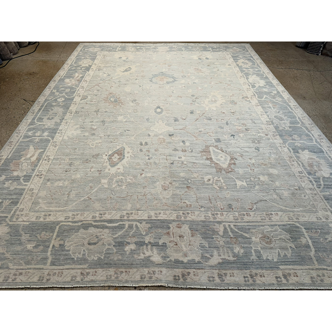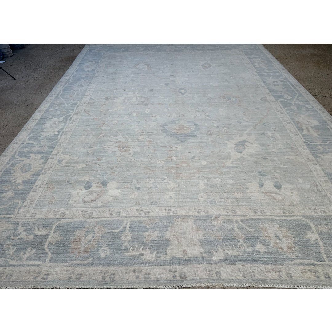 Refresh your home with the serene elegance of this attractive 10’2″ x 13’7″ ft. Afghan rug featuring a transitional Oushak design. The hand-knotted pile, woven in India, presents a luminous, pale silvery-grey field that creates a spacious and airy atmosphere. Scattered across this open background are stylized floral motifs and vine segments rendered in soft shades of beige, cream, and faint blue, maintaining a sophisticated tone-on-tone aesthetic. A matching light blue-grey border filled with a simple geometric meander frames the composition, adding gentle structure without overpowering the delicate color palette. This rug is an excellent choice for a modern farmhouse, a coastal interior, or a master suite seeking a calm and neutral foundation.