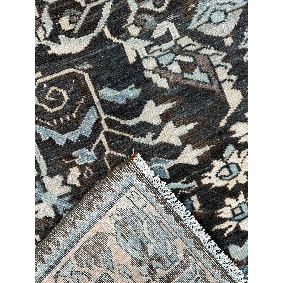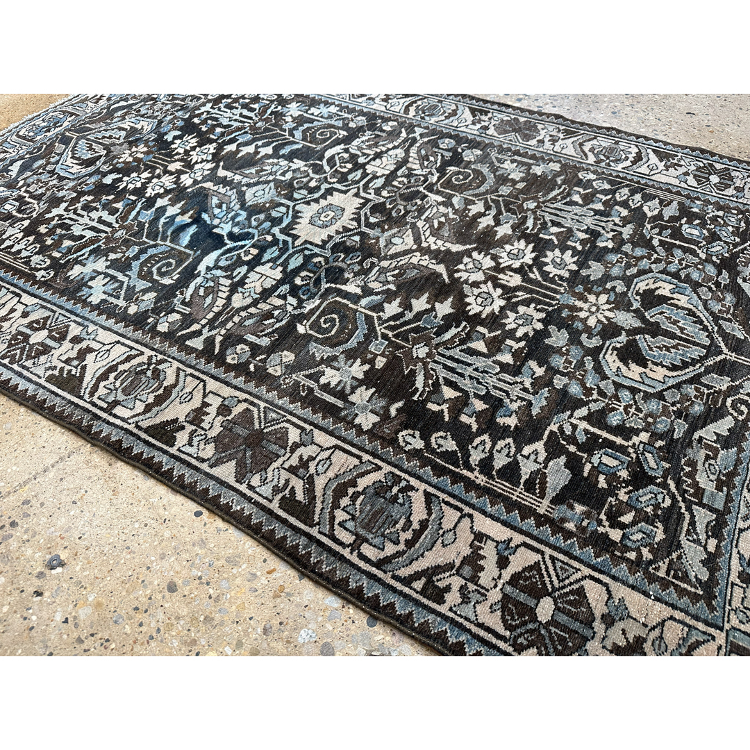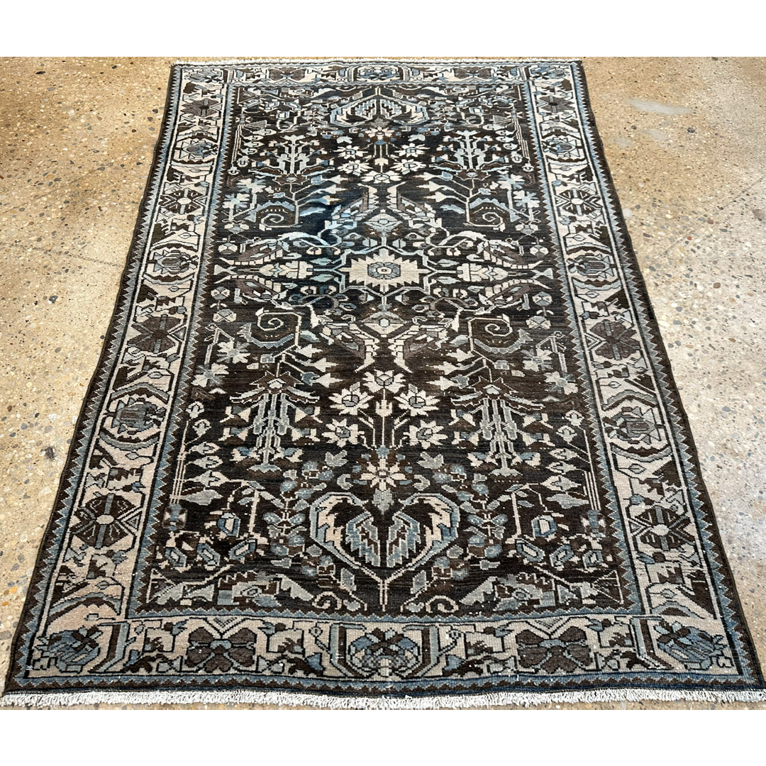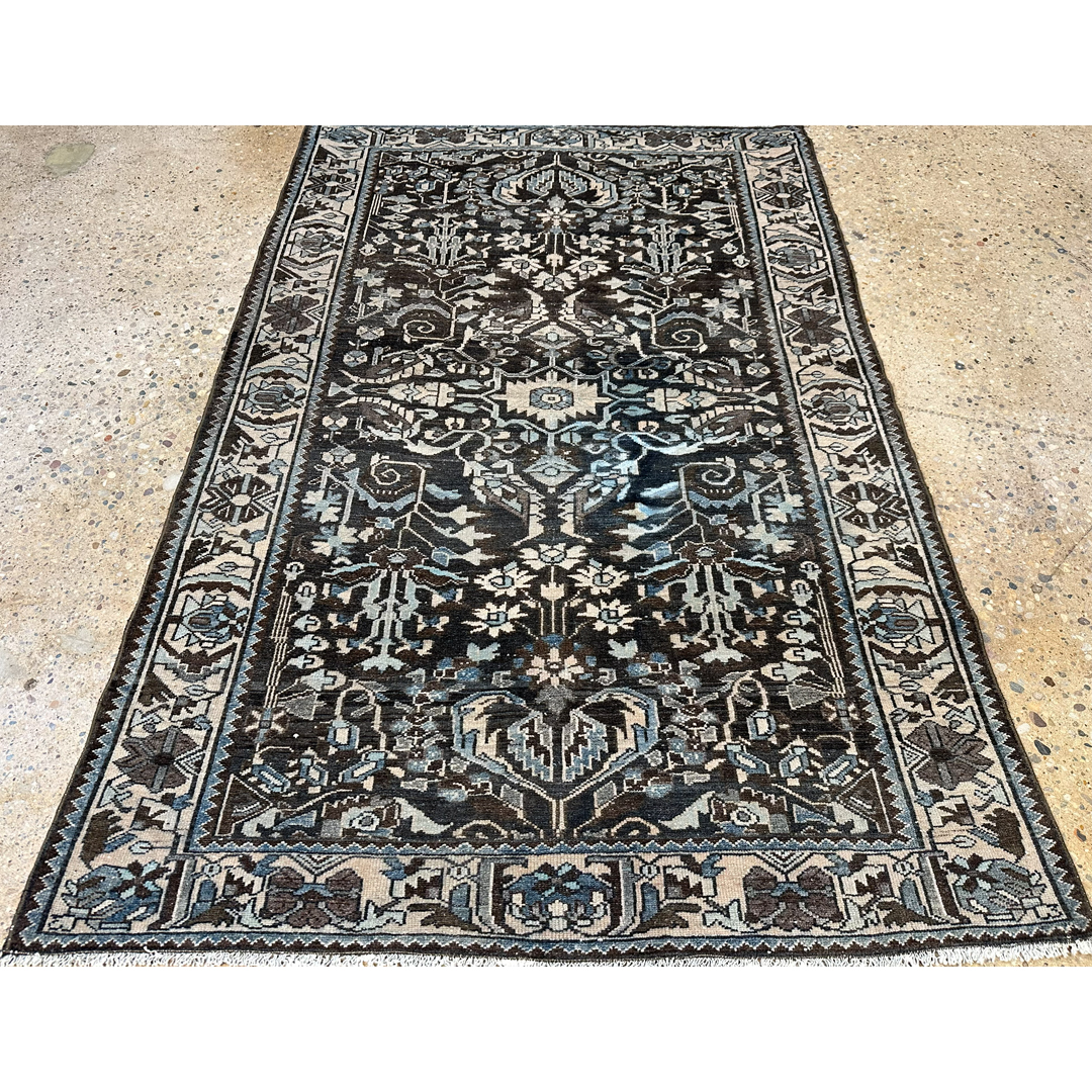 Experience the timeless elegance of this beautiful 4’3″ x 6’4″ ft. antique Persian Bakhtiari rug, a genuine treasure from the 1920s. Expertly hand-knotted with incredible attention to detail, this piece features a striking, deep charcoal or chocolate brown field that serves as a dramatic backdrop for a lush, stylized garden design. Intricate floral motifs, scrolling vines, and palmettes in shades of slate blue, ivory, and soft gray dance across the surface, creating a sophisticated play of light and dark. Framed by a complex, multi-layered border in contrasting ivory and brown, this rug is a magnificent example of tribal artistry, perfect for adding depth and historic character to a reading nook, entryway, or bedside.