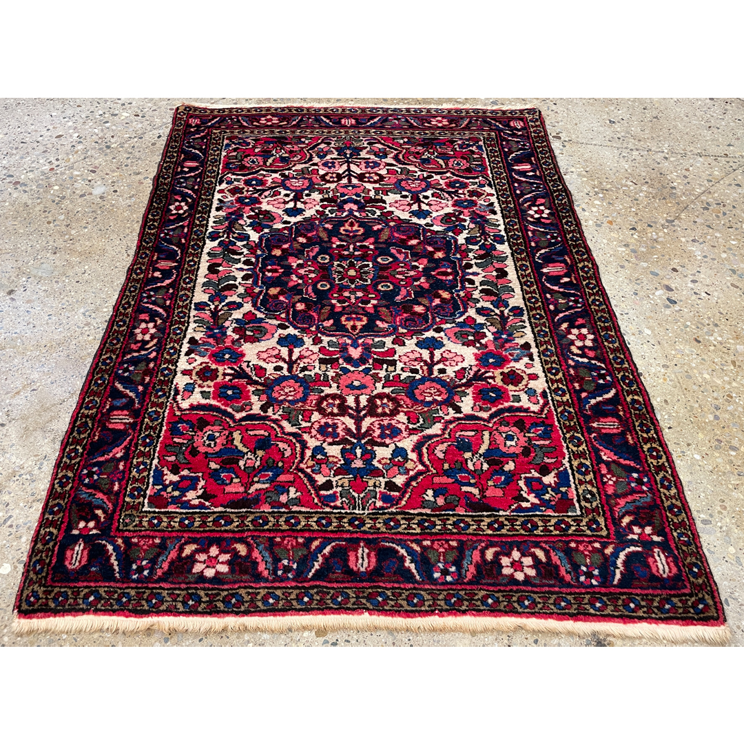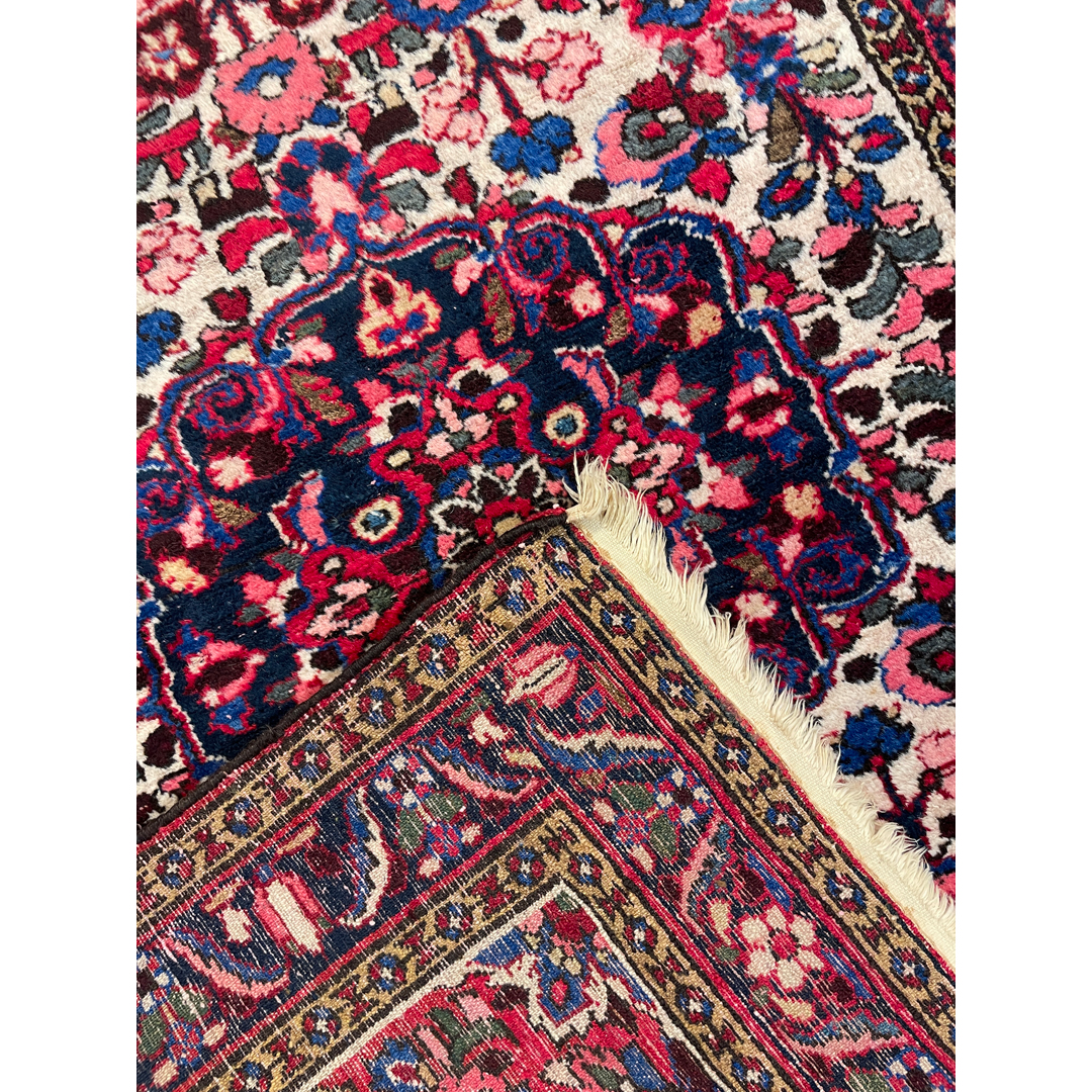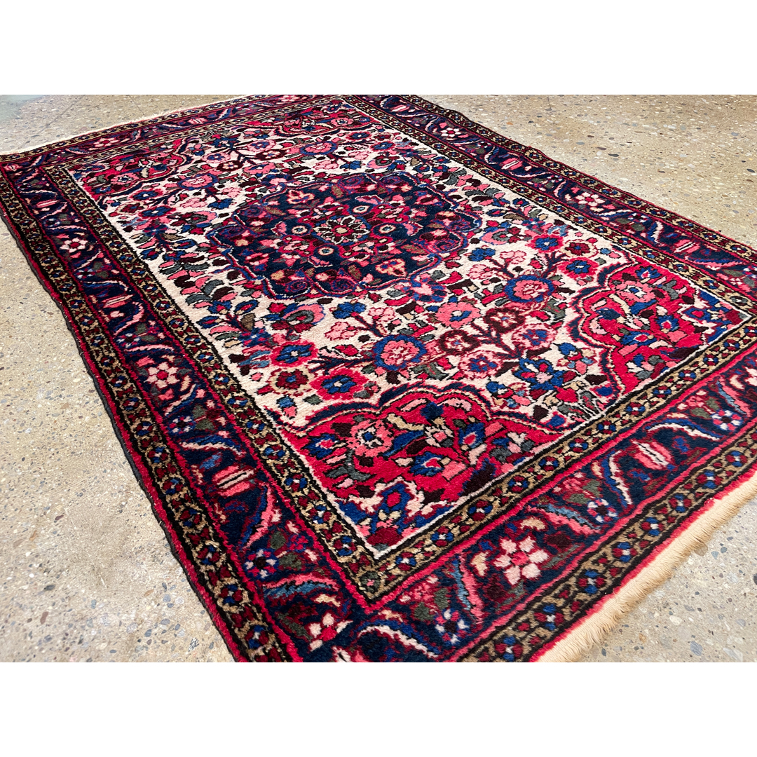 Add a vibrant touch of history to your space with this beautiful 3’6″ x 5′ ft. antique Persian Borchalou rug, a genuine Hamadan weaving from the 1920s. Expertly hand-knotted, this rug features a lush, floral Sarouk Lilihan design, showcasing a dense array of blooming roses and bouquets. The central medallion and surrounding field are awash in rich, jewel-toned hues of deep pink, magenta, and navy blue, set against a creamy ivory background. Framed by a classic navy border with scrolling floral vines, this thick and plush rug offers both luxurious comfort and timeless elegance, making it an ideal accent for a bedroom, entryway, or cozy reading nook.