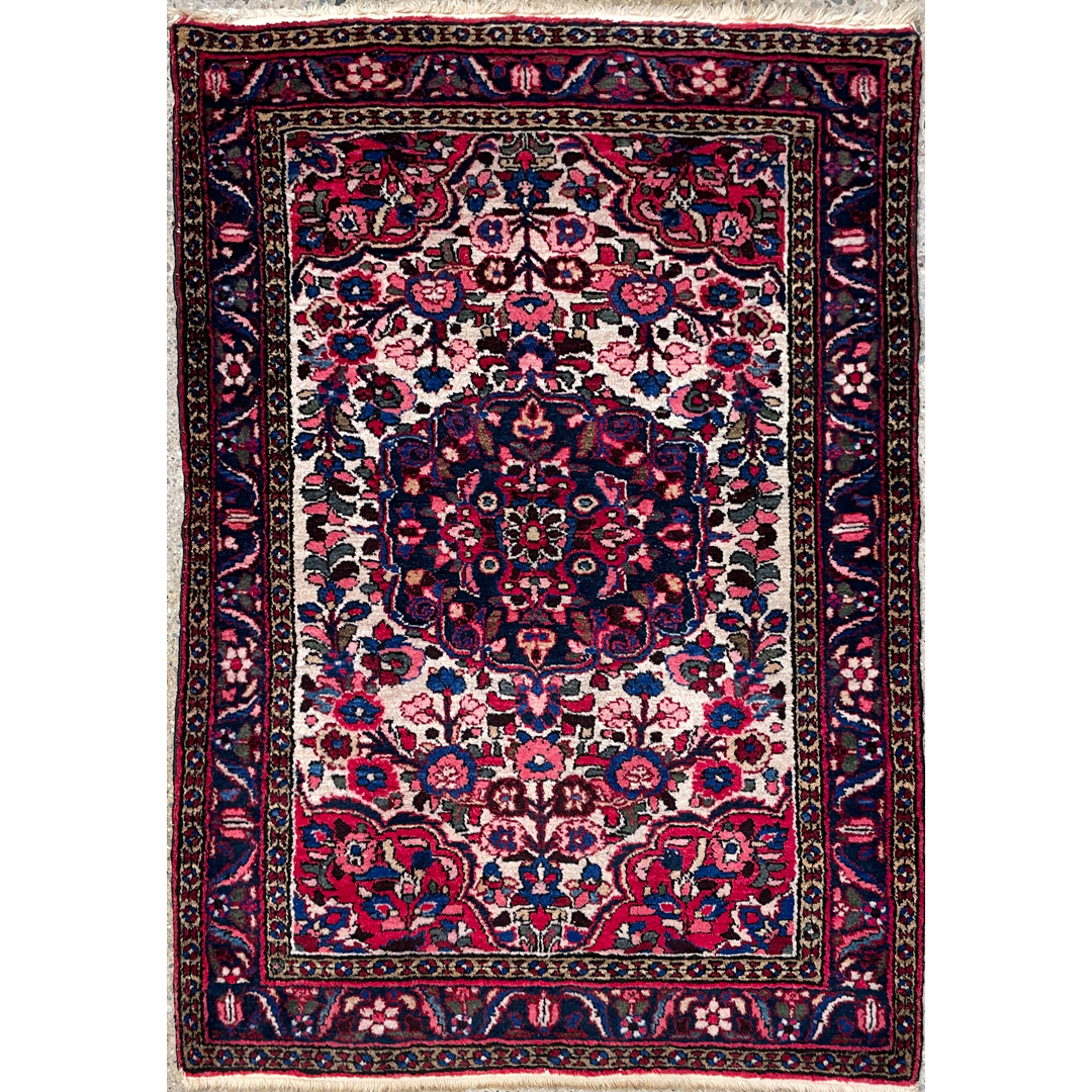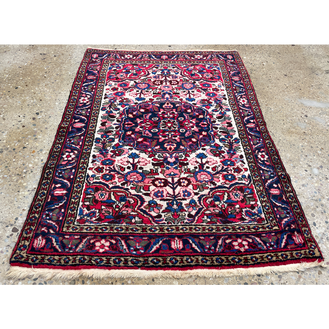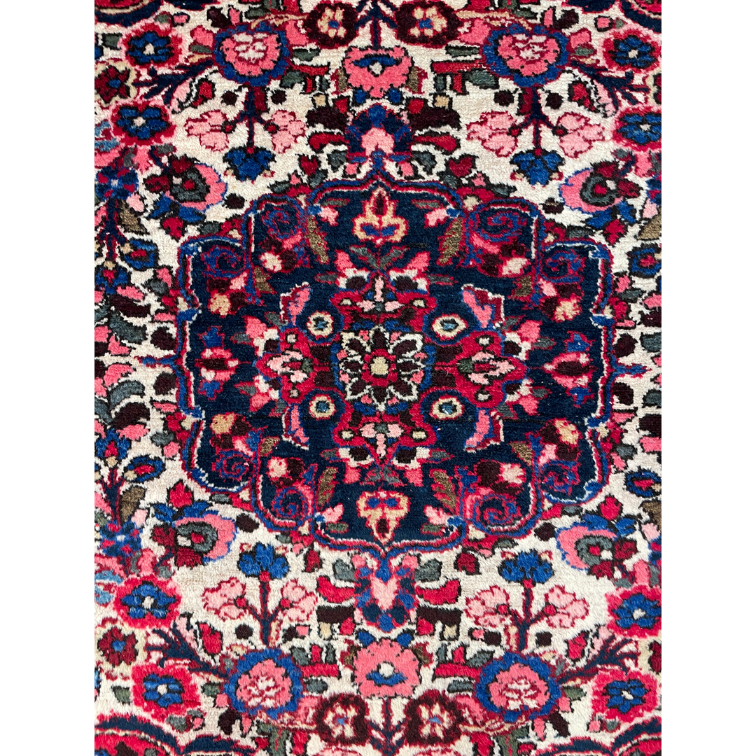 Add a vibrant touch of history to your space with this beautiful 3’6″ x 5′ ft. antique Persian Borchalou rug, a genuine Hamadan weaving from the 1920s. Expertly hand-knotted, this rug features a lush, floral Sarouk Lilihan design, showcasing a dense array of blooming roses and bouquets. The central medallion and surrounding field are awash in rich, jewel-toned hues of deep pink, magenta, and navy blue, set against a creamy ivory background. Framed by a classic navy border with scrolling floral vines, this thick and plush rug offers both luxurious comfort and timeless elegance, making it an ideal accent for a bedroom, entryway, or cozy reading nook.