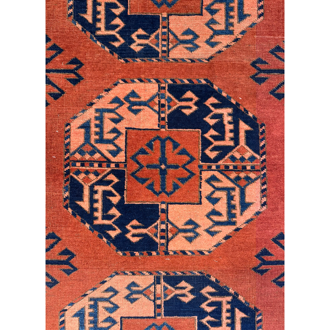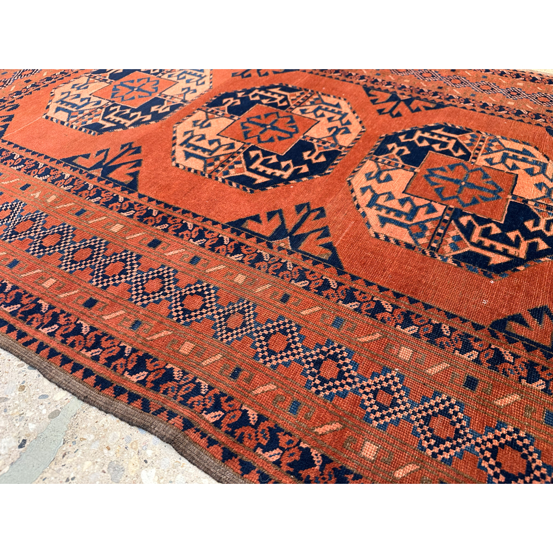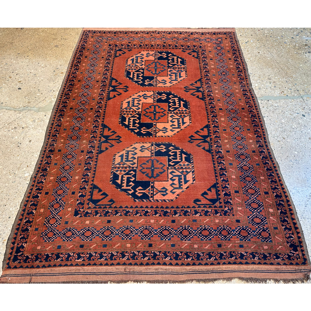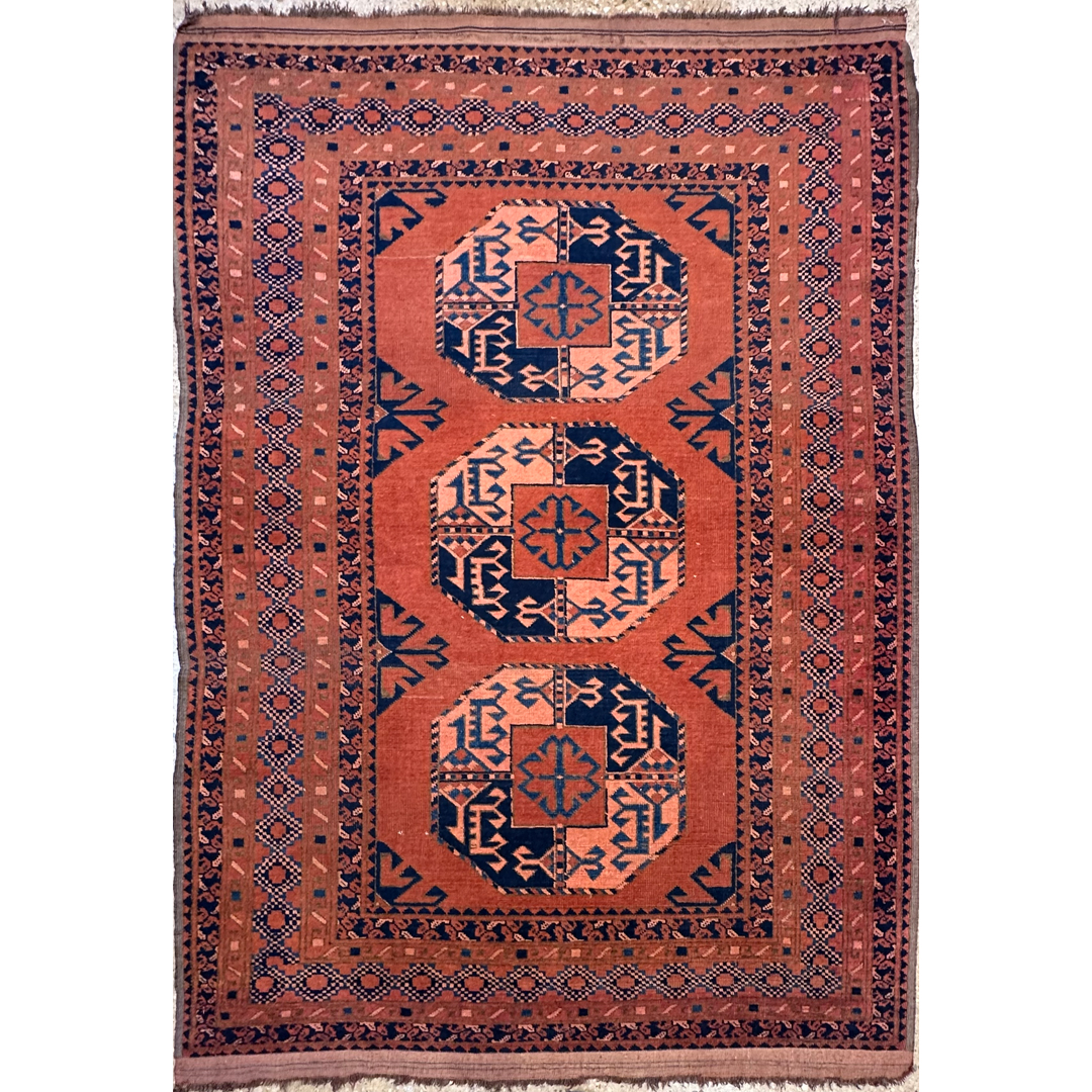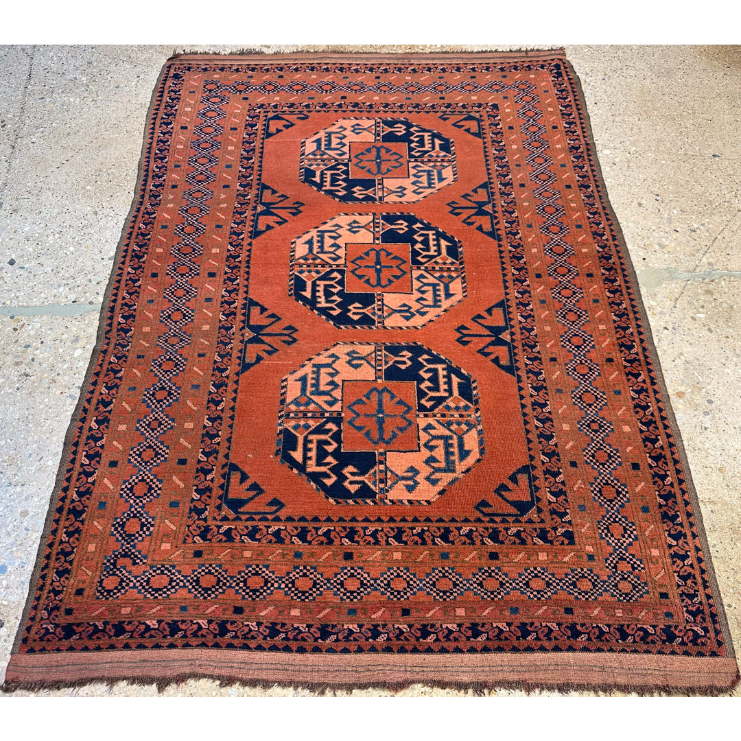 Bring the warmth of Central Asian heritage into your home with this blissful 4′ x 5’8″ antique Afghan Bokhara rug. A genuine hand-knotted piece from the 1950s, this rug features the iconic tribal gul design, showcasing a vertical column of three large, octagonal medallions. The composition is anchored by a rich, terracotta rust field, while the geometric medallions are detailed in contrasting shades of deep midnight blue and soft apricot. Framed by multiple intricate borders filled with traditional geometric motifs, this durable wool rug offers a timeless aesthetic that adds comfort and historic character to a study, entryway, or reading nook.
