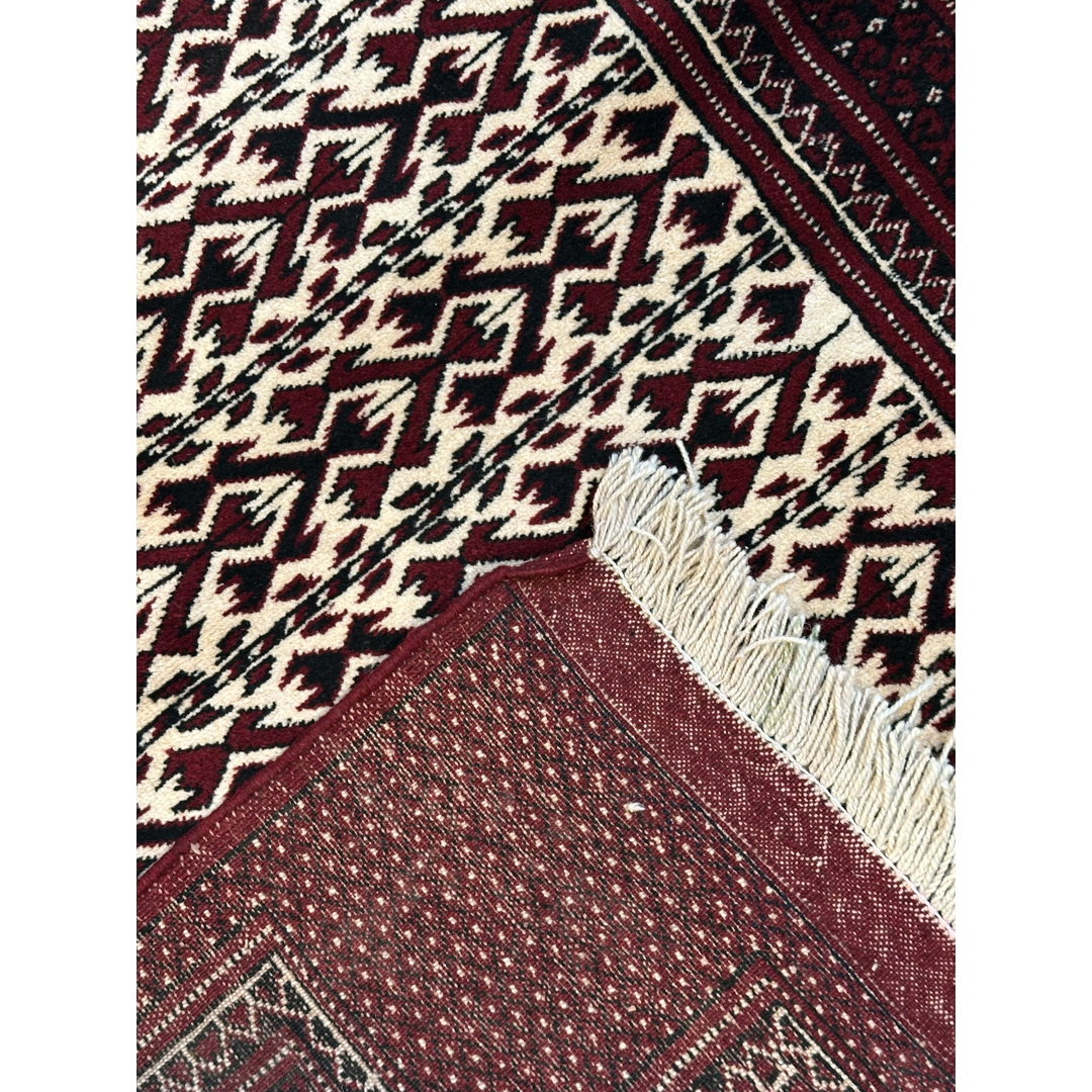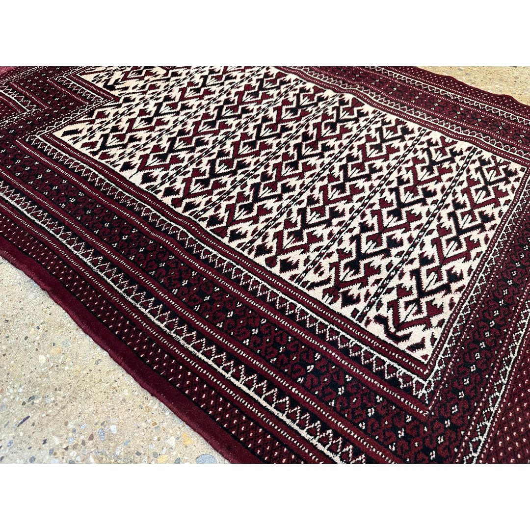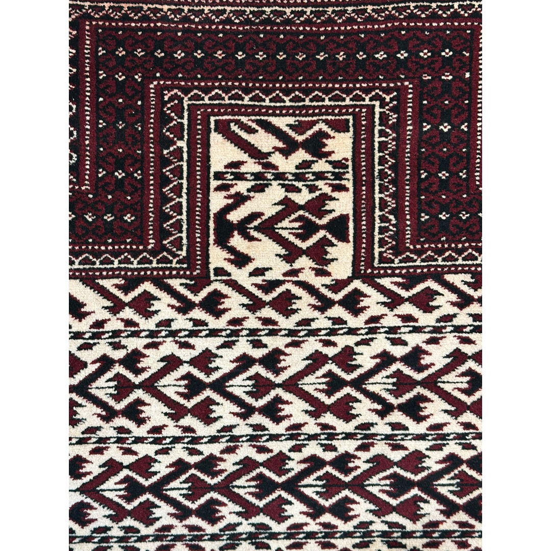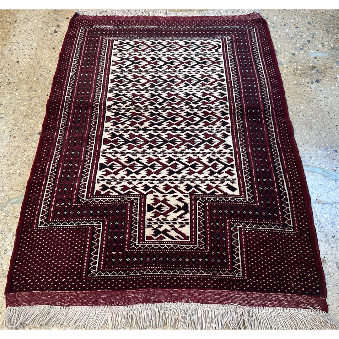 Bring a sense of sacred history and tribal artistry to your home with this bold 3’2″ x 4’5″ ft. antique Persian Balouch rug. Hand-knotted in the 1940s, this distinctive piece features a classic prayer design, characterized by a stepped mihrab arch at the top intended to direct prayer. The composition is defined by a striking high-contrast palette, where a luminous ivory central field is densely packed with repeating geometric tree-of-life motifs rendered in deep charcoal and rust. This bright interior is dramatically framed by deep burgundy shoulders and borders featuring a stippled texture, creating a powerful visual focus that draws the eye inward. With its rich symbolism and compact size, this authentic collector’s item is versatile enough to be used as a striking wall hanging, a dedicated meditation mat, or a unique accent in a private study.