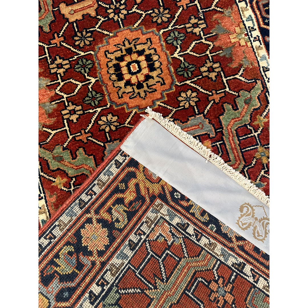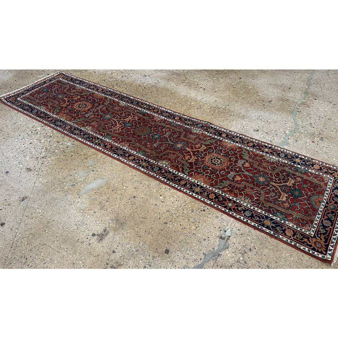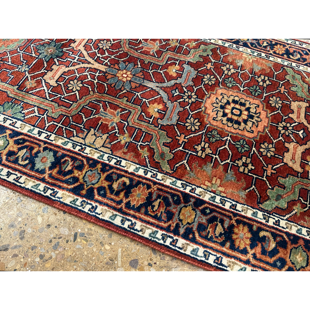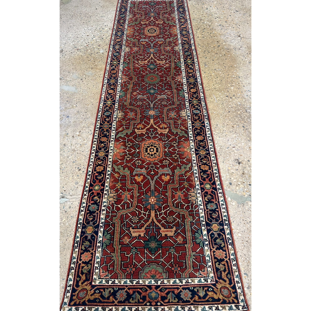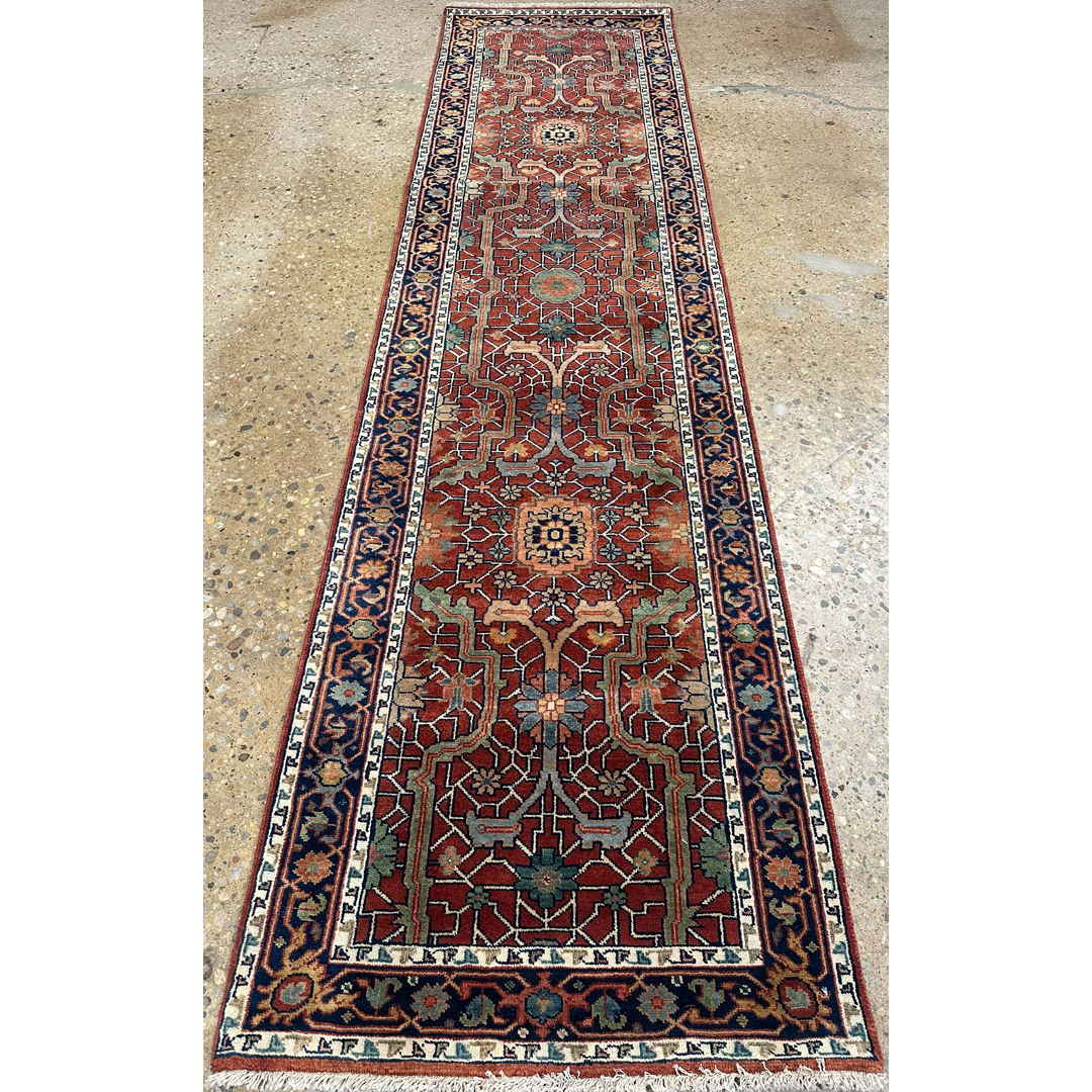 Make a striking impression in your hallway with this bold and beautiful 2’6″ x 9’10” ft. runner. Expertly hand-knotted with exceptional durability, this piece showcases the distinct geometric style of a Heriz design. A series of crisp, angular medallions and stylized botanical motifs march down a rich, rust-red field. Accents of deep navy blue, slate blue, and sage green add depth and contrast, while a classic navy border frames the energetic pattern. Perfect for adding warmth, character, and a touch of historic artistry to any entryway or narrow space.