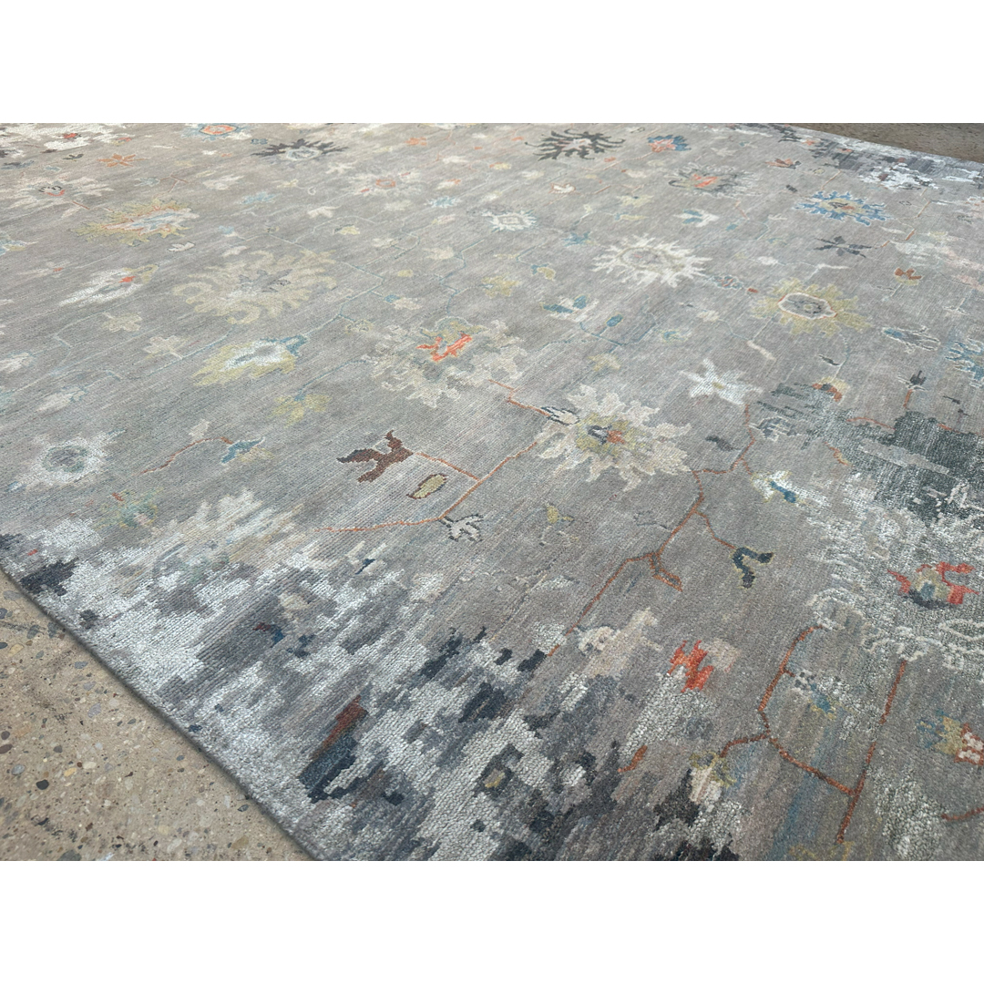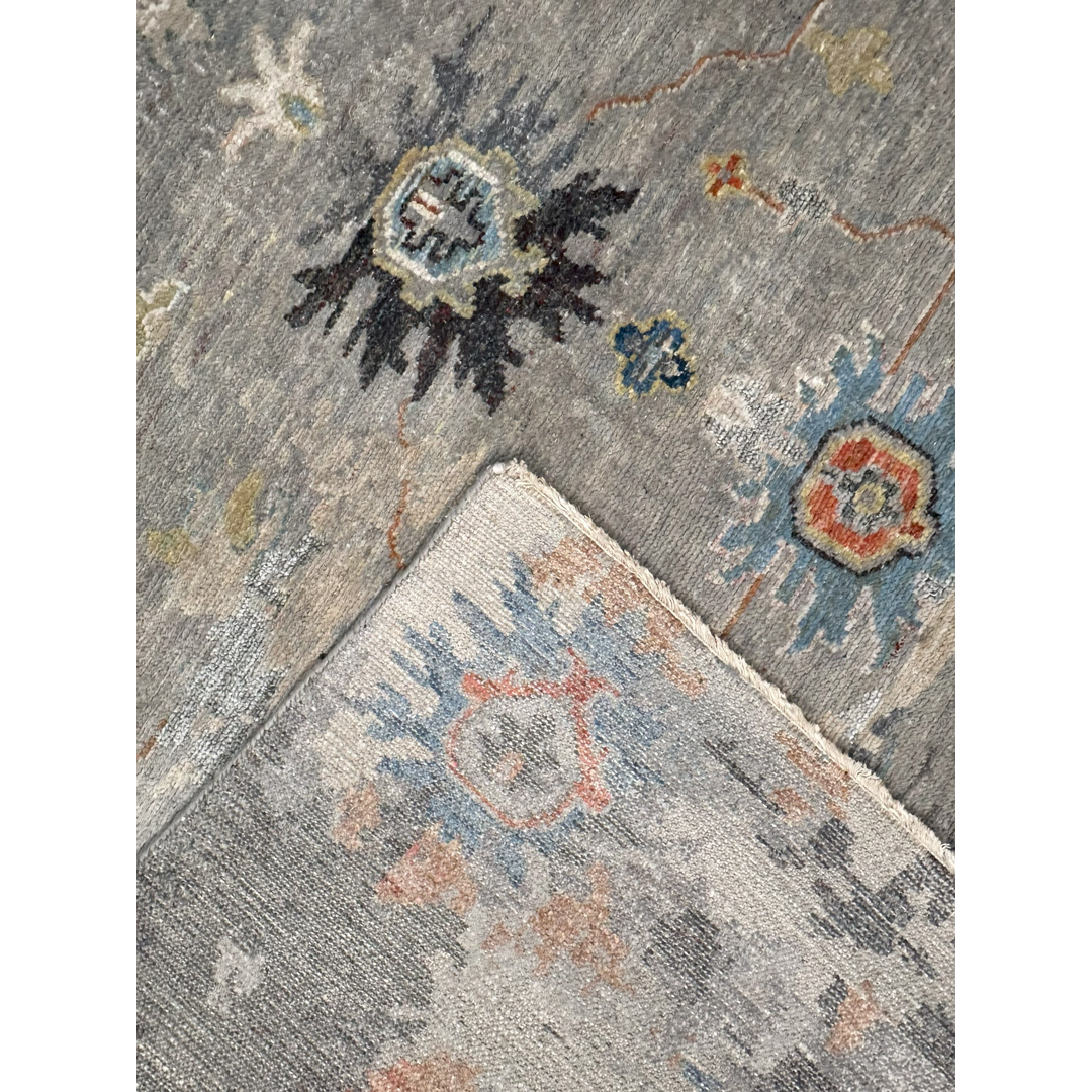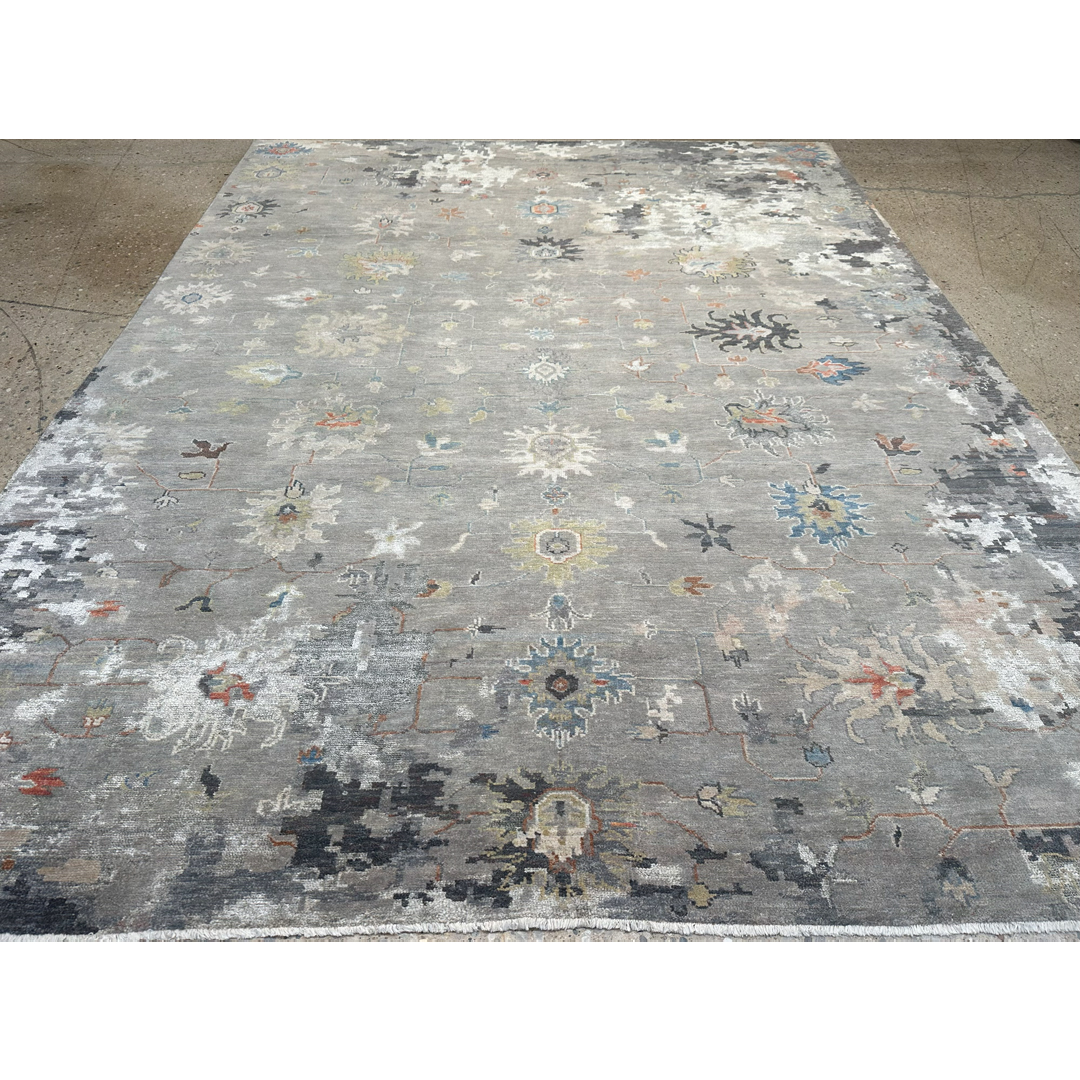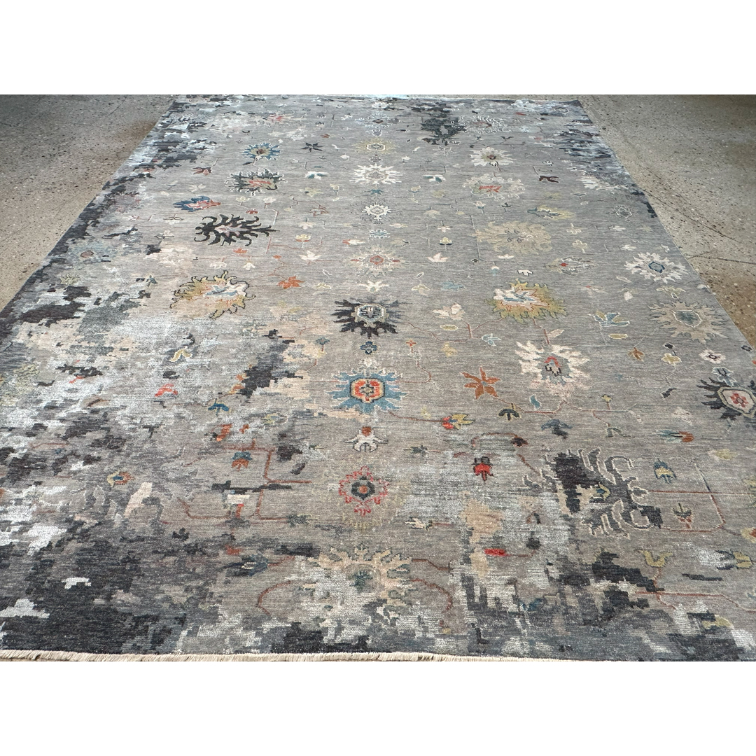 Introduce a bold, artistic element to your home with this stunning transitional rug from the Caprice Collection. Inspired by a classic Turkish Oushak design, this 9’1″ x 11’11” ft. area rug is a masterwork of modern interpretation. Its versatile, multi-tonal grey field is adorned with a scattered, all-over pattern of stylized floral motifs, brought to life with sophisticated pops of blue, yellow, and rust. The rug’s most captivating feature is its dramatic abstract distressing, with bold, artistic patches of dark charcoal and bright ivory that create a unique, deconstructed frame. Perfectly suited for a contemporary living room or a chic dining area, this 9×12 rug is a true piece of floor art, blending timeless inspiration with a fearless, modern edge.