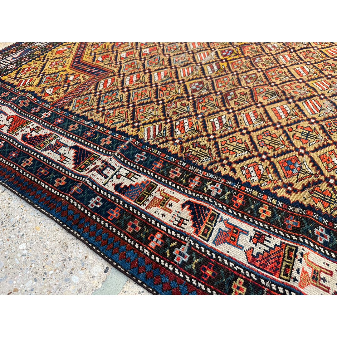 Secure a rare masterpiece of Caucasian weaving with this dashing 4’6″ x 4’10” ft. antique Dagestan rug. Dating back to the 1860s, this genuine collector’s item features a distinctive prayer design set against a spectacular, golden-yellow field, a color highly prized by connoisseurs. The surface is covered in a precise, all-over lattice of polychrome diamond motifs, each containing intricate geometric florets in shades of rust, ivory, and blue. A crisp ivory border filled with stylized abstract symbols and latch-hooks frames the composition, contrasting beautifully with the deep indigo blue spandrels near the angular prayer arch. This exceptional hand-knotted rug represents the pinnacle of 19th-century village artistry, making it an ideal choice for a wall hanging or a focal point in a curated library or study.