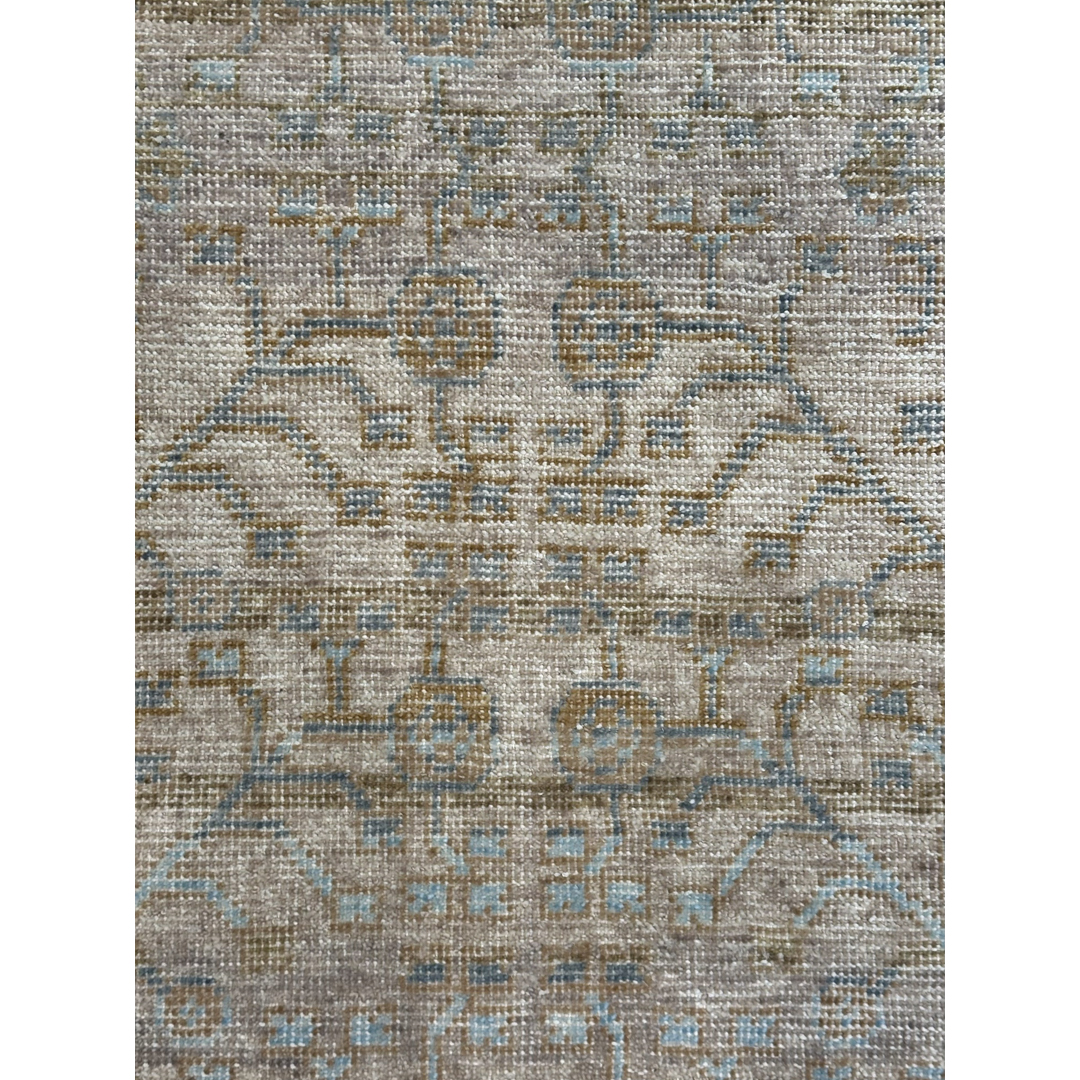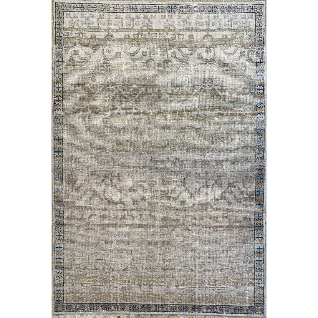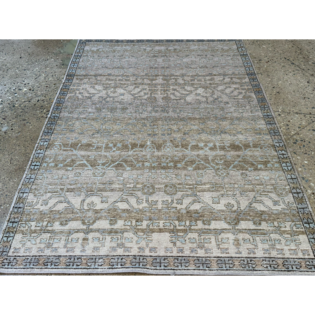 Add a layer of worldly sophistication to your home with this dazzling 4’2″ x 6’3″ ft. vintage rug featuring a classic Khotan design. Expertly hand-knotted and intentionally distressed, this piece captures the romance of the Silk Road with its faded, ghost-like appearance. The design features horizontal bands of stylized geometric motifs and abstract botanical forms, often interpreted as pomegranates, rendered in a soothing, earthy palette of sandy beige, soft taupe, and whispers of pale blue. Framed by a geometric border that creates a subtle frame, this low-pile rug offers a relaxed, shabby-chic aesthetic perfect for adding texture and history to a study, bedroom, or eclectic living area without overpowering the decor.