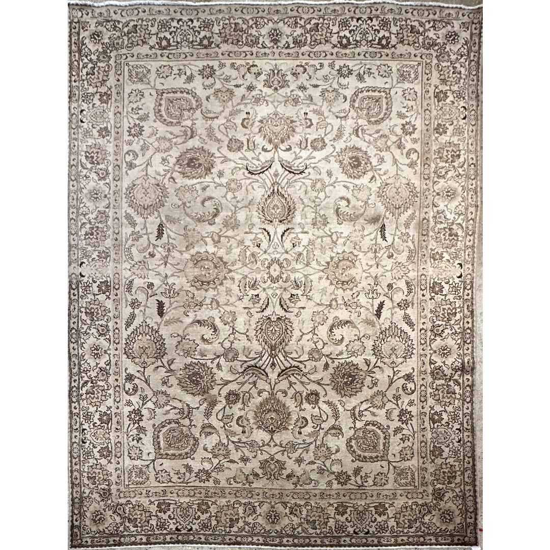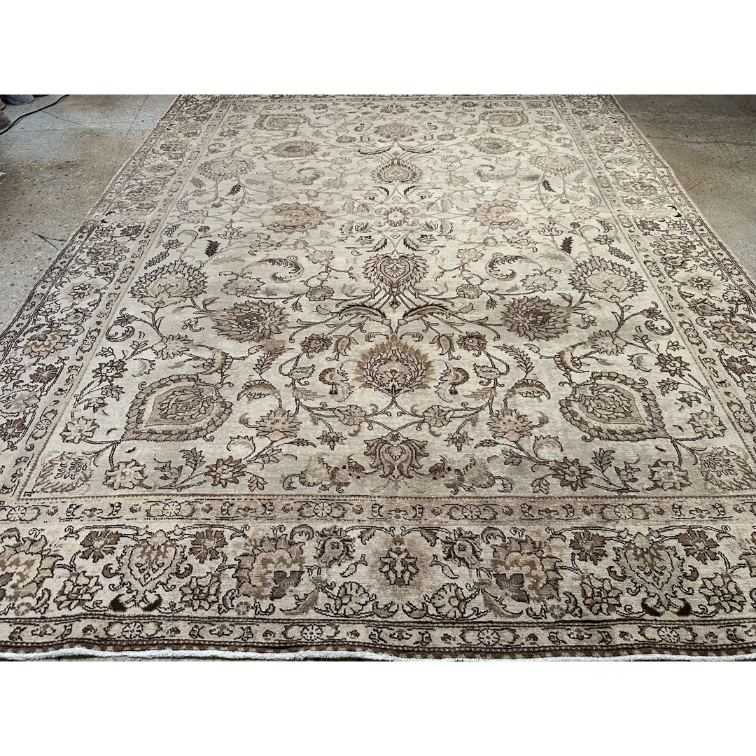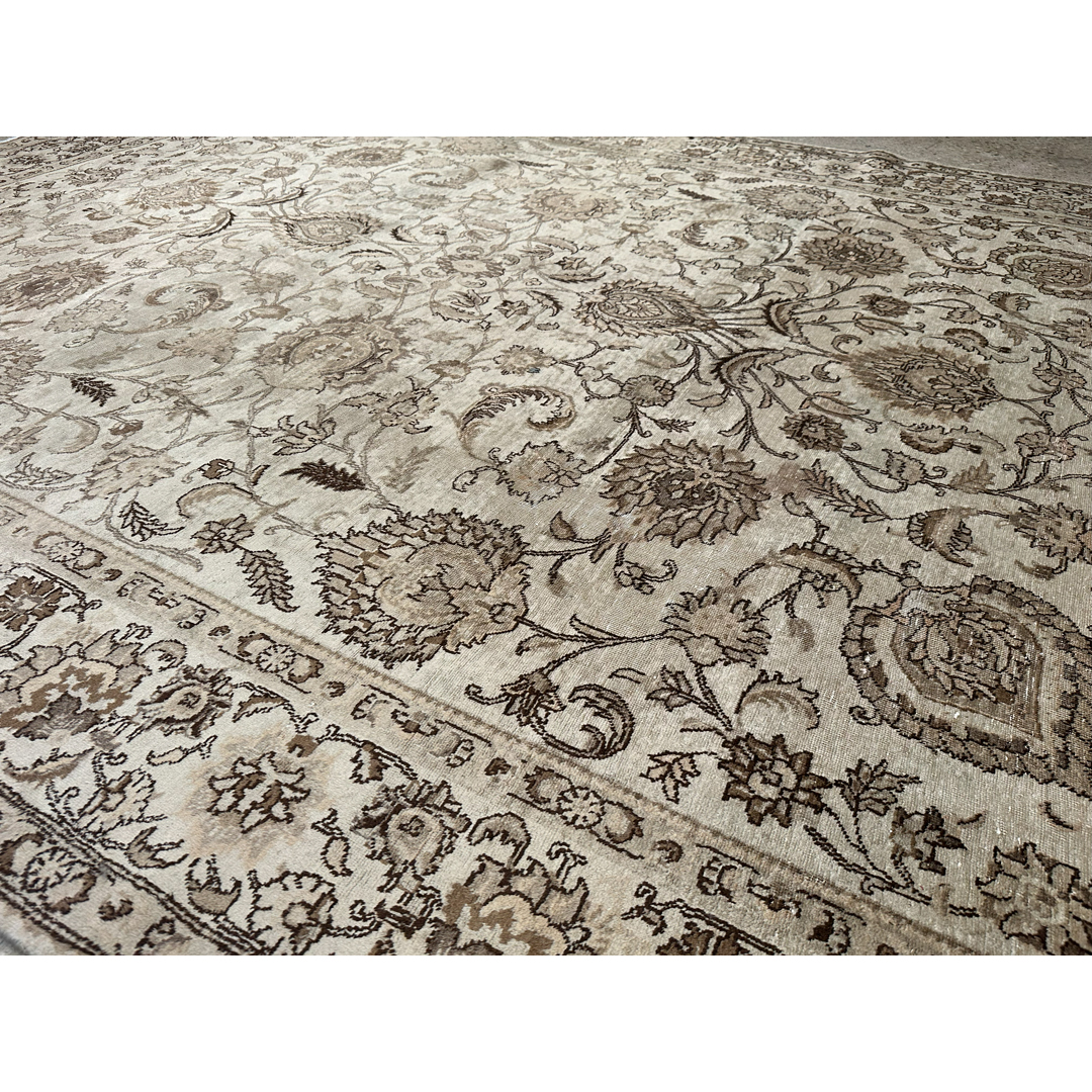 Create a serene sanctuary in your home with the understated elegance of this delightful 9’9″ x 12’9″ ft. vintage Persian Tabriz rug. The hand-knotted pile features a monochromatic palette of soft sandy beige, parchment, and warm taupe, creating a sophisticated neutral foundation that blends seamlessly with any decor. While the original colors have mellowed into a uniform golden hue, the intricate underlying design remains visible, showcasing a graceful arrangement of large-scale floral palmettes, scrolling vines, and delicate arabesques. A matching border filled with a classic floral meander frames the composition, adding subtle structural definition without breaking the calm color story. This piece perfectly captures the modern faded grandeur aesthetic, making it an ideal choice for a minimalist living room, a master bedroom, or a space where texture takes precedence over bold color.