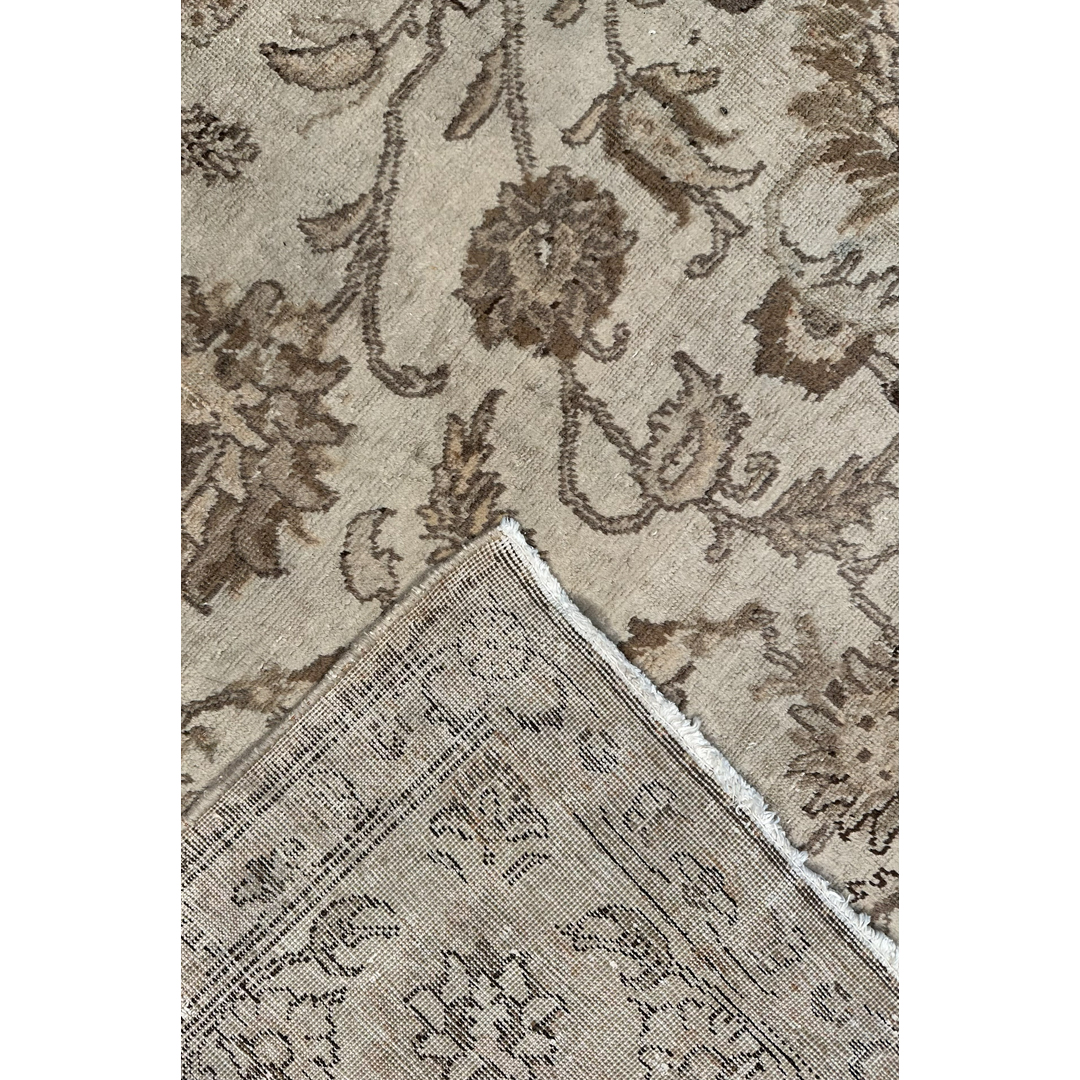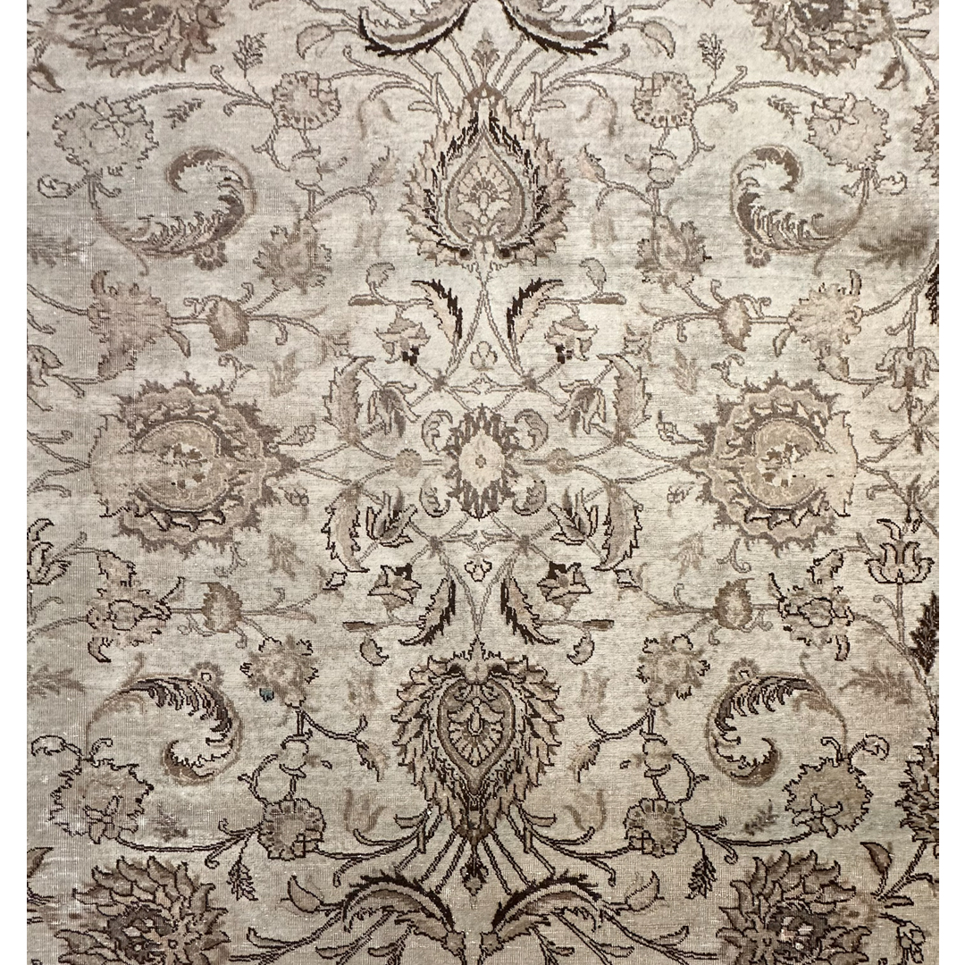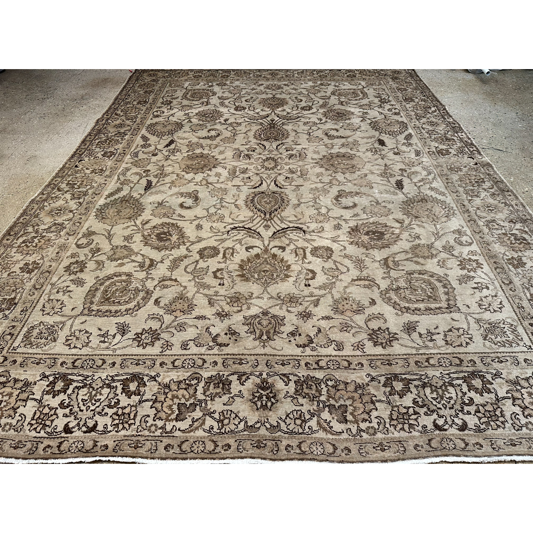 Create a serene sanctuary in your home with the understated elegance of this delightful 9’9″ x 12’9″ ft. vintage Persian Tabriz rug. The hand-knotted pile features a monochromatic palette of soft sandy beige, parchment, and warm taupe, creating a sophisticated neutral foundation that blends seamlessly with any decor. While the original colors have mellowed into a uniform golden hue, the intricate underlying design remains visible, showcasing a graceful arrangement of large-scale floral palmettes, scrolling vines, and delicate arabesques. A matching border filled with a classic floral meander frames the composition, adding subtle structural definition without breaking the calm color story. This piece perfectly captures the modern faded grandeur aesthetic, making it an ideal choice for a minimalist living room, a master bedroom, or a space where texture takes precedence over bold color.