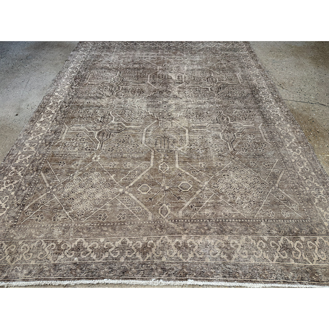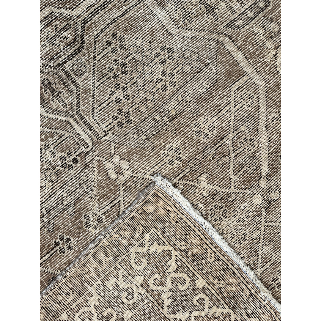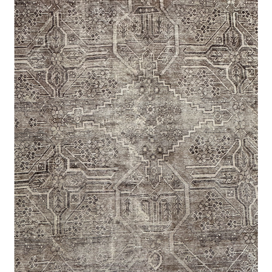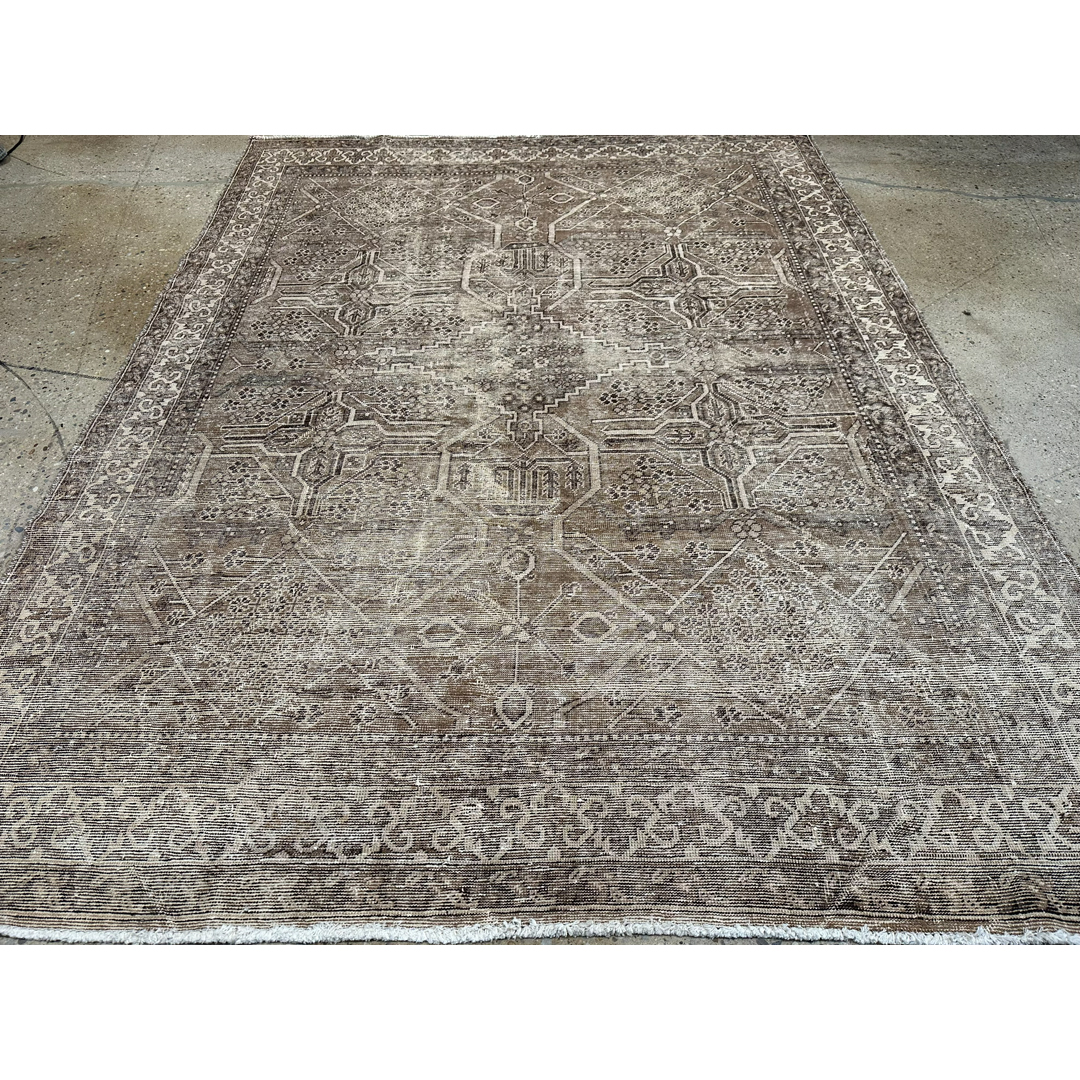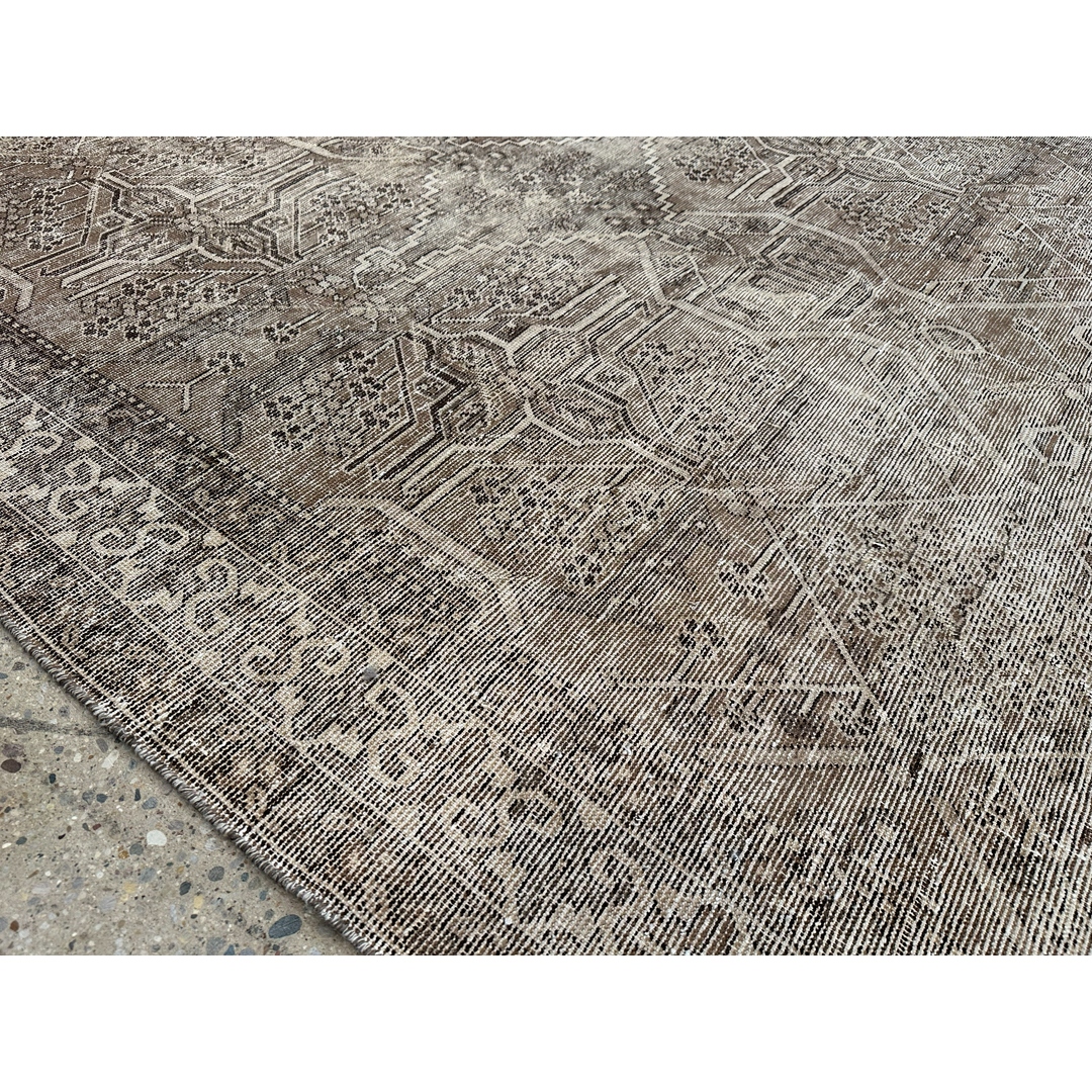 This distressed Persian Tabriz offers a rare blend of classical precision and transitional colors. The design features a grand, complex central medallion and a sprawling network of geometric vines and botanical motifs, all executed with the remarkable clarity that has made Tabriz the gold standard for Persian weaving. What distinguishes this specific antique is its luminous, high-contrast faded aesthetic; the original dyes have been vintage-washed into a sophisticated palette of warm taupe, mushroom, and cream, with ghost-like traces of deeper earth tones. Hand-knotted with an exceptionally fine weave, the rug possesses a low, even pile. This piece is an ideal choice for a curated residence, serving as a historic anchor that bridges the gap between traditional architectural elegance and contemporary, neutral-focused interior design.