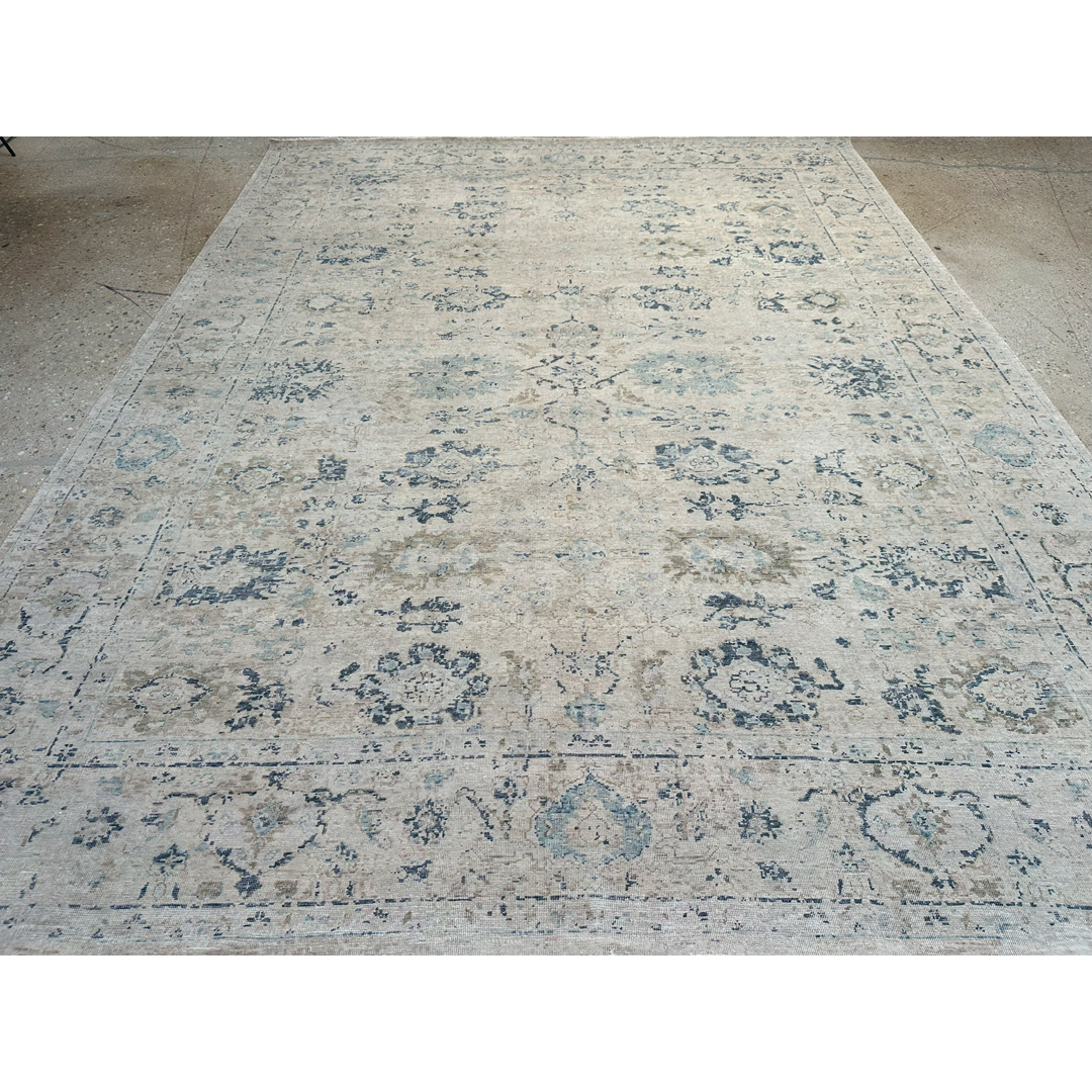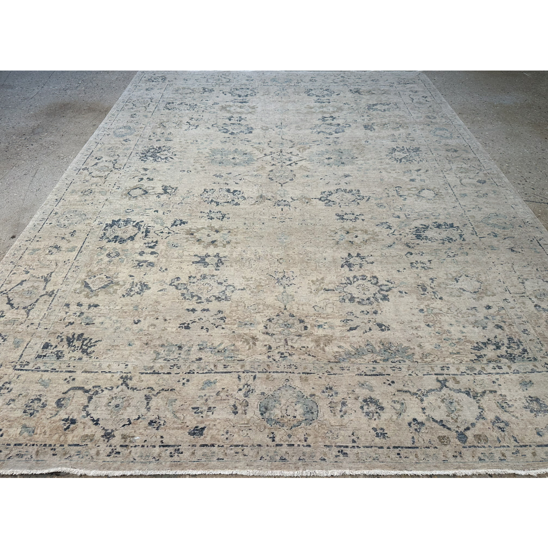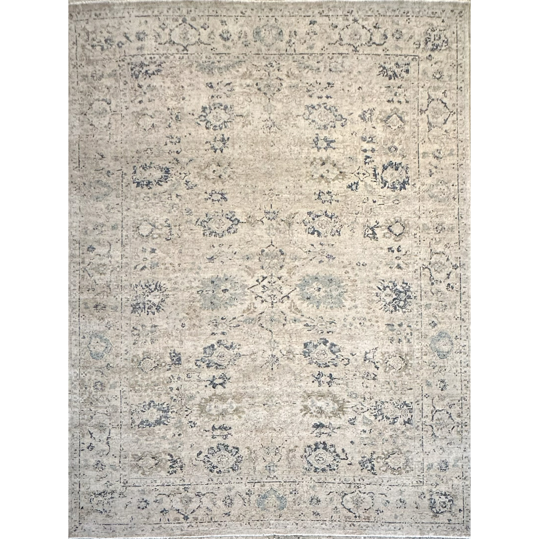 This hand-knotted rug from India is a stunning example of traditional floral motifs being reimagined with a weathered, ethereal beauty. The design features a spacious arrangement of scrolling vines and stylized palmettes that emerge subtly from a luminous, ivory-flecked field. Rendered in a sophisticated palette of slate blue, soft charcoal, and muted taupe, the motifs possess an “erased” quality that feels both antique and decidedly contemporary. Woven with high-quality wool, the rug offers a low, tactile pile with an elegant matte finish. The artful distressing and natural “abrash” create significant tonal movement, ensuring no two square inches are exactly alike. Framed by a delicate, tonal border of repeating rosettes, this 9′ x 12′ ft. rug provides a serene and expansive foundation, making it an ideal choice for a minimalist living room, a high-end master suite, or any transitional space seeking a touch of understated luxury.