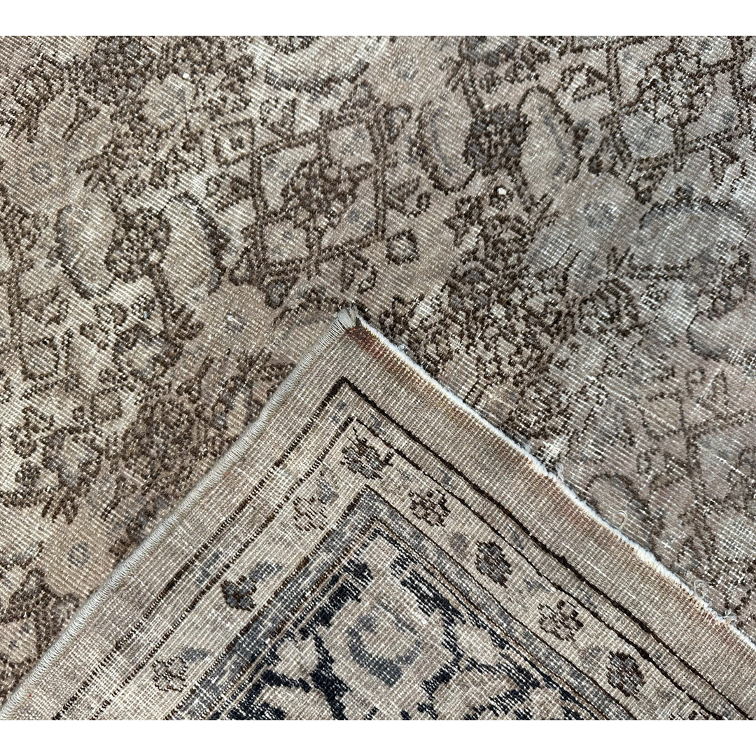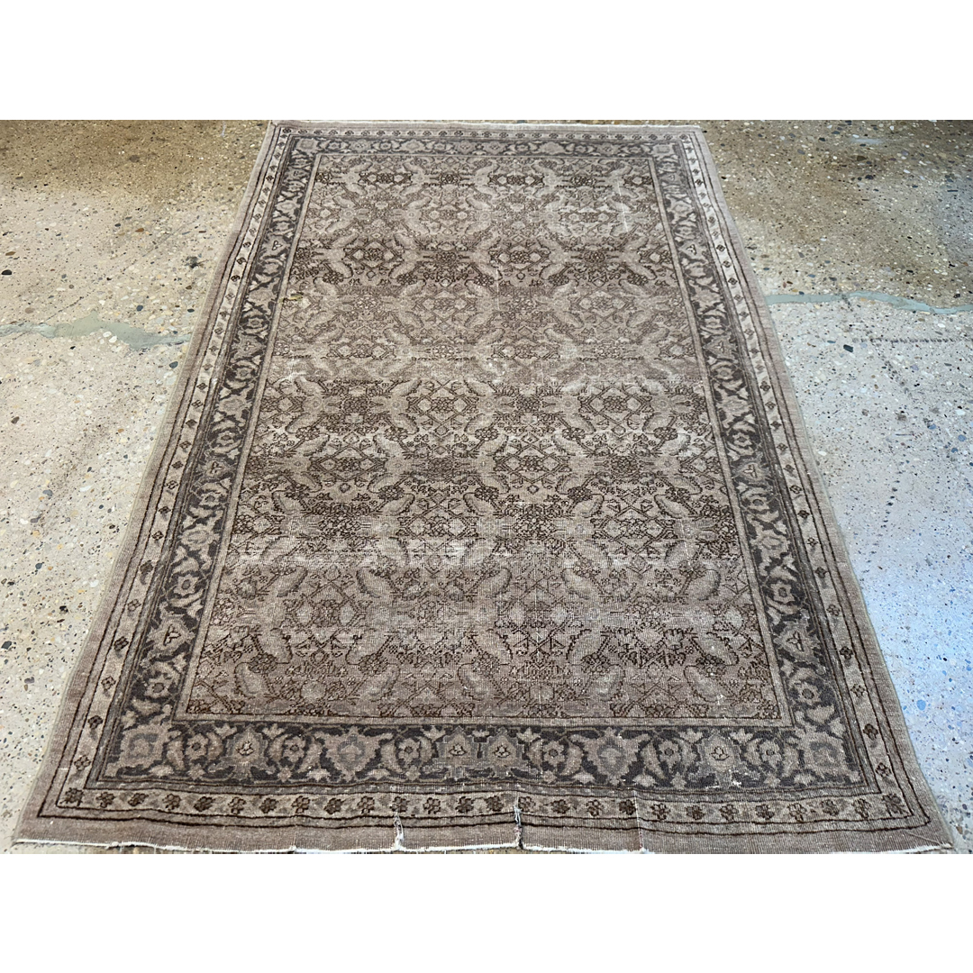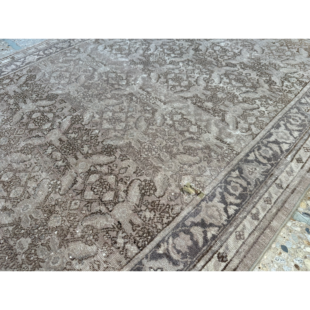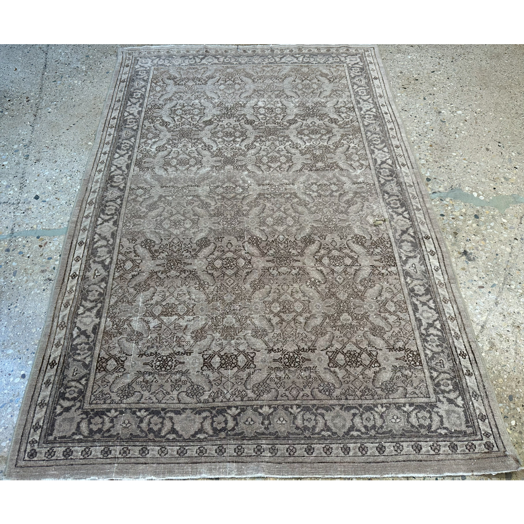 Add a touch of understated sophistication to your home with this handsome 3’10” x 5’7″ ft. vintage, distressed Anatolian Turkish rug. Expertly hand-knotted, this piece features a densely woven all-over Herati pattern, often called the fish design, which creates a mesmerizing lattice of texture across the field. The color palette is a masterclass in neutrality, showcasing a monochromatic blend of earthy taupes, soft browns, and faded greys that give it a distinguished, antique patina. Framed by an intricate border that mirrors the complexity of the center, this durable rug offers a refined and versatile foundation perfect for a study, entryway, or bedside.