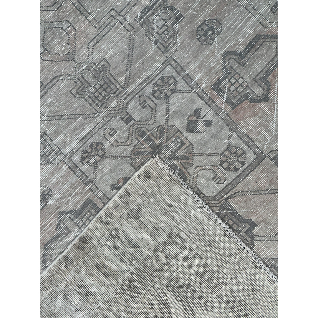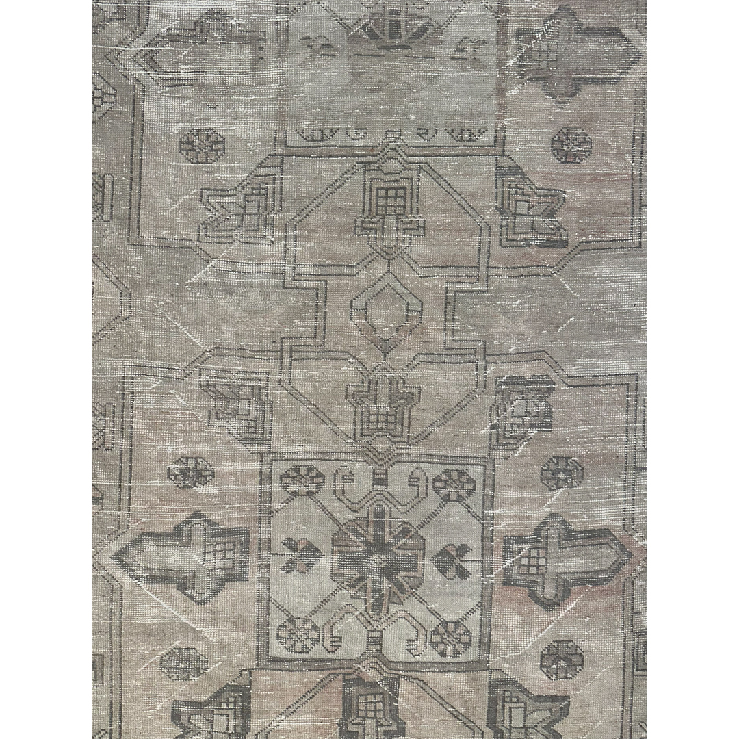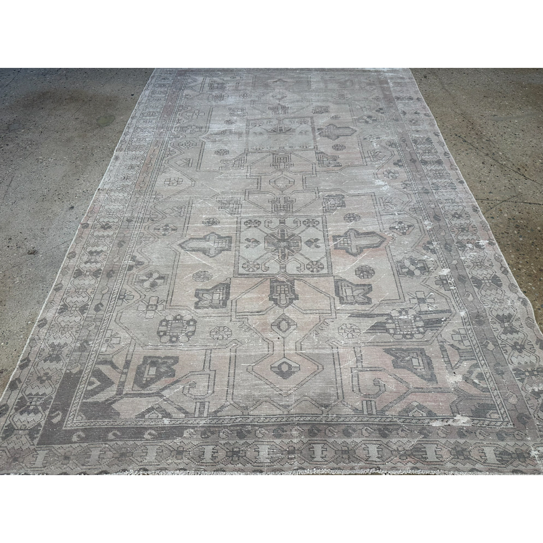 This hand-knotted vintage Hamadan rug from Northwest Persia features a powerful geometric composition, centered by a large, architectural medallion. The field is populated with a rhythmic arrangement of stylized tribal motifs and geometric charms, all rendered in a sophisticated, sun-faded palette of silver-grey, taupe, and muted stone. Faint traces of the original warm copper and rose tones peek through the weathered finish, adding a layer of historical depth and character to the piece.The rug has been artfully distressed and sheared to a low pile, creating a serene, tonal aesthetic that bridges the gap between traditional Persian heritage and modern-minimalist design. Its versatile dimensions and tranquil neutral palette make it an exceptional choice for a contemporary living room, a refined home office, or a bedroom seeking a touch of antique soul.