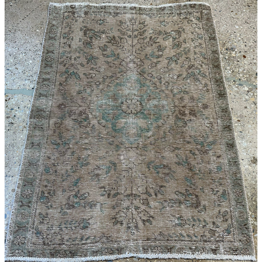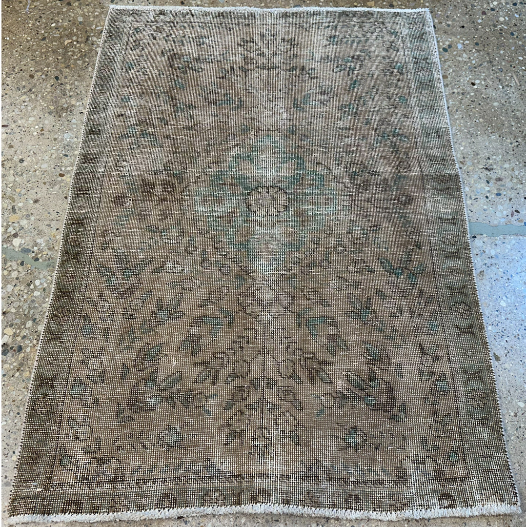 Add a layer of quiet history and rustic charm to your home with this delightfully distressed 3′ x 4’2″ ft. vintage Persian Malayer rug. Hand-knotted and gently weathered by time, this piece features a sophisticated, monochromatic palette of warm taupe, sand, and soft cocoa brown. The original intricate floral pattern has faded into a subtle, ghost-like texture, with only faint whispers of the central medallion and vine motifs remaining visible in muted shades of sage and slate. This low-pile rug offers a relaxed, lived-in aesthetic that pairs beautifully with neutral interiors, making it an ideal accent for a powder room, bedside landing, or cozy reading nook seeking a touch of old-world soul.