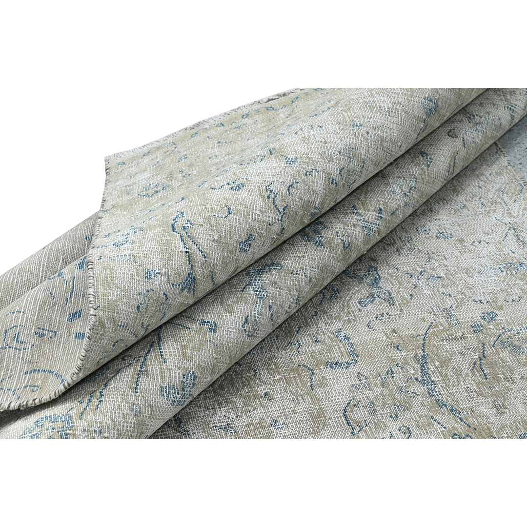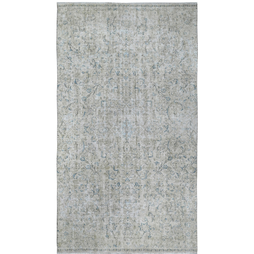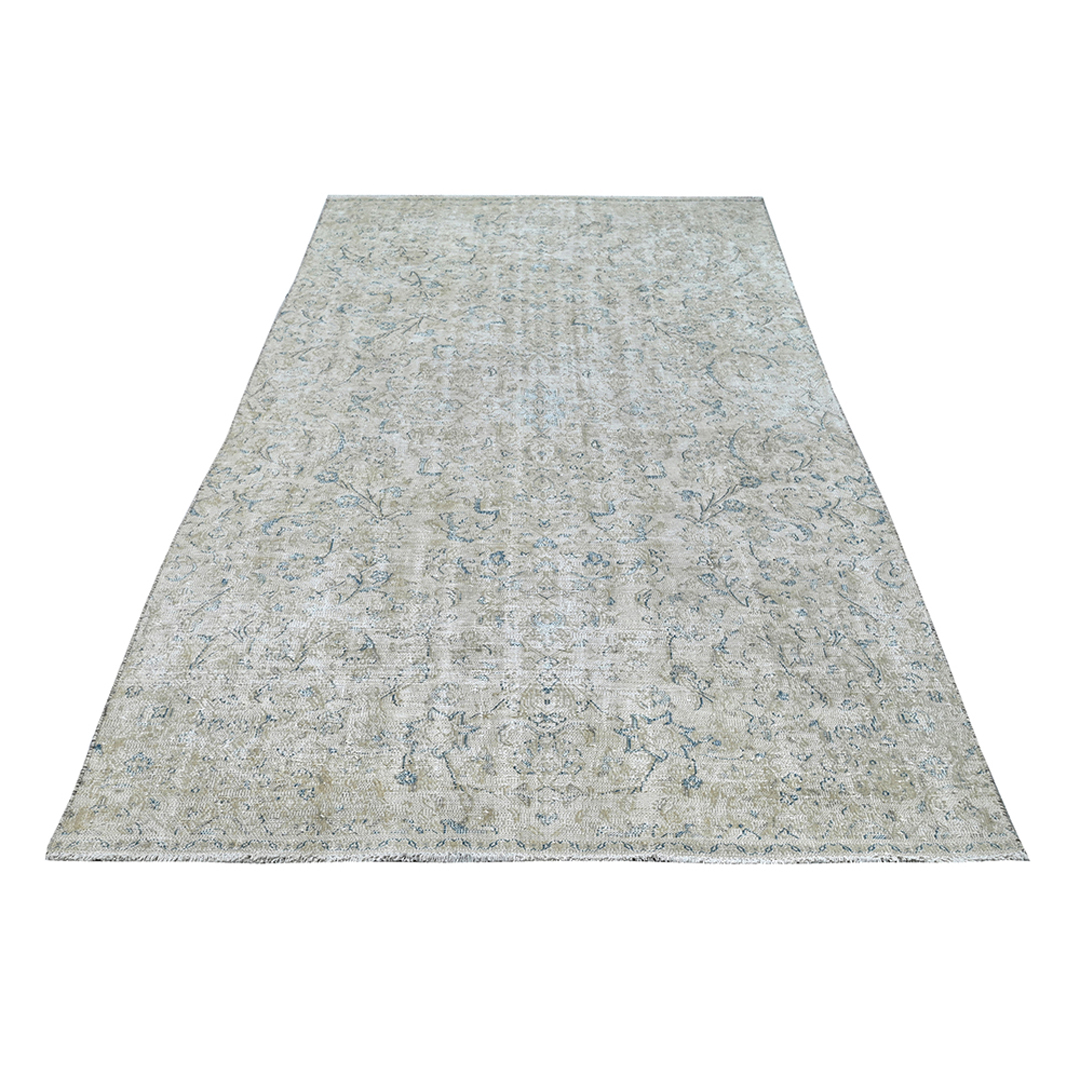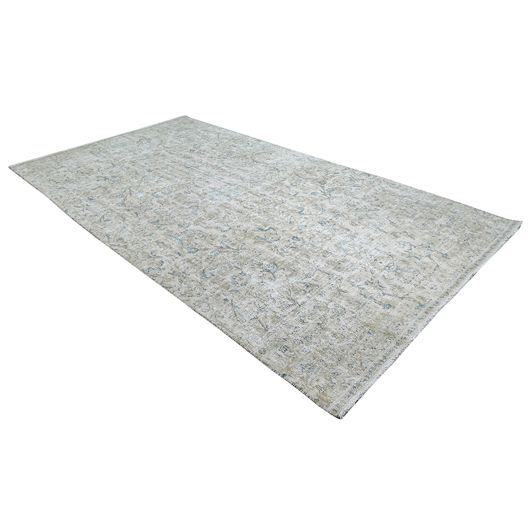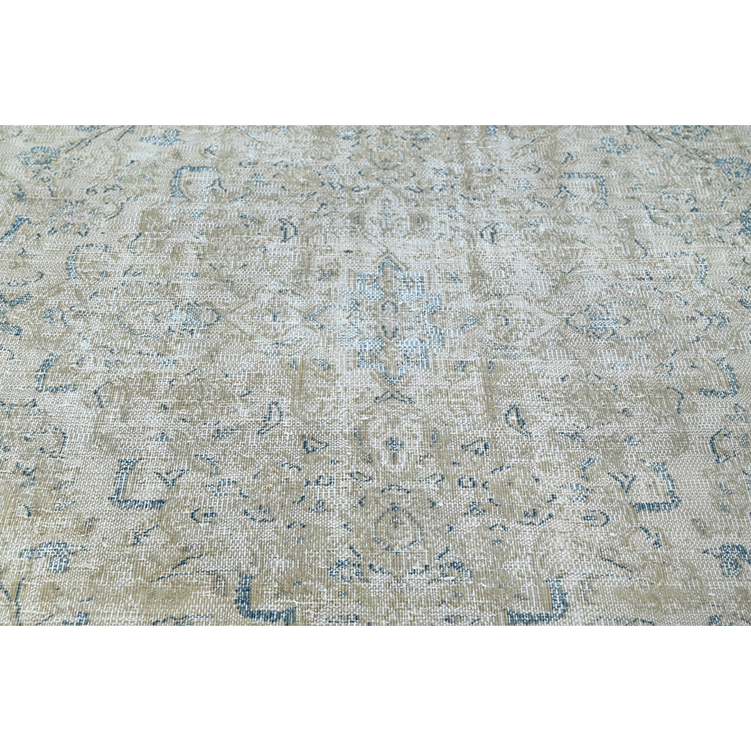 This vintage Persian rug features a traditional floral and medallion composition that has been masterfully distressed in Pakistan. The process softens the original design, resulting in a muted, tonal aesthetic where subtle blue floral patterns emerge from a neutral, weathered field. The heavily faded palette relies on a luminous base of pale grey, warm beige, and soft taupe, accented only by faint, ghostly traces of sweeping floral vines executed in faded sky blue and muted slate. Stripped of its heavy borders and vibrant original dyes, this is a versatile piece that bridges classical artistry with a contemporary, understated look.