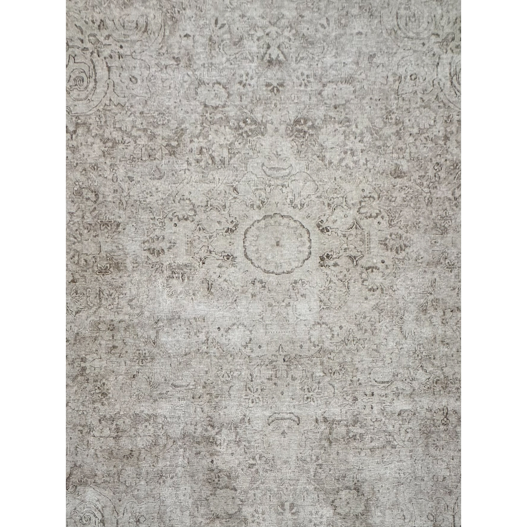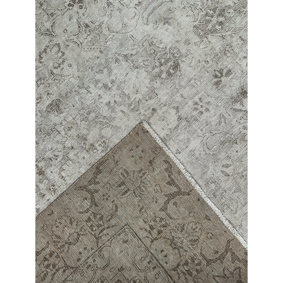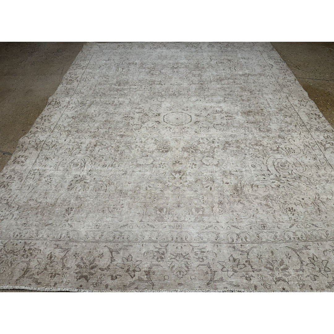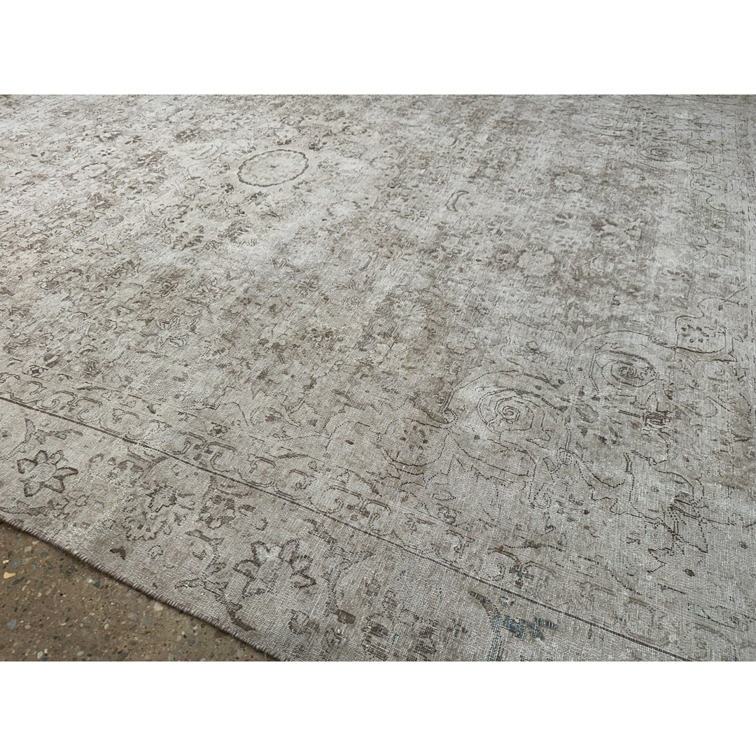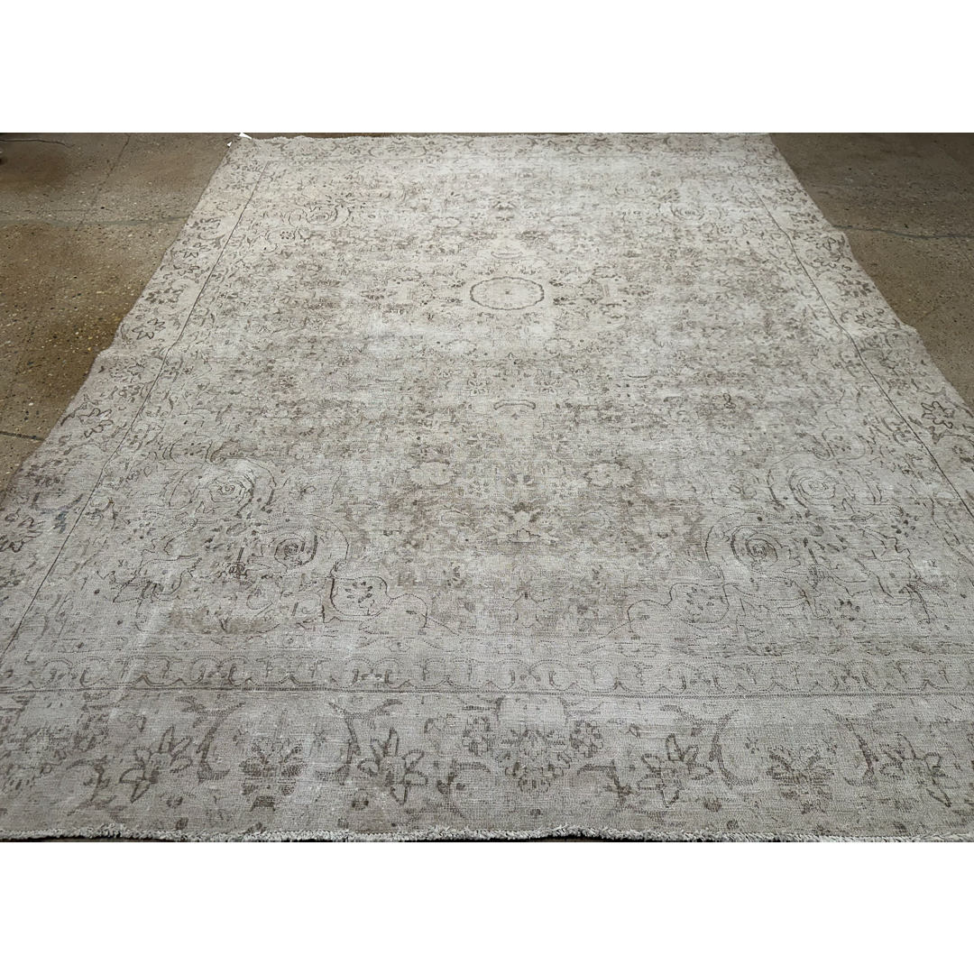 This vintage Persian rug showcases a delicate floral composition that has been artfully transformed through a professional distressing process. The design features a small, circular central medallion surrounded by an expansive field of scrolling vine-work, palmettes, and botanical sprays. Rendered in an understated palette of silver, bone, and soft taupe, the traditional motifs appear as subtle “ghost” patterns beneath a weathered, tonal wash.